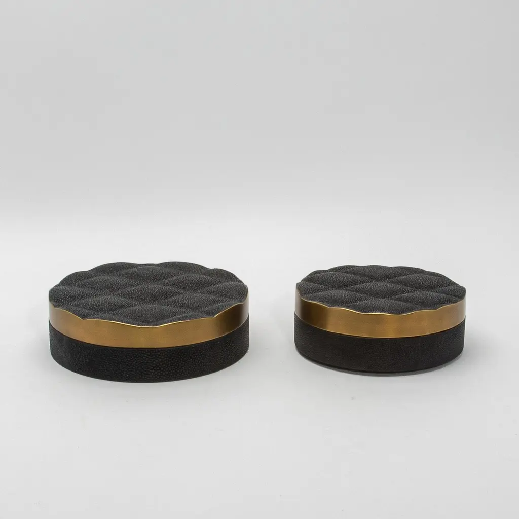 Set Of 2 Quilted Boxes In Black Shagreen With Bronze Patina Brass By Kifu Paris