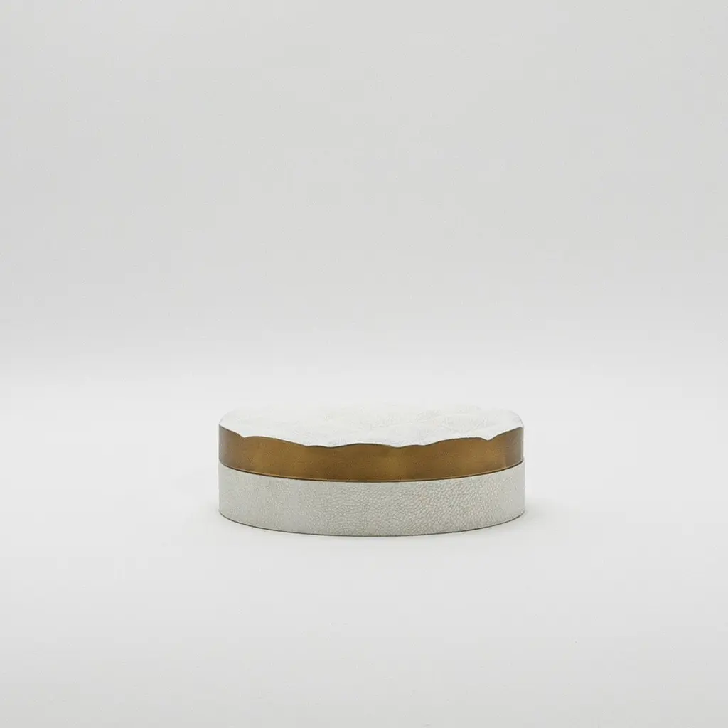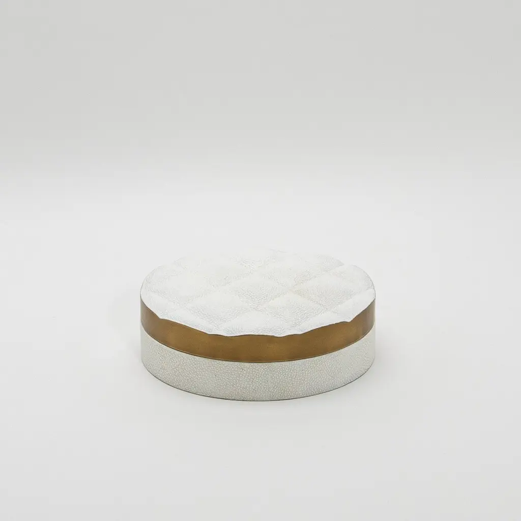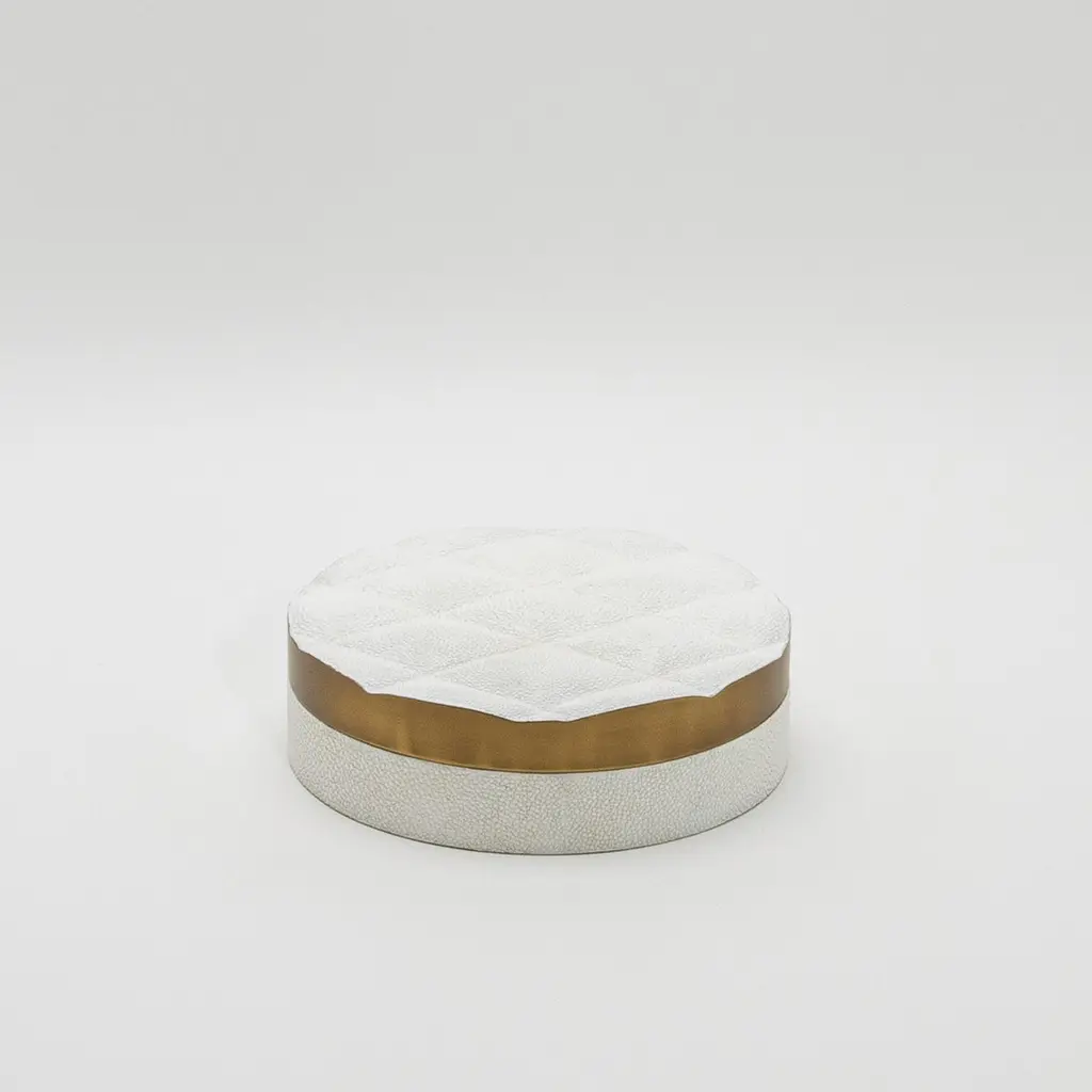 The "Coco" round box in white shagreen with bronze patina brass exudes unparalleled luxury and craftsmanship. Its impeccably quilted shagreen surface is a tactile masterpiece, echoing the elegance of high-fashion couture. The sumptuous texture of the shagreen contrasts beautifully with the rich, warm tones of the hand-applied bronze patina brass that delicately frames the box, creating an exquisite interplay of materials. The organic curves of the box's form are accentuated by the lustrous patina, while the wood interior speaks to timeless sophistication. This artisanal piece transcends functionality, offering an opulent design statement that adds both character and grandeur to any space.MEDIUM: 7.1” DIA x 2.6” LARGE: 8.3” DIA x 2.6” These boxes are available in other finishes.This item is on display in our LA showroomKeep away from direct sunlightColor variants may occur on the stingray and other exotic finishesClean with soft dry clothAbout KIFU PARIS:Kifu Augousti is an up-and-coming creator of modern furnishings, celebrated for her ability to blend the timeless elegance of the Art Deco tradition with a bold, contemporary flair. The daughter of renowned designers Ria and Yiouri Augousti, known as R&Y Augousti, Kifu has inherited a rich legacy while carving out her own distinctive style. Offbeat materials, sinuous curves, and wild patterns have become the hallmarks of her designs, cultivated from her early years in Paris to her current creative haven in Manila.Each piece in Kifu’s collection, whether furniture or accessories, is meticulously handcrafted by the finest artisans in the Philippines. These artisans, known for their unparalleled expertise, use only the best natural materials and apply intricate, hand-painted techniques, ensuring every item is a masterpiece. Available in exclusive showrooms in Paris, New York, and Los Angeles at the Pacific Design Center's MOGUL, her creations—ranging from sculptural benches with commanding bronze frames to exquisitely detailed boxes, trays and vases—are not just furnishings, but timeless treasures that represent the pinnacle of luxury and innovative design.