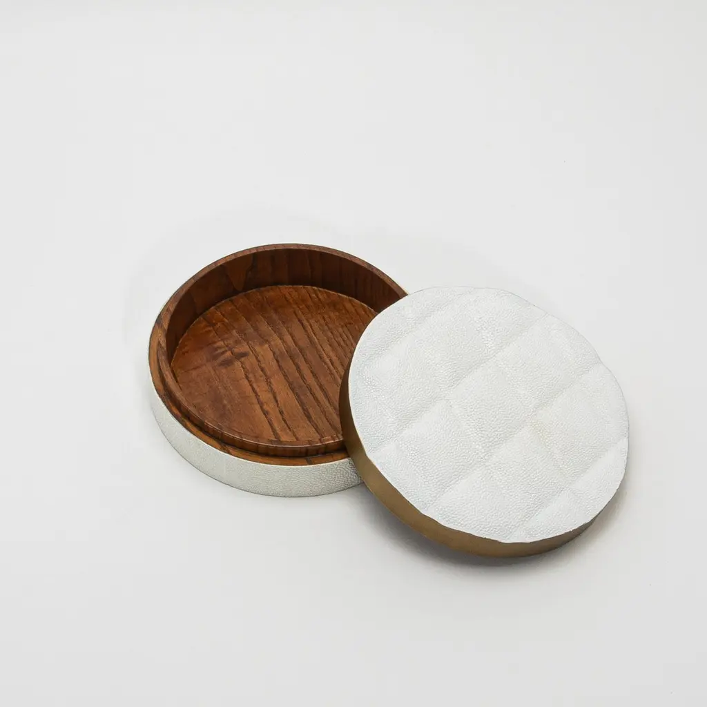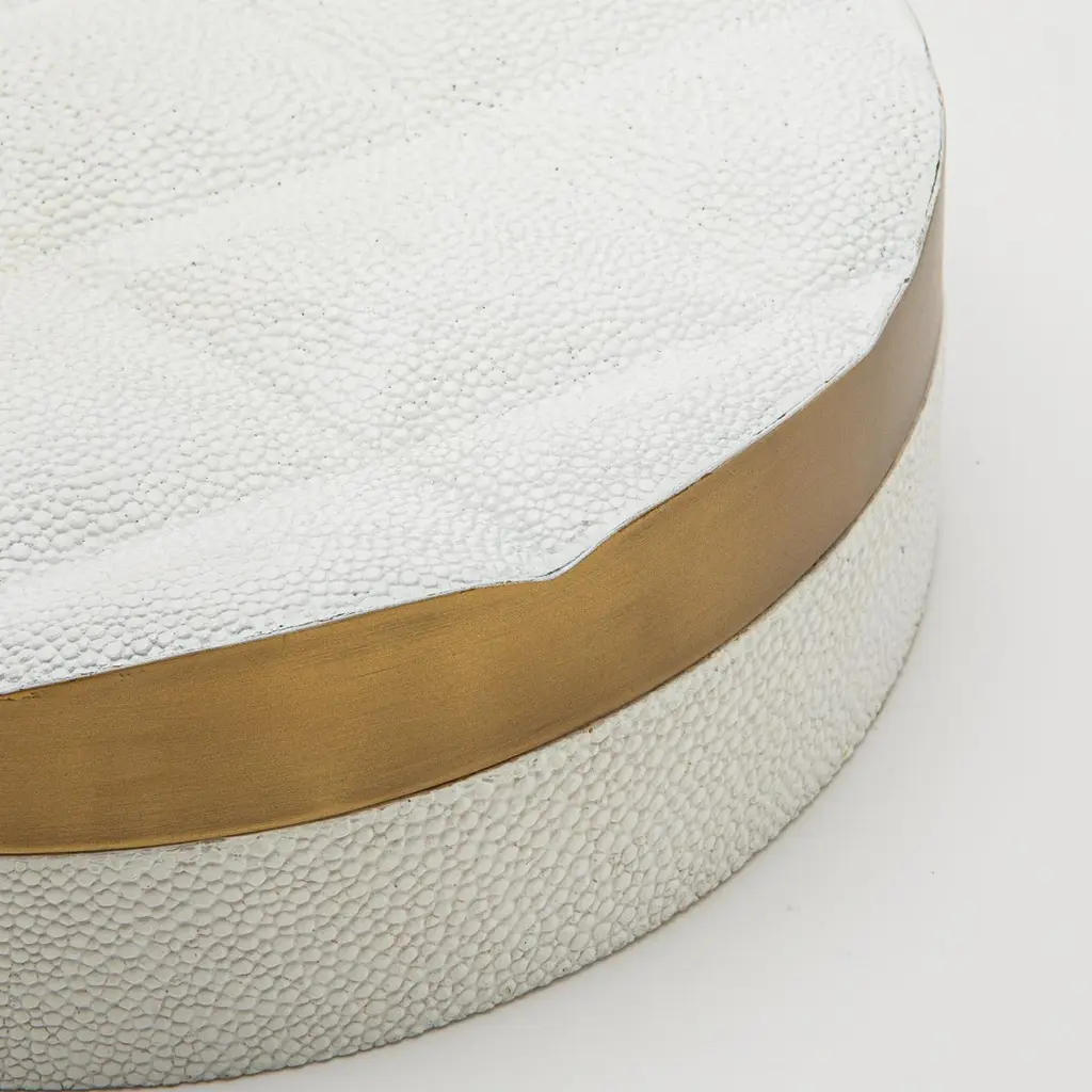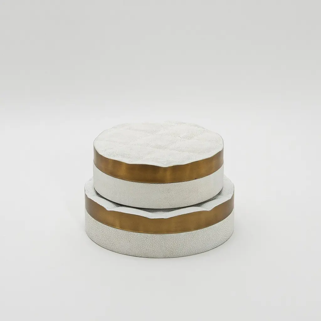 The "Coco" round box in white shagreen with bronze patina brass exudes unparalleled luxury and craftsmanship. Its impeccably quilted shagreen surface is a tactile masterpiece, echoing the elegance of high-fashion couture. The sumptuous texture of the shagreen contrasts beautifully with the rich, warm tones of the hand-applied bronze patina brass that delicately frames the box, creating an exquisite interplay of materials. The organic curves of the box's form are accentuated by the lustrous patina, while the wood interior speaks to timeless sophistication. This artisanal piece transcends functionality, offering an opulent design statement that adds both character and grandeur to any space.MEDIUM: 7.1” DIA x 2.6” LARGE: 8.3” DIA x 2.6” These boxes are available in other finishes.This item is on display in our LA showroomKeep away from direct sunlightColor variants may occur on the stingray and other exotic finishesClean with soft dry clothAbout KIFU PARIS:Kifu Augousti is an up-and-coming creator of modern furnishings, celebrated for her ability to blend the timeless elegance of the Art Deco tradition with a bold, contemporary flair. The daughter of renowned designers Ria and Yiouri Augousti, known as R&Y Augousti, Kifu has inherited a rich legacy while carving out her own distinctive style. Offbeat materials, sinuous curves, and wild patterns have become the hallmarks of her designs, cultivated from her early years in Paris to her current creative haven in Manila.Each piece in Kifu’s collection, whether furniture or accessories, is meticulously handcrafted by the finest artisans in the Philippines. These artisans, known for their unparalleled expertise, use only the best natural materials and apply intricate, hand-painted techniques, ensuring every item is a masterpiece. Available in exclusive showrooms in Paris, New York, and Los Angeles at the Pacific Design Center's MOGUL, her creations—ranging from sculptural benches with commanding bronze frames to exquisitely detailed boxes, trays and vases—are not just furnishings, but timeless treasures that represent the pinnacle of luxury and innovative design.