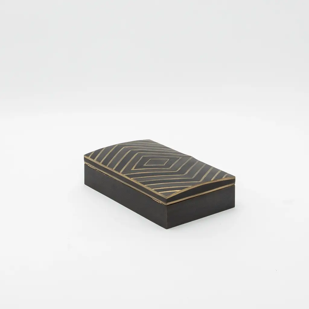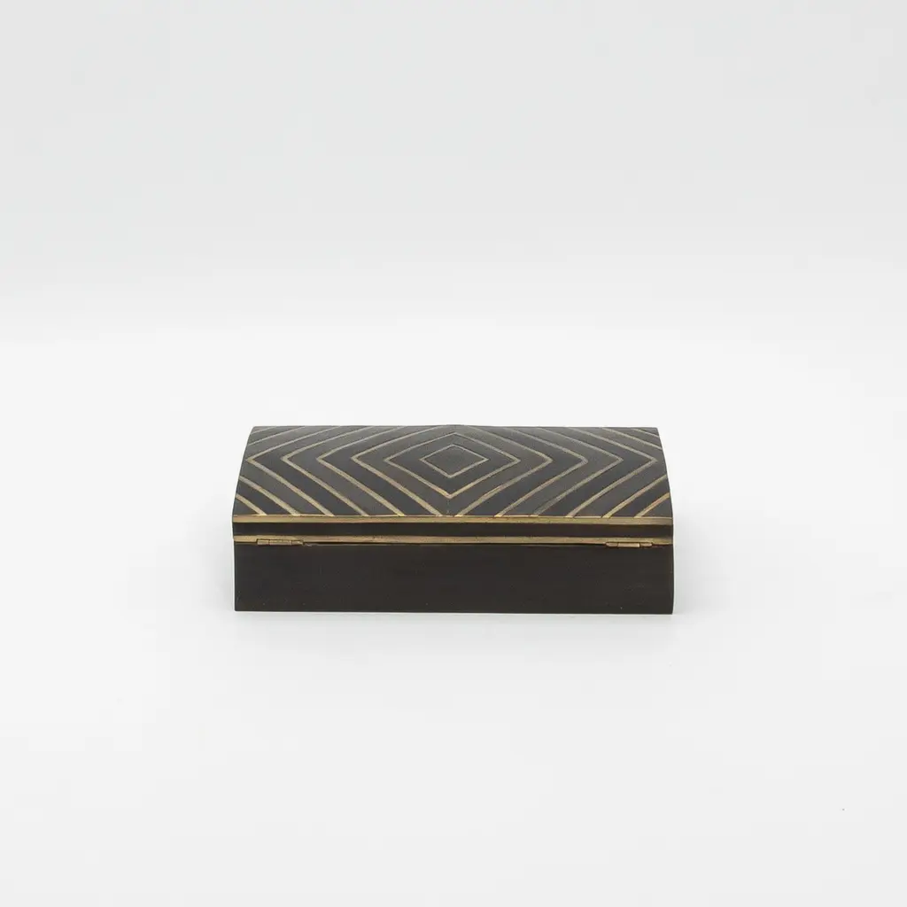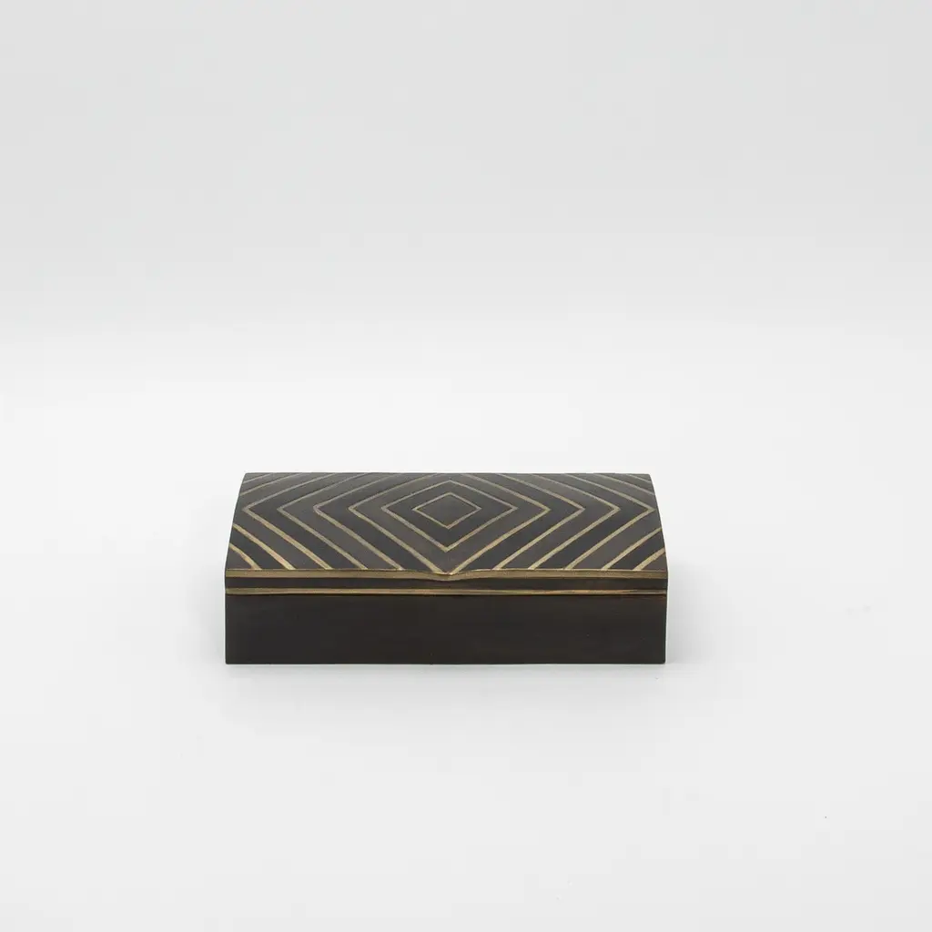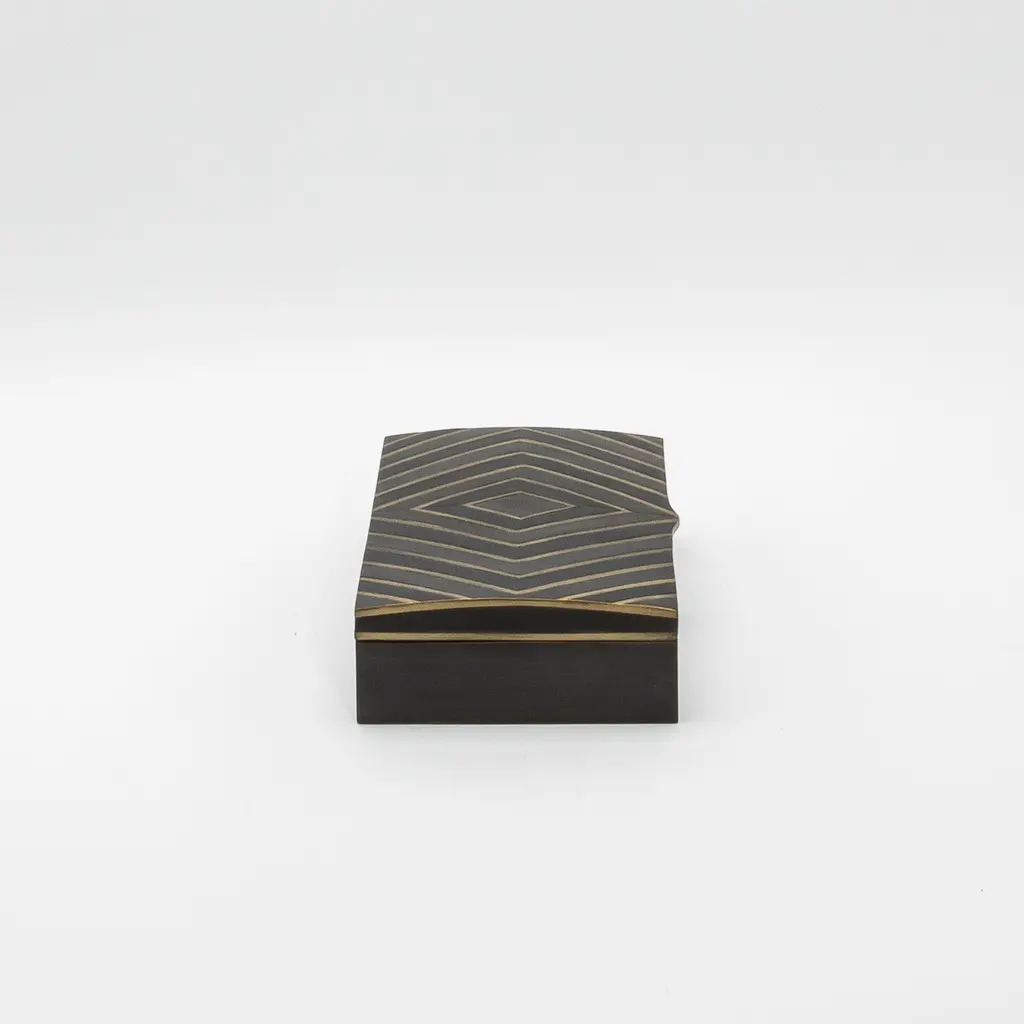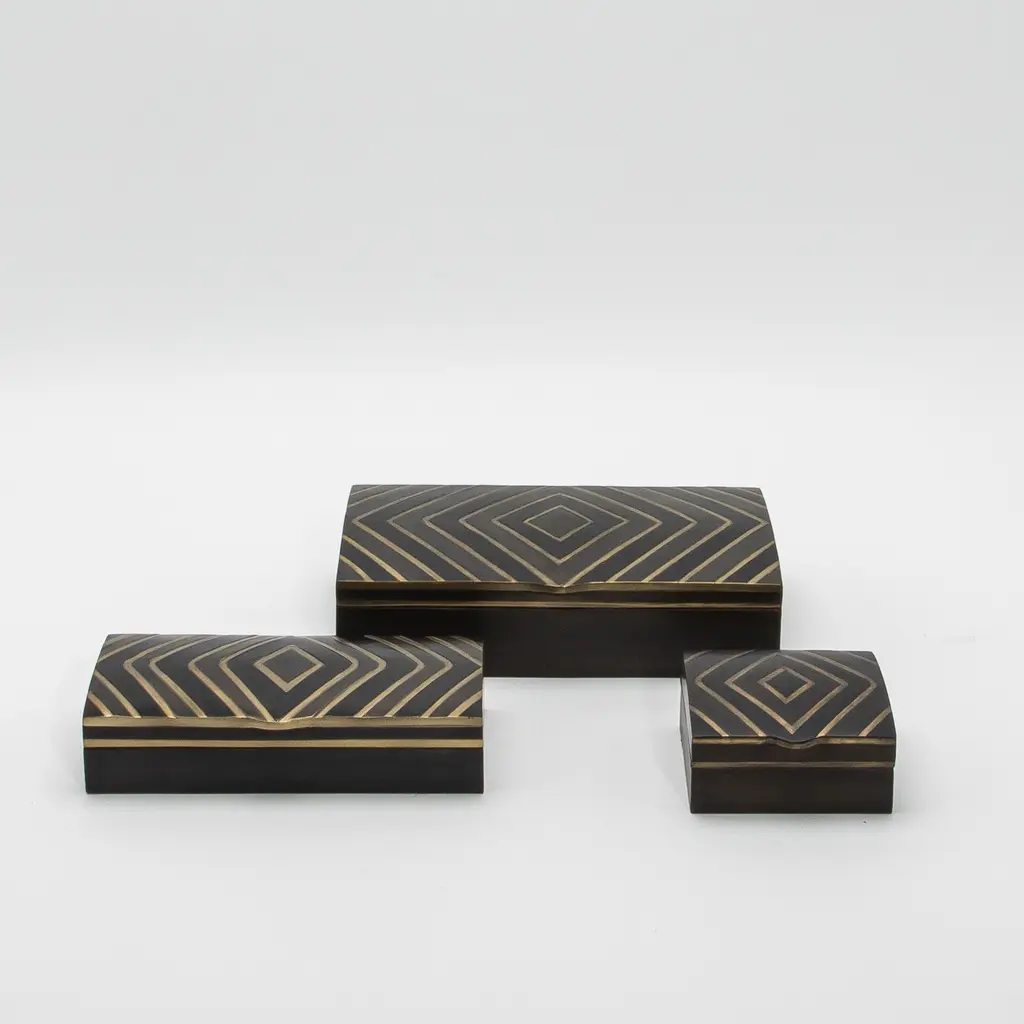This set of 3 boxes by R&Y Augousti is a masterful display of luxury and craftsmanship, combining black oak with intricate brass details. The sleek, geometric zig-zag pattern, meticulously inlaid with bronze patina and dark brass, creates a striking contrast against the rich, deep tones of the oak, showcasing the brand's expertise in blending materials. Each box is handcrafted with impeccable attention to detail, making the set not only functional but also a sophisticated decorative accent. The precision-cut diamond motif on the lid adds a layer of architectural elegance, while the subtle brass sheen exudes warmth and refinement. Perfect for a modern, high-end interior, these boxes exemplify timeless design, offering both utility and a sense of understated luxury that complements any luxurious space. Dimensions: S: 4” x 4” x 2” M: 7.5” x 4” x 2” L: 9.5” x 6” x 2.25”