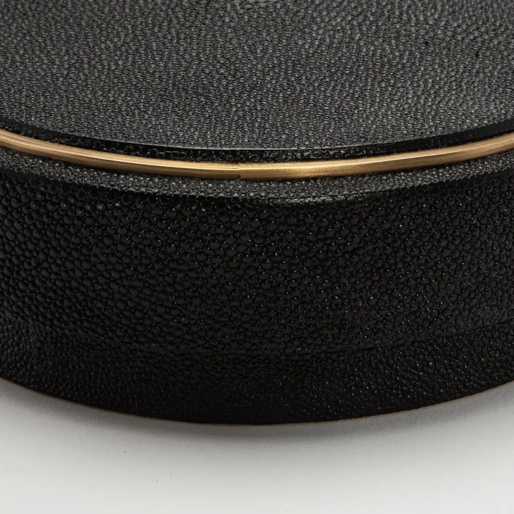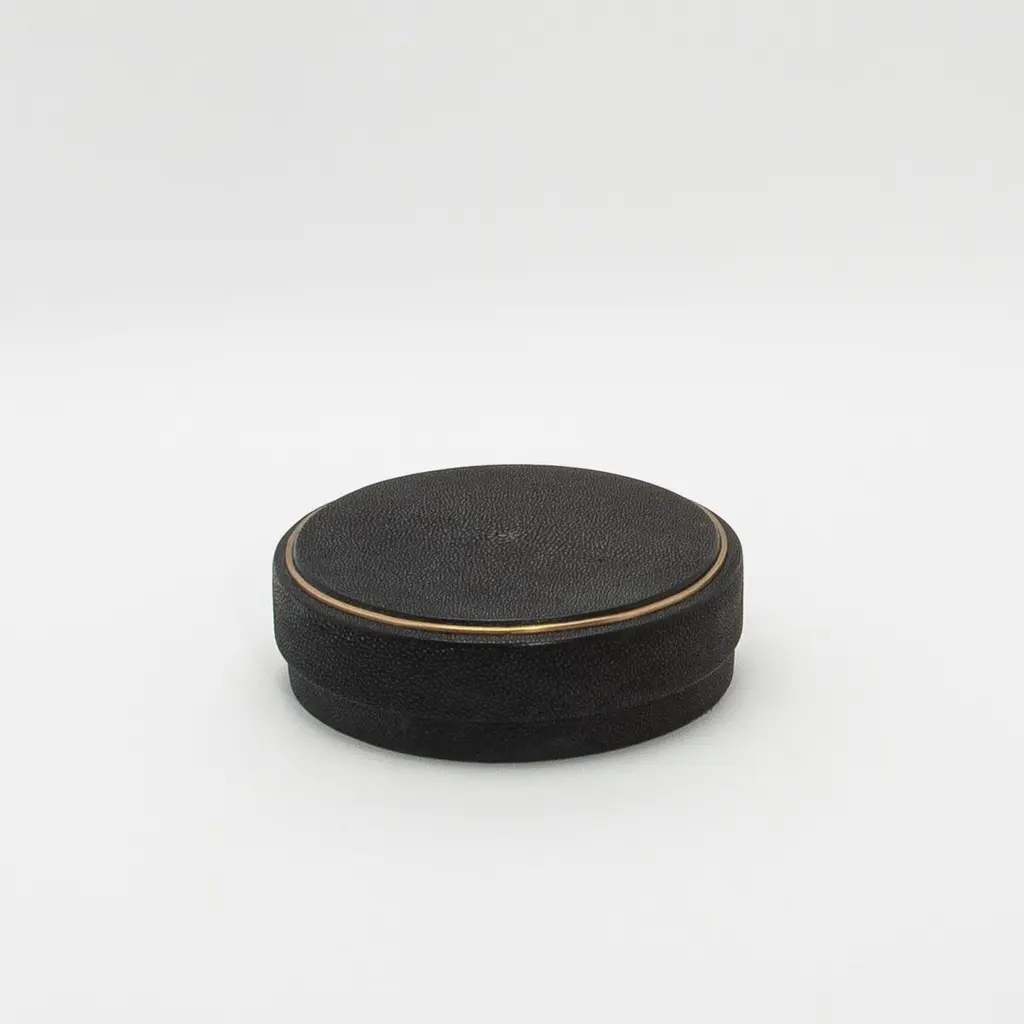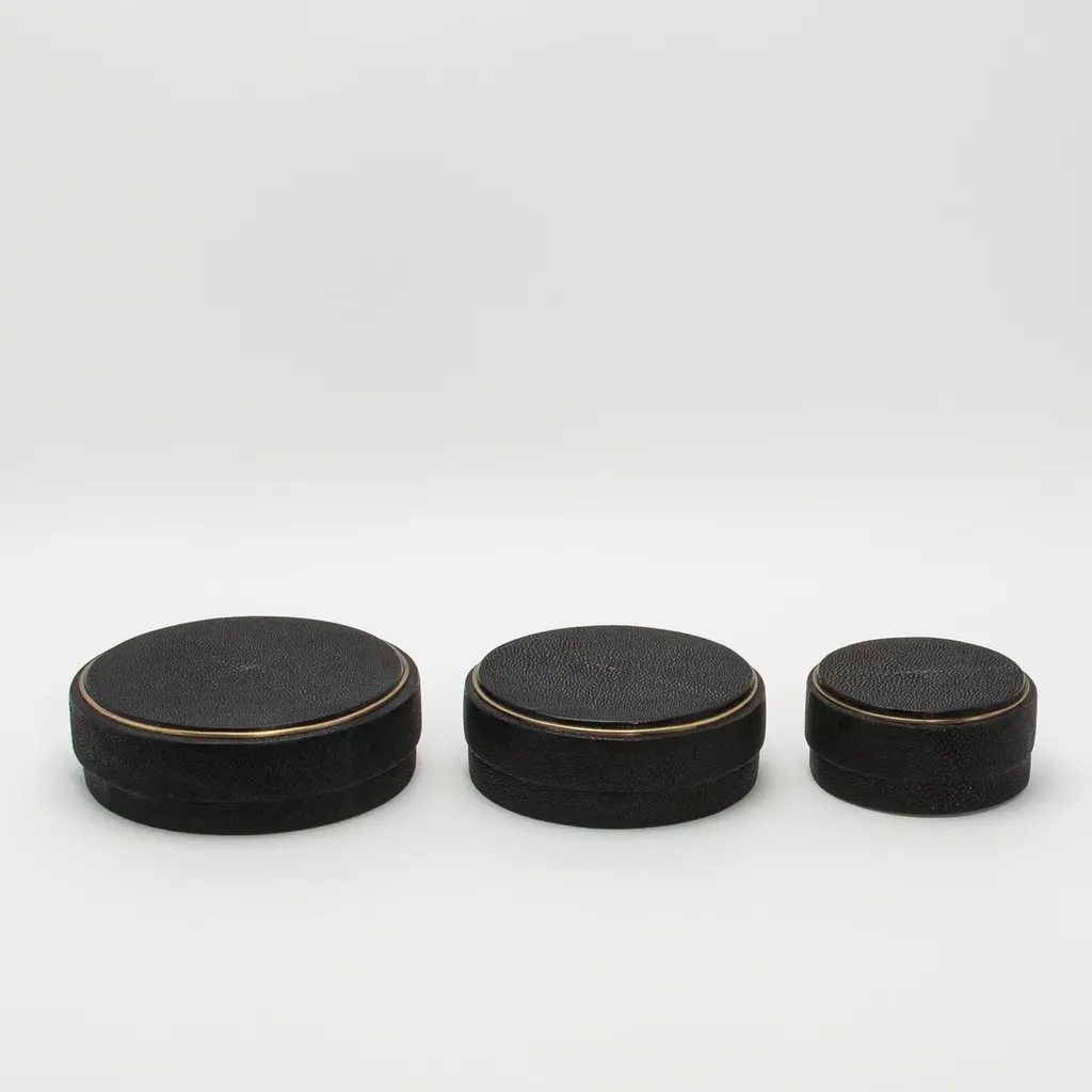 This set of 3 round boxes in black shagreen by R&Y Augousti showcases a design that seamlessly marries form and function. Each box features a perfectly symmetrical circular shape, exuding a modern elegance that draws the eye. The contrast between the elegant black shagreen and the subtle, hand-painted brass rim creates a visual rhythm, highlighting the curved silhouette of the boxes. The clean, unembellished surfaces allow the organic texture of the shagreen to take center stage, while the brass detailing adds a touch of warmth and sophistication. The proportions are thoughtfully balanced, with the height and width complementing the round design, making these boxes not just functional storage pieces but also striking sculptural accents. The minimalist approach, combined with luxurious materials, makes these boxes a sophisticated addition to any space, blending contemporary style with timeless craftsmanship.Large: 8.25” dia x 2.25” Medium: 7” dia x 2.25” Small: 5.5” dia x 2.25” These boxes are available in other finishes.This item is on display in our LA showroomColor variants may occur on the stingray and other exotic finishesClean with soft dry clothAbout R&Y AUGOUSTI:R&Y Augousti, created by the visionary husband-and-wife duo Ria and Yiouri Augousti, epitomizes the pinnacle of luxurious, globally inspired design. Since its inception in Paris in 1989, the brand has become synonymous with opulence, distinguishing itself through the masterful integration of shagreen with brass and other exotic materials. Each piece in their Art Deco-inspired collection is a testament to unparalleled craftsmanship, meticulously handcrafted by the finest artisans in the Philippines, ensuring that every creation is a unique masterpiece.Ria, hailing from Manila, and Yiouri, from Cyprus, share an exquisite passion for revivalist design, which has propelled R&Y Augousti to the forefront of luxury interiors. Their innovative use of materials, particularly the revival of shagreen, has set new standards in elegance and sophistication. The natural color variations on stingray and other exotic finishes further enhance the authenticity and bespoke nature of their designs.Today, R&Y Augousti’s collections grace the most exclusive showrooms in Paris, New York, and Los Angeles at the Pacific Design Center's MOGUL, continuing to redefine the essence of timeless luxury. Their work is not merely furniture; it is a celebration of art, craftsmanship, and the ultimate in refined living.