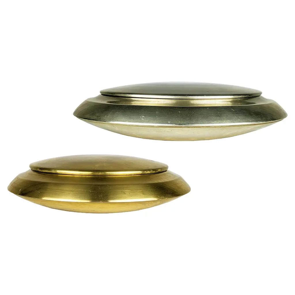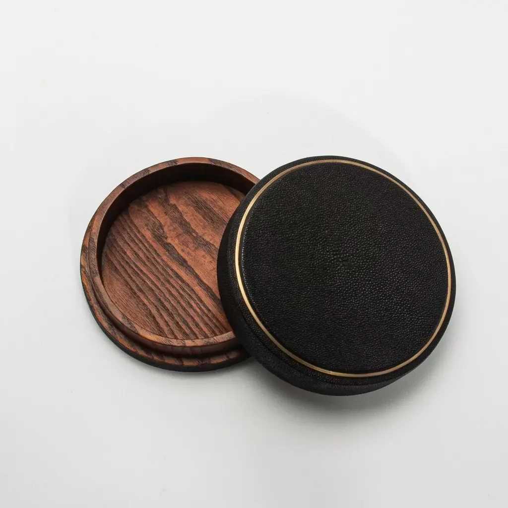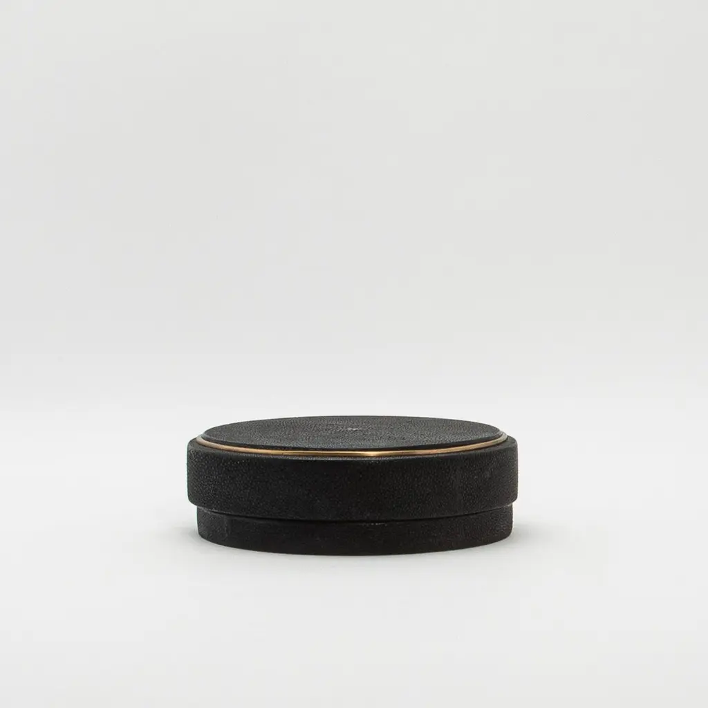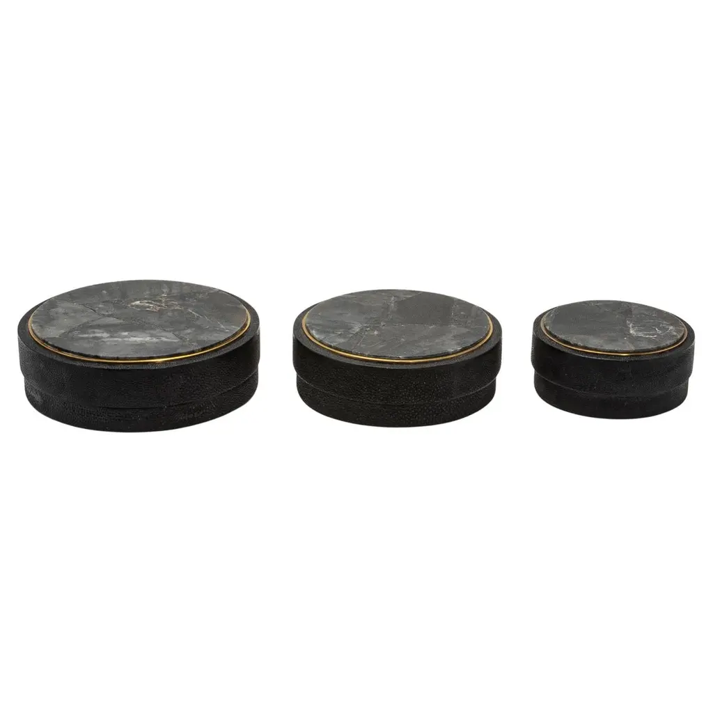 This set of 3 round boxes in black shagreen by R&Y Augousti showcases a design that seamlessly marries form and function. Each box features a perfectly symmetrical circular shape, exuding a modern elegance that draws the eye. The contrast between the elegant black shagreen and the subtle, hand-painted brass rim creates a visual rhythm, highlighting the curved silhouette of the boxes. The clean, unembellished surfaces allow the organic texture of the shagreen to take center stage, while the brass detailing adds a touch of warmth and sophistication. The proportions are thoughtfully balanced, with the height and width complementing the round design, making these boxes not just functional storage pieces but also striking sculptural accents. The minimalist approach, combined with luxurious materials, makes these boxes a sophisticated addition to any space, blending contemporary style with timeless craftsmanship.Large: 8.25” dia x 2.25” Medium: 7” dia x 2.25” Small: 5.5” dia x 2.25” These boxes are available in other finishes.This item is on display in our LA showroomColor variants may occur on the stingray and other exotic finishesClean with soft dry clothAbout R&Y AUGOUSTI:R&Y Augousti, created by the visionary husband-and-wife duo Ria and Yiouri Augousti, epitomizes the pinnacle of luxurious, globally inspired design. Since its inception in Paris in 1989, the brand has become synonymous with opulence, distinguishing itself through the masterful integration of shagreen with brass and other exotic materials. Each piece in their Art Deco-inspired collection is a testament to unparalleled craftsmanship, meticulously handcrafted by the finest artisans in the Philippines, ensuring that every creation is a unique masterpiece.Ria, hailing from Manila, and Yiouri, from Cyprus, share an exquisite passion for revivalist design, which has propelled R&Y Augousti to the forefront of luxury interiors. Their innovative use of materials, particularly the revival of shagreen, has set new standards in elegance and sophistication. The natural color variations on stingray and other exotic finishes further enhance the authenticity and bespoke nature of their designs.Today, R&Y Augousti’s collections grace the most exclusive showrooms in Paris, New York, and Los Angeles at the Pacific Design Center's MOGUL, continuing to redefine the essence of timeless luxury. Their work is not merely furniture; it is a celebration of art, craftsmanship, and the ultimate in refined living.
