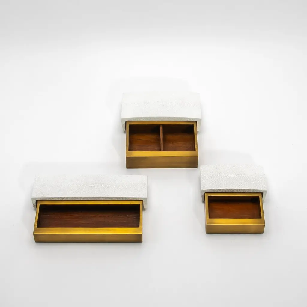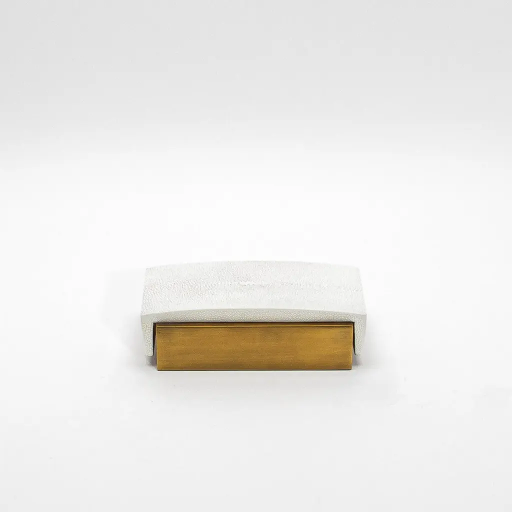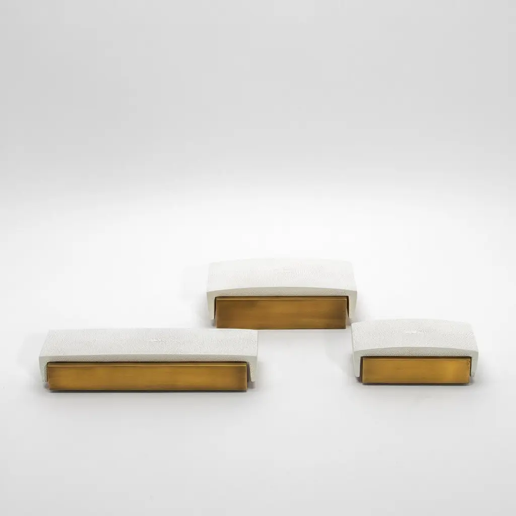 This sleek set of 3 Desk Boxes by R&Y Augousti exemplifies the perfect balance between modern elegance and timeless luxury. Crafted in white shagreen with a curved top, each box is elevated by its brass patina base, offering a bold yet sophisticated aesthetic. The refined curvature of the lid adds a subtle yet distinctive architectural element, while the textured shagreen contrasts beautifully with the smooth bronze patina brass. Meticulously handcrafted, these boxes are designed to elevate any desk or workspace, embodying both function and style in a truly luxurious manner.Large: 7.25 x 4.5 x 2 Medium: 9.25 x 3.5 x 1.5 Small: 5.25 x 3.5 x 1.75 These boxes are available in other finishes.This item is on display in our LA showroomColor variants may occur on the stingray and other exotic finishesClean with soft dry clothAbout R&Y AUGOUSTI:R&Y Augousti, created by the visionary husband-and-wife duo Ria and Yiouri Augousti, epitomizes the pinnacle of luxurious, globally inspired design. Since its inception in Paris in 1989, the brand has become synonymous with opulence, distinguishing itself through the masterful integration of shagreen with brass and other exotic materials. Each piece in their Art Deco-inspired collection is a testament to unparalleled craftsmanship, meticulously handcrafted by the finest artisans in the Philippines, ensuring that every creation is a unique masterpiece.Ria, hailing from Manila, and Yiouri, from Cyprus, share an exquisite passion for revivalist design, which has propelled R&Y Augousti to the forefront of luxury interiors. Their innovative use of materials, particularly the revival of shagreen, has set new standards in elegance and sophistication. The natural color variations on stingray and other exotic finishes further enhance the authenticity and bespoke nature of their designs.Today, R&Y Augousti’s collections grace the most exclusive showrooms in Paris, New York, and Los Angeles at the Pacific Design Center's MOGUL, continuing to redefine the essence of timeless luxury. Their work is not merely furniture; it is a celebration of art, craftsmanship, and the ultimate in refined living.