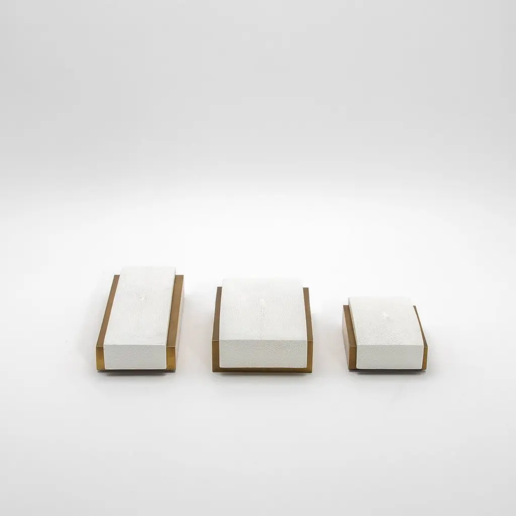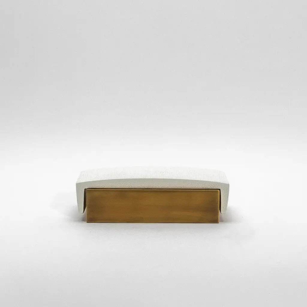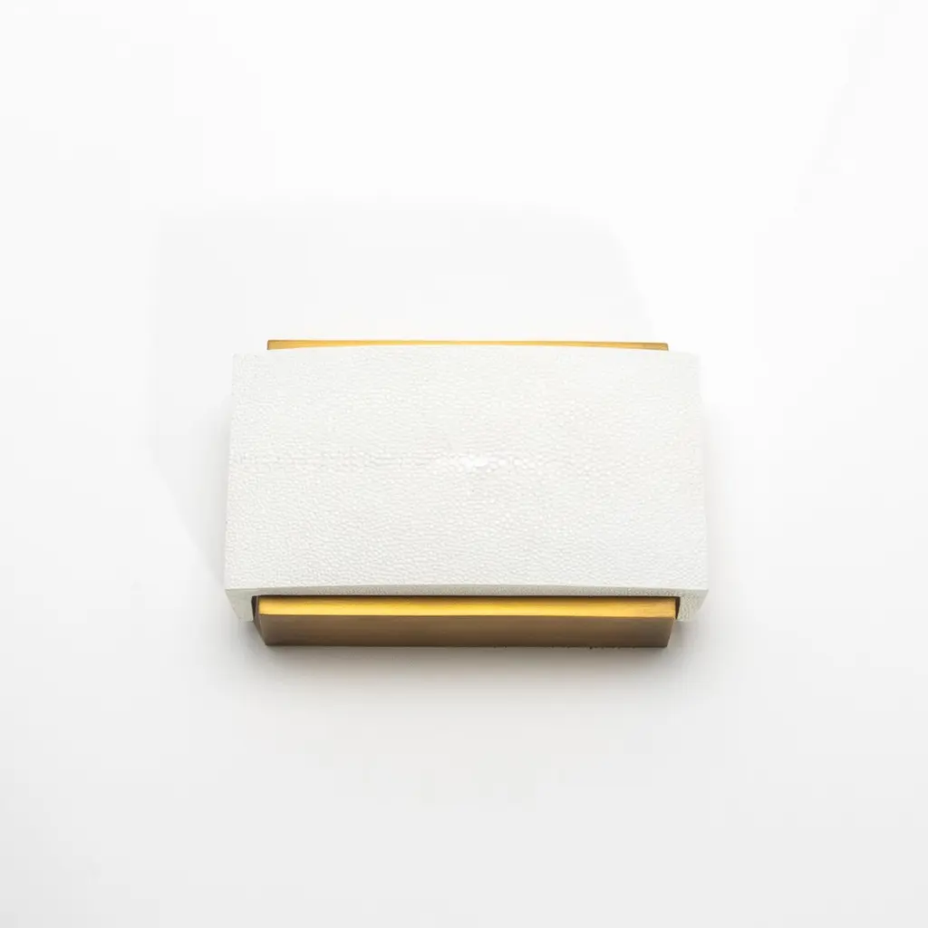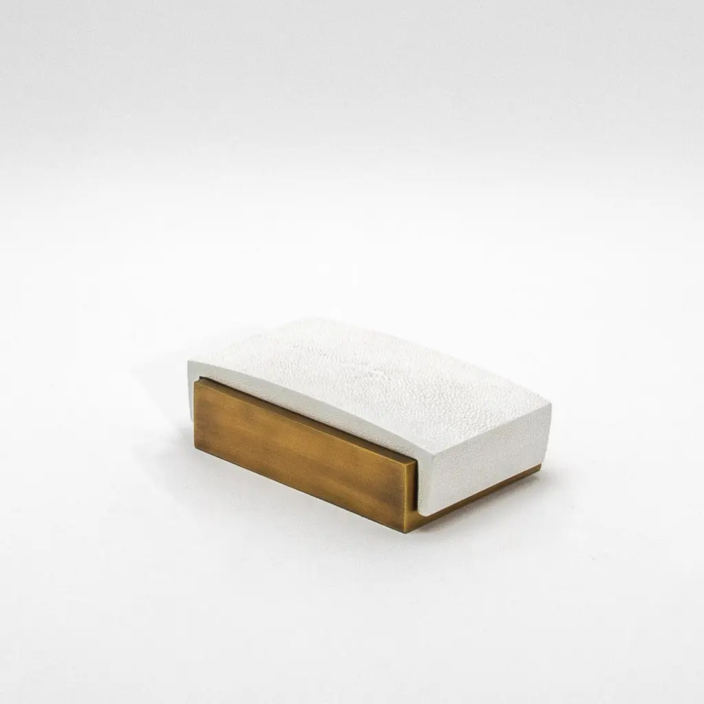 This sleek set of 3 Desk Boxes by R&Y Augousti exemplifies the perfect balance between modern elegance and timeless luxury. Crafted in white shagreen with a curved top, each box is elevated by its brass patina base, offering a bold yet sophisticated aesthetic. The refined curvature of the lid adds a subtle yet distinctive architectural element, while the textured shagreen contrasts beautifully with the smooth bronze patina brass. Meticulously handcrafted, these boxes are designed to elevate any desk or workspace, embodying both function and style in a truly luxurious manner.Large: 7.25 x 4.5 x 2 Medium: 9.25 x 3.5 x 1.5 Small: 5.25 x 3.5 x 1.75 These boxes are available in other finishes.This item is on display in our LA showroomColor variants may occur on the stingray and other exotic finishesClean with soft dry clothAbout R&Y AUGOUSTI:R&Y Augousti, created by the visionary husband-and-wife duo Ria and Yiouri Augousti, epitomizes the pinnacle of luxurious, globally inspired design. Since its inception in Paris in 1989, the brand has become synonymous with opulence, distinguishing itself through the masterful integration of shagreen with brass and other exotic materials. Each piece in their Art Deco-inspired collection is a testament to unparalleled craftsmanship, meticulously handcrafted by the finest artisans in the Philippines, ensuring that every creation is a unique masterpiece.Ria, hailing from Manila, and Yiouri, from Cyprus, share an exquisite passion for revivalist design, which has propelled R&Y Augousti to the forefront of luxury interiors. Their innovative use of materials, particularly the revival of shagreen, has set new standards in elegance and sophistication. The natural color variations on stingray and other exotic finishes further enhance the authenticity and bespoke nature of their designs.Today, R&Y Augousti’s collections grace the most exclusive showrooms in Paris, New York, and Los Angeles at the Pacific Design Center's MOGUL, continuing to redefine the essence of timeless luxury. Their work is not merely furniture; it is a celebration of art, craftsmanship, and the ultimate in refined living.