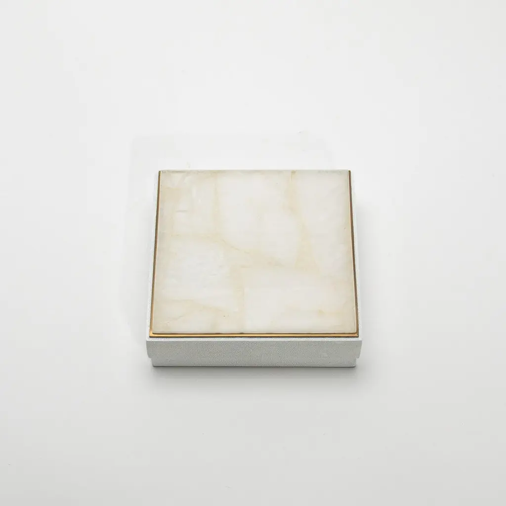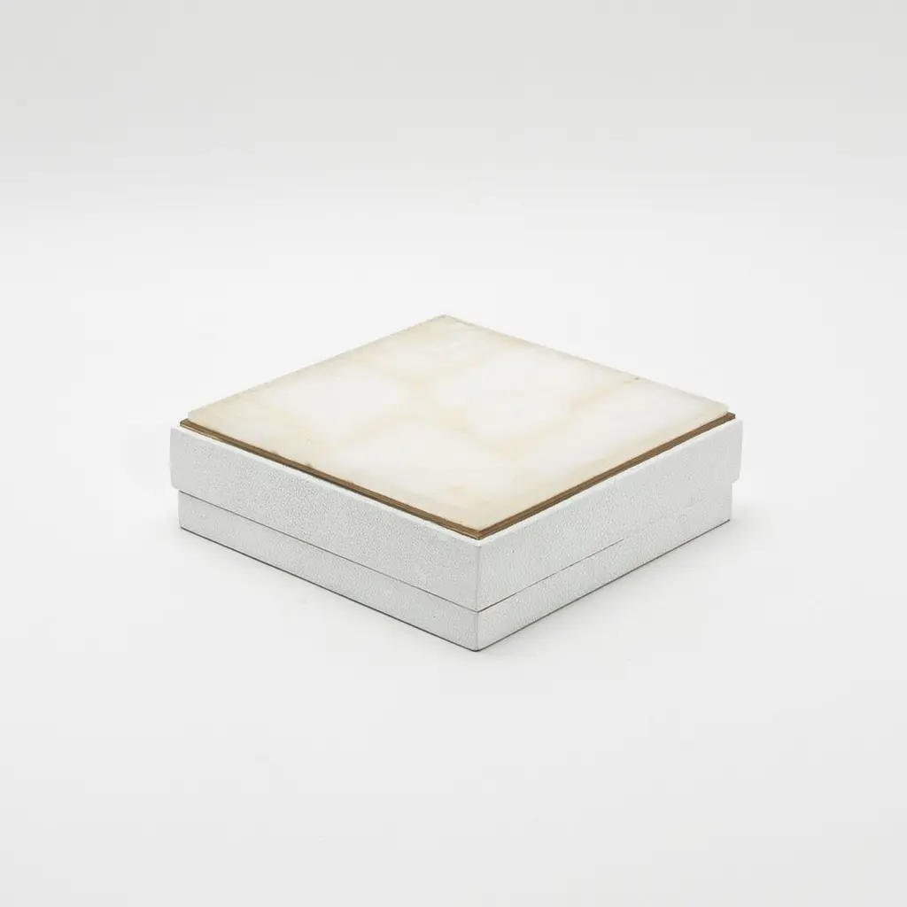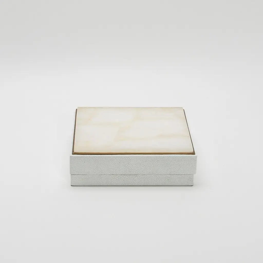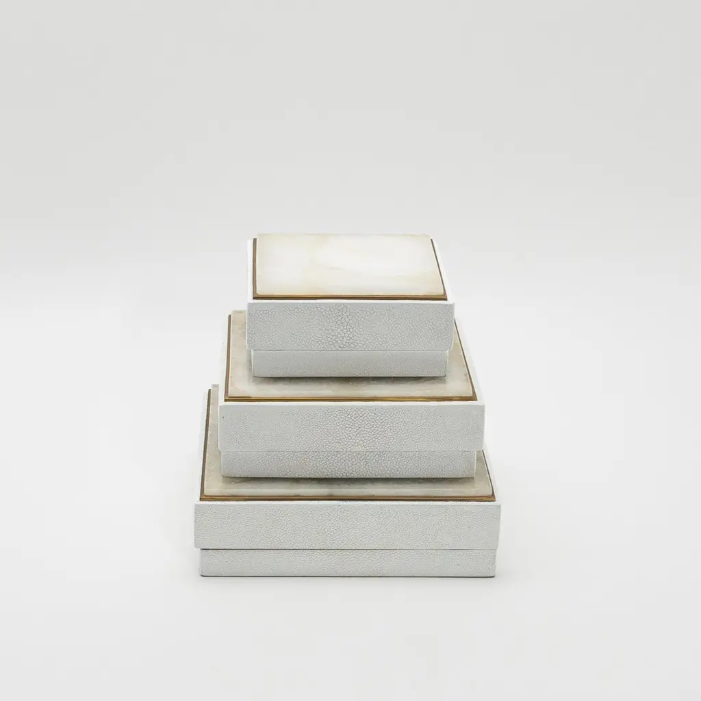This set of three square boxes by R&Y Augousti is a stunning example of refined design, where the interplay of materials creates a captivating visual contrast. The textured white shagreen forms the body of each box, its natural grain providing a tactile quality, while the sleek white quartz tops introduce an element of sophistication, with their subtle veining and natural luster. The edges are framed in hand-painted bronze patina brass, which adds a warm accent, highlighting the luxurious materials used. Each detail, from the precision of the quartz inlay to the soft gleam of the brass, showcases R&Y Augousti's mastery in blending organic textures with polished finishes, creating a timeless, elegant piece.SMALL: 5.5” x 5.5” x 2.5”MEDIUM: 7” x 7” x 2.5” LARGE: 8” x 8” x 2.5” These boxes are available in other finishes.This item is on display in our LA showroomColor variants may occur on the stingray and other exotic finishesClean with soft dry clothAbout R&Y AUGOUSTI:R&Y Augousti, created by the visionary husband-and-wife duo Ria and Yiouri Augousti, epitomizes the pinnacle of luxurious, globally inspired design. Since its inception in Paris in 1989, the brand has become synonymous with opulence, distinguishing itself through the masterful integration of shagreen with brass and other exotic materials. Each piece in their Art Deco-inspired collection is a testament to unparalleled craftsmanship, meticulously handcrafted by the finest artisans in the Philippines, ensuring that every creation is a unique masterpiece.Ria, hailing from Manila, and Yiouri, from Cyprus, share an exquisite passion for revivalist design, which has propelled R&Y Augousti to the forefront of luxury interiors. Their innovative use of materials, particularly the revival of shagreen, has set new standards in elegance and sophistication. The natural color variations on stingray and other exotic finishes further enhance the authenticity and bespoke nature of their designs.Today, R&Y Augousti’s collections grace the most exclusive showrooms in Paris, New York, and Los Angeles at the Pacific Design Center's MOGUL, continuing to redefine the essence of timeless luxury. Their work is not merely furniture; it is a celebration of art, craftsmanship, and the ultimate in refined living.