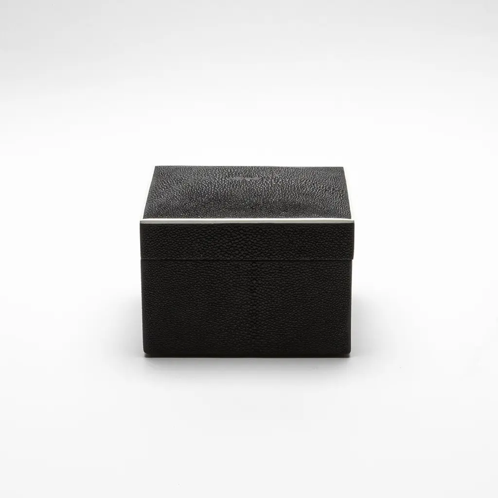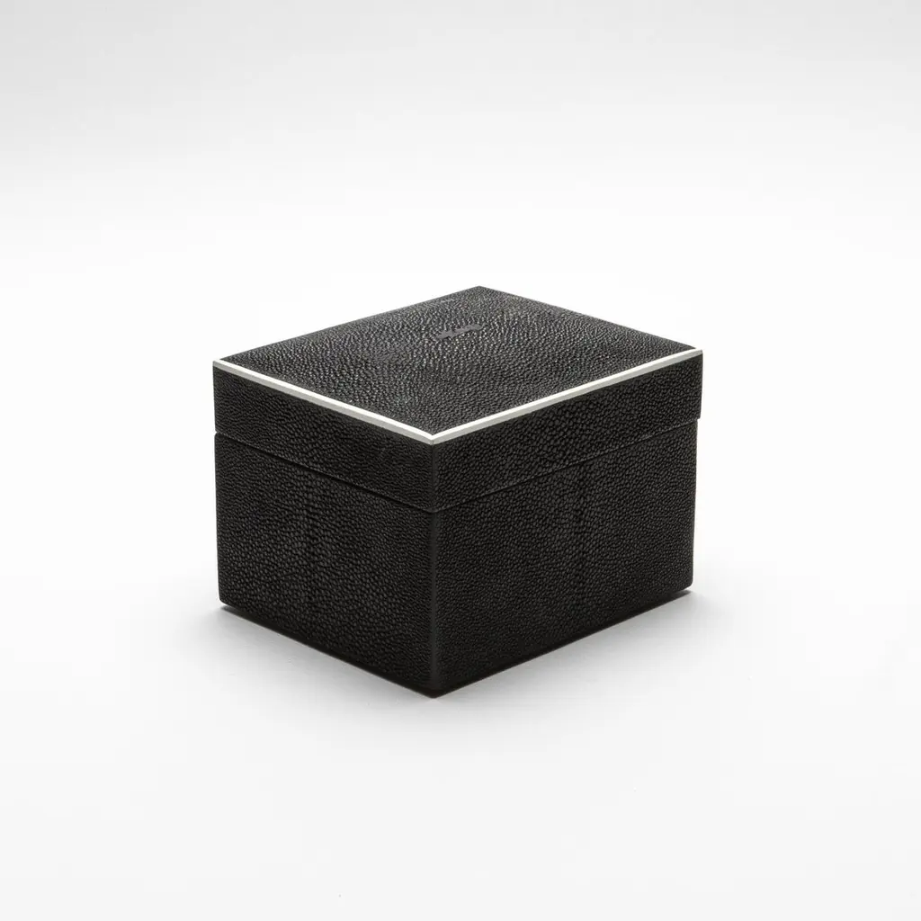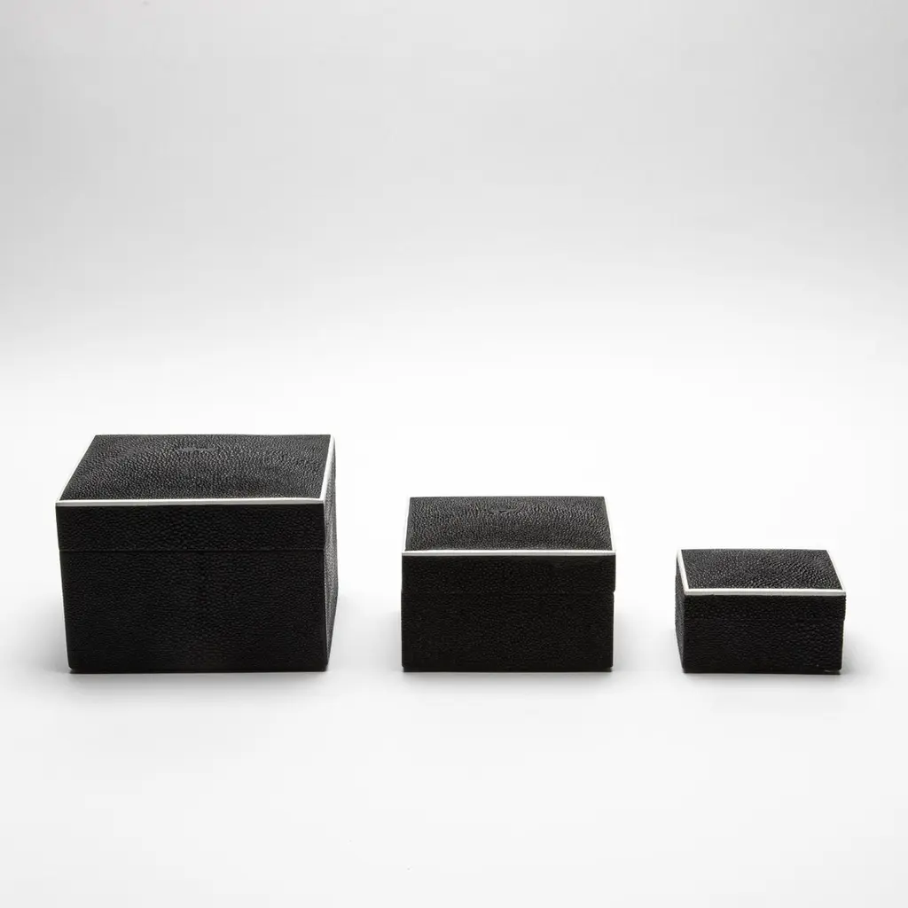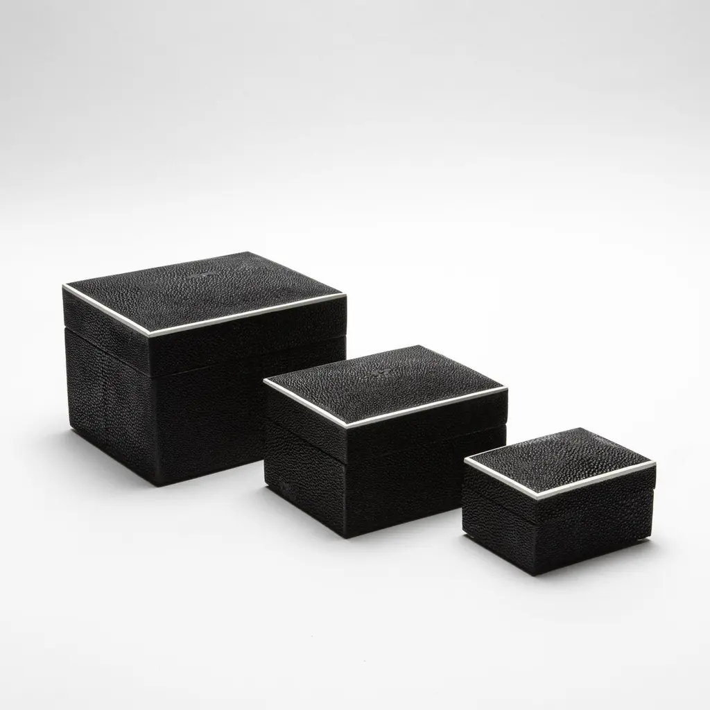 This set of three Curved Top Boxes in black shagreen by R&Y Augousti blends modern elegance with timeless craftsmanship. The rich, textured shagreen exterior is perfectly complemented by the smooth wooden veneer interior, offering a refined yet functional storage solution. The minimalist design, accentuated by gently curved lids, creates a sophisticated visual appeal, making these boxes not only practical but also a striking decorative element. Handcrafted with meticulous attention to detail, they elevate any space with their luxurious finish and impeccable artistry. Ideal for storing your treasures or enhancing your home’s décor.This set of boxes is available in different finishes.Large: 6.5” x 5.5” x 5.5” Medium: 5” x 4” x 3.5” Small: 3.75” x 2.5” x 2.5” This item is on display in our LA showroomColor variants may occur on the stingray and other exotic finishesClean with soft dry clothAbout R&Y AUGOUSTI:R&Y Augousti, created by the visionary husband-and-wife duo Ria and Yiouri Augousti, epitomizes the pinnacle of luxurious, globally inspired design. Since its inception in Paris in 1989, the brand has become synonymous with opulence, distinguishing itself through the masterful integration of shagreen with brass and other exotic materials. Each piece in their Art Deco-inspired collection is a testament to unparalleled craftsmanship, meticulously handcrafted by the finest artisans in the Philippines, ensuring that every creation is a unique masterpiece.Ria, hailing from Manila, and Yiouri, from Cyprus, share an exquisite passion for revivalist design, which has propelled R&Y Augousti to the forefront of luxury interiors. Their innovative use of materials, particularly the revival of shagreen, has set new standards in elegance and sophistication. The natural color variations on stingray and other exotic finishes further enhance the authenticity and bespoke nature of their designs.Today, R&Y Augousti’s collections grace the most exclusive showrooms in Paris, New York, and Los Angeles at the Pacific Design Center's MOGUL, continuing to redefine the essence of timeless luxury. Their work is not merely furniture; it is a celebration of art, craftsmanship, and the ultimate in refined living.