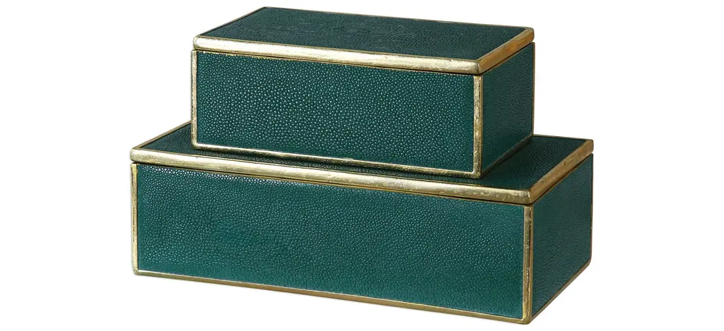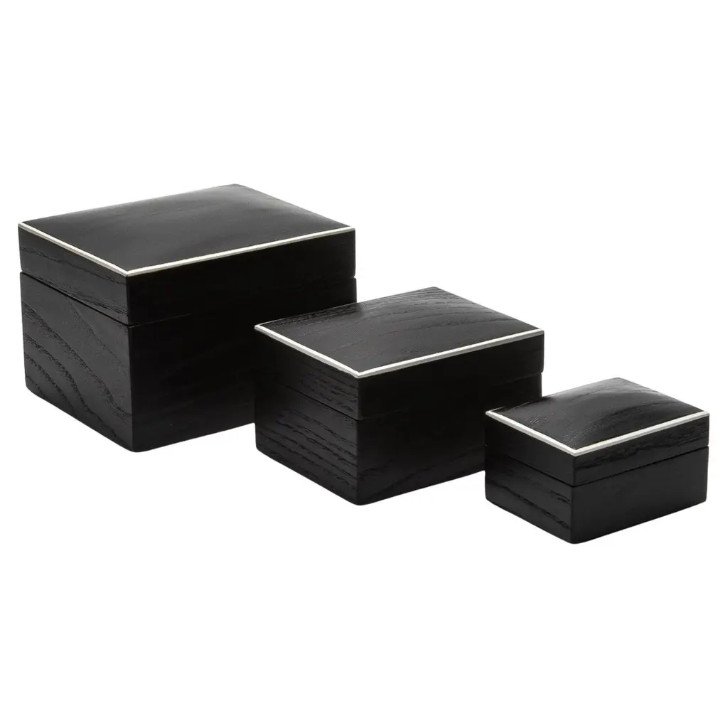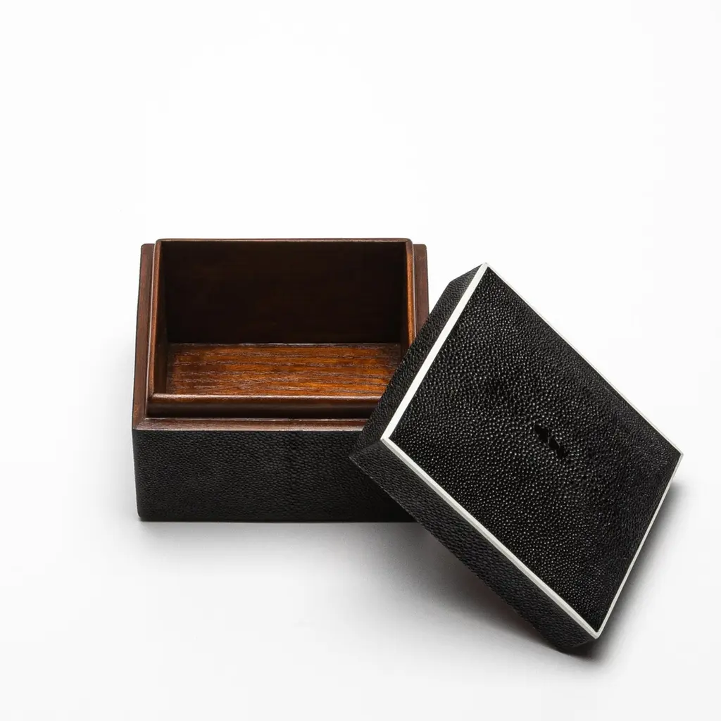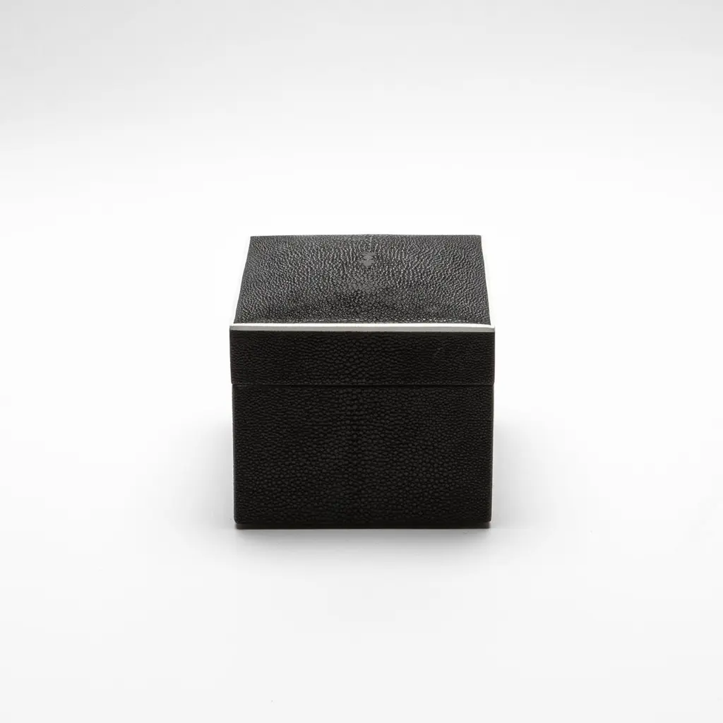 This set of three Curved Top Boxes in black shagreen by R&Y Augousti blends modern elegance with timeless craftsmanship. The rich, textured shagreen exterior is perfectly complemented by the smooth wooden veneer interior, offering a refined yet functional storage solution. The minimalist design, accentuated by gently curved lids, creates a sophisticated visual appeal, making these boxes not only practical but also a striking decorative element. Handcrafted with meticulous attention to detail, they elevate any space with their luxurious finish and impeccable artistry. Ideal for storing your treasures or enhancing your home’s décor.This set of boxes is available in different finishes.Large: 6.5” x 5.5” x 5.5” Medium: 5” x 4” x 3.5” Small: 3.75” x 2.5” x 2.5” This item is on display in our LA showroomColor variants may occur on the stingray and other exotic finishesClean with soft dry clothAbout R&Y AUGOUSTI:R&Y Augousti, created by the visionary husband-and-wife duo Ria and Yiouri Augousti, epitomizes the pinnacle of luxurious, globally inspired design. Since its inception in Paris in 1989, the brand has become synonymous with opulence, distinguishing itself through the masterful integration of shagreen with brass and other exotic materials. Each piece in their Art Deco-inspired collection is a testament to unparalleled craftsmanship, meticulously handcrafted by the finest artisans in the Philippines, ensuring that every creation is a unique masterpiece.Ria, hailing from Manila, and Yiouri, from Cyprus, share an exquisite passion for revivalist design, which has propelled R&Y Augousti to the forefront of luxury interiors. Their innovative use of materials, particularly the revival of shagreen, has set new standards in elegance and sophistication. The natural color variations on stingray and other exotic finishes further enhance the authenticity and bespoke nature of their designs.Today, R&Y Augousti’s collections grace the most exclusive showrooms in Paris, New York, and Los Angeles at the Pacific Design Center's MOGUL, continuing to redefine the essence of timeless luxury. Their work is not merely furniture; it is a celebration of art, craftsmanship, and the ultimate in refined living.
