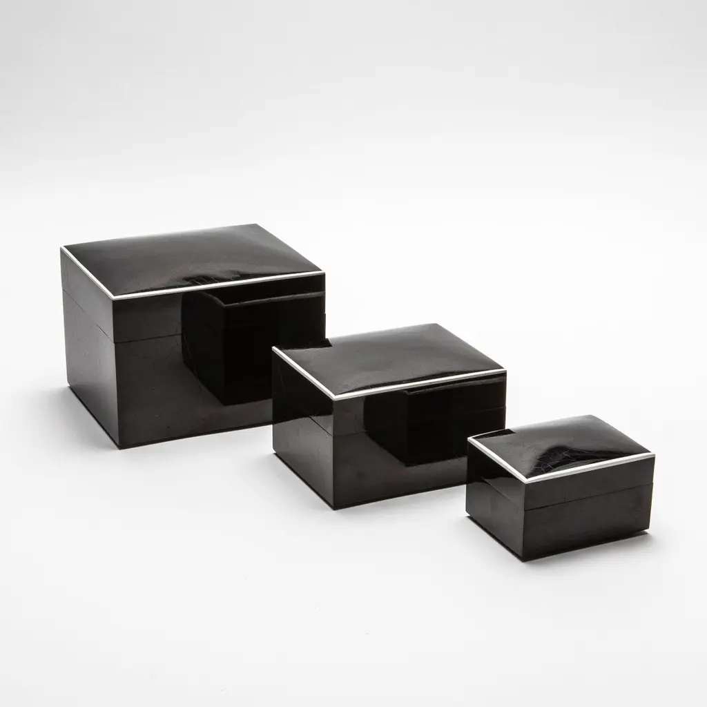 This exquisite set of three curved top boxes, handcrafted from luxurious pen shell, is a testament to R&Y Augousti’s mastery of artisanal craftsmanship. Each box boasts a sleek, lustrous surface that captures the natural beauty of the pen shell's rich texture and tone. Perfectly proportioned and versatile in size, these boxes serve both as striking decorative pieces and functional storage solutions. The interior is lined with fine wood veneer, complementing the elegant, high-gloss exterior. Whether displayed individually or as a set, these boxes bring a sophisticated touch to any space, embodying timeless luxury and refined design.This set of boxes is available in different finishes.Large: 6.5” x 5.5” x 5.5” Medium: 5” x 4” x 3.5” Small: 3.75” x 2.5” x 2.5” This item is on display in our LA showroomColor variants may occur on the stingray and other exotic finishesClean with soft dry clothAbout R&Y AUGOUSTI:R&Y Augousti, created by the visionary husband-and-wife duo Ria and Yiouri Augousti, epitomizes the pinnacle of luxurious, globally inspired design. Since its inception in Paris in 1989, the brand has become synonymous with opulence, distinguishing itself through the masterful integration of shagreen with brass and other exotic materials. Each piece in their Art Deco-inspired collection is a testament to unparalleled craftsmanship, meticulously handcrafted by the finest artisans in the Philippines, ensuring that every creation is a unique masterpiece.Ria, hailing from Manila, and Yiouri, from Cyprus, share an exquisite passion for revivalist design, which has propelled R&Y Augousti to the forefront of luxury interiors. Their innovative use of materials, particularly the revival of shagreen, has set new standards in elegance and sophistication. The natural color variations on stingray and other exotic finishes further enhance the authenticity and bespoke nature of their designs.Today, R&Y Augousti’s collections grace the most exclusive showrooms in Paris, New York, and Los Angeles at the Pacific Design Center's MOGUL, continuing to redefine the essence of timeless luxury. Their work is not merely furniture; it is a celebration of art, craftsmanship, and the ultimate in refined living.
