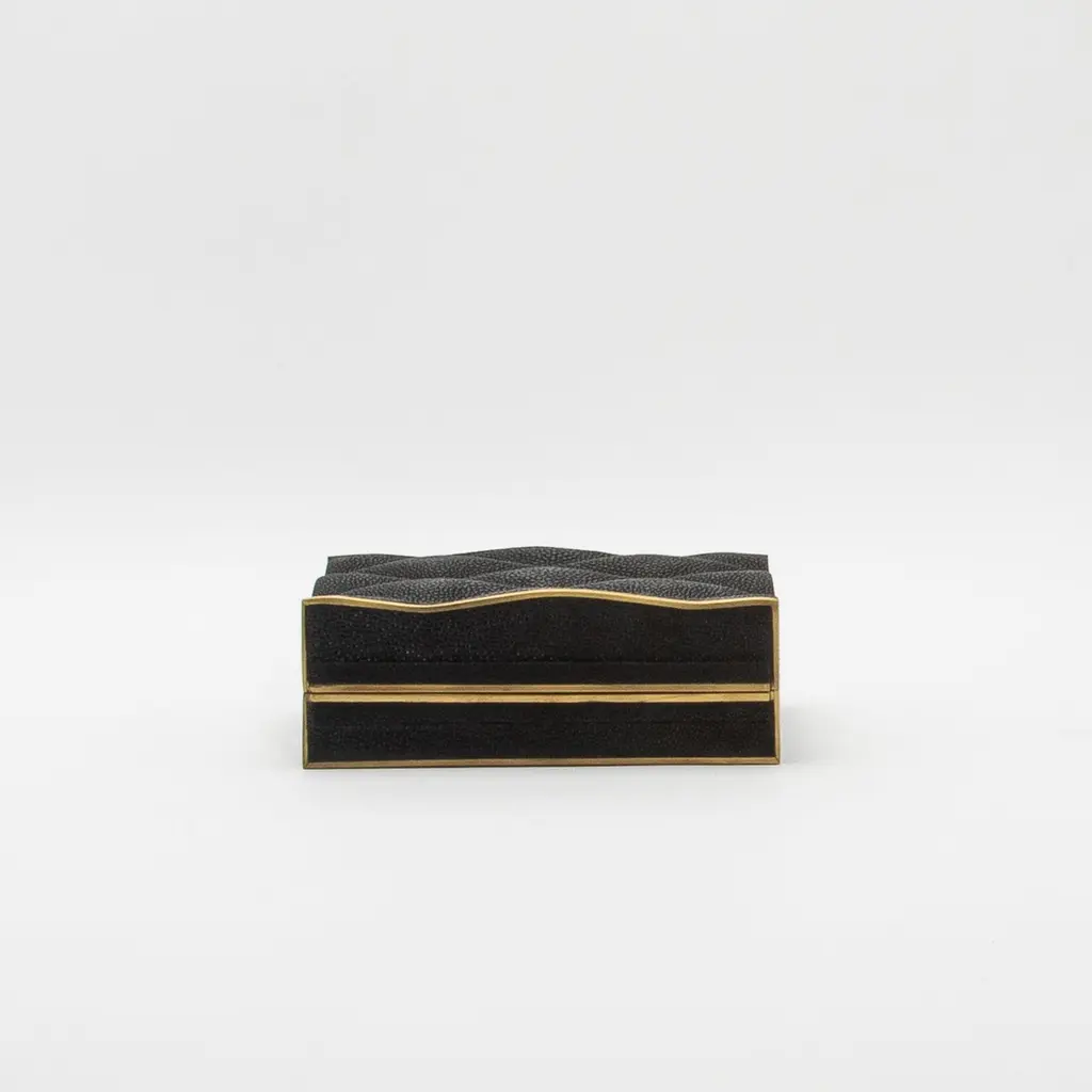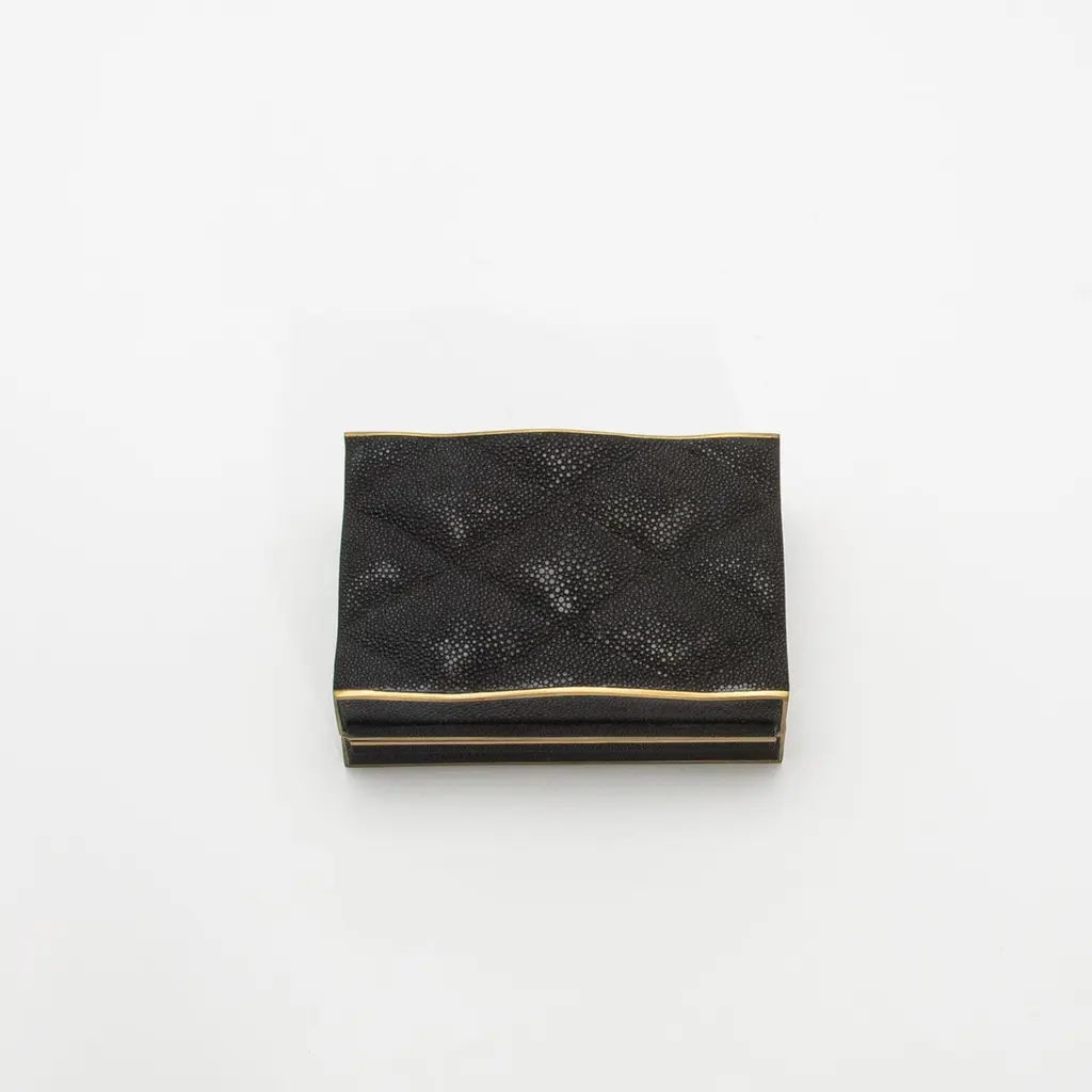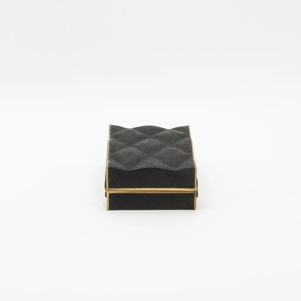 The Coco box collection by Kifu Paris exemplifies luxury through its intricate design and meticulous craftsmanship. This set of three quilted boxes in black shagreen, framed with a bronze patina brass edge, radiates elegance and sophistication. The wavy, tactile surface of the shagreen is delicately quilted, creating a sense of movement, while the brass detailing adds a gleaming, opulent touch. Inside, the warm wood contrasts beautifully with the black shagreen exterior, emphasizing the harmonious blend of textures and materials. This artisanal masterpiece elevates any space, offering both aesthetic beauty and functional storage in a truly luxurious form.SMALL: 4” x 3.25” x 2.38” MEDIUM: 5.5” x 4.25” x 2.38” LARGE: 5.5” x 7.75” x 2.38” These boxes are available in other finishes.This item is on display in our LA showroomKeep away from direct sunlightColor variants may occur on the stingray and other exotic finishesClean with soft dry clothAbout KIFU PARIS:Kifu Augousti is an up-and-coming creator of modern furnishings, celebrated for her ability to blend the timeless elegance of the Art Deco tradition with a bold, contemporary flair. The daughter of renowned designers Ria and Yiouri Augousti, known as R&Y Augousti, Kifu has inherited a rich legacy while carving out her own distinctive style. Offbeat materials, sinuous curves, and wild patterns have become the hallmarks of her designs, cultivated from her early years in Paris to her current creative haven in Manila.Each piece in Kifu’s collection, whether furniture or accessories, is meticulously handcrafted by the finest artisans in the Philippines. These artisans, known for their unparalleled expertise, use only the best natural materials and apply intricate, hand-painted techniques, ensuring every item is a masterpiece. Available in exclusive showrooms in Paris, New York, and Los Angeles at the Pacific Design Center's MOGUL, her creations—ranging from sculptural benches with commanding bronze frames to exquisitely detailed boxes, trays and vases—are not just furnishings, but timeless treasures that represent the pinnacle of luxury and innovative design.