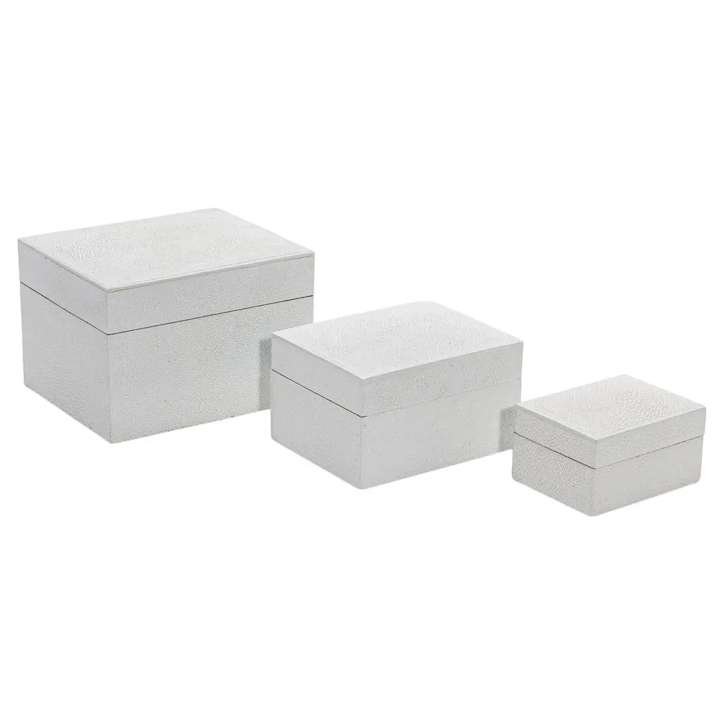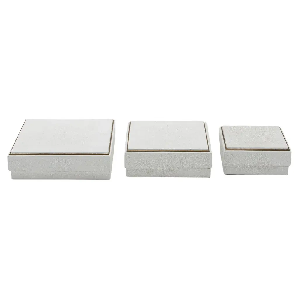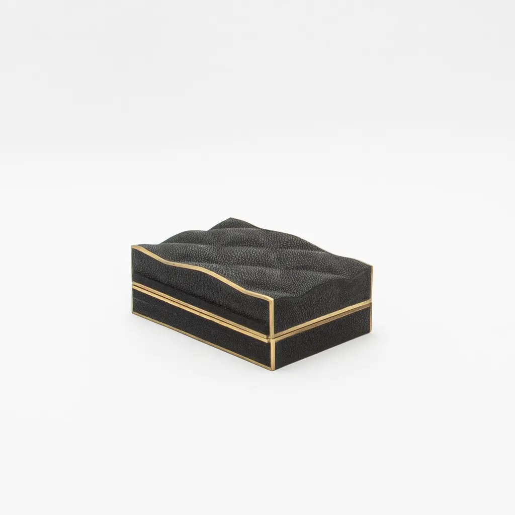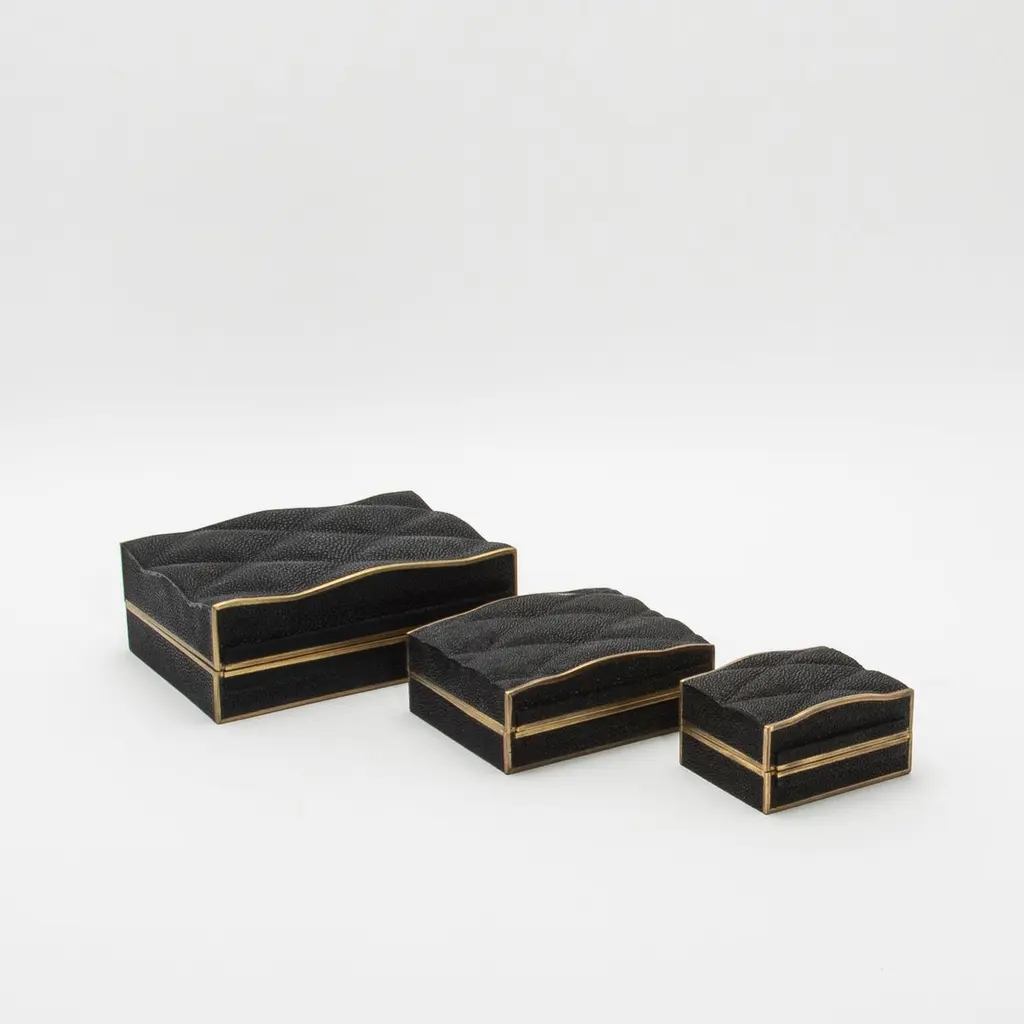 The Coco box collection by Kifu Paris exemplifies luxury through its intricate design and meticulous craftsmanship. This set of three quilted boxes in black shagreen, framed with a bronze patina brass edge, radiates elegance and sophistication. The wavy, tactile surface of the shagreen is delicately quilted, creating a sense of movement, while the brass detailing adds a gleaming, opulent touch. Inside, the warm wood contrasts beautifully with the black shagreen exterior, emphasizing the harmonious blend of textures and materials. This artisanal masterpiece elevates any space, offering both aesthetic beauty and functional storage in a truly luxurious form.SMALL: 4” x 3.25” x 2.38” MEDIUM: 5.5” x 4.25” x 2.38” LARGE: 5.5” x 7.75” x 2.38” These boxes are available in other finishes.This item is on display in our LA showroomKeep away from direct sunlightColor variants may occur on the stingray and other exotic finishesClean with soft dry clothAbout KIFU PARIS:Kifu Augousti is an up-and-coming creator of modern furnishings, celebrated for her ability to blend the timeless elegance of the Art Deco tradition with a bold, contemporary flair. The daughter of renowned designers Ria and Yiouri Augousti, known as R&Y Augousti, Kifu has inherited a rich legacy while carving out her own distinctive style. Offbeat materials, sinuous curves, and wild patterns have become the hallmarks of her designs, cultivated from her early years in Paris to her current creative haven in Manila.Each piece in Kifu’s collection, whether furniture or accessories, is meticulously handcrafted by the finest artisans in the Philippines. These artisans, known for their unparalleled expertise, use only the best natural materials and apply intricate, hand-painted techniques, ensuring every item is a masterpiece. Available in exclusive showrooms in Paris, New York, and Los Angeles at the Pacific Design Center's MOGUL, her creations—ranging from sculptural benches with commanding bronze frames to exquisitely detailed boxes, trays and vases—are not just furnishings, but timeless treasures that represent the pinnacle of luxury and innovative design.