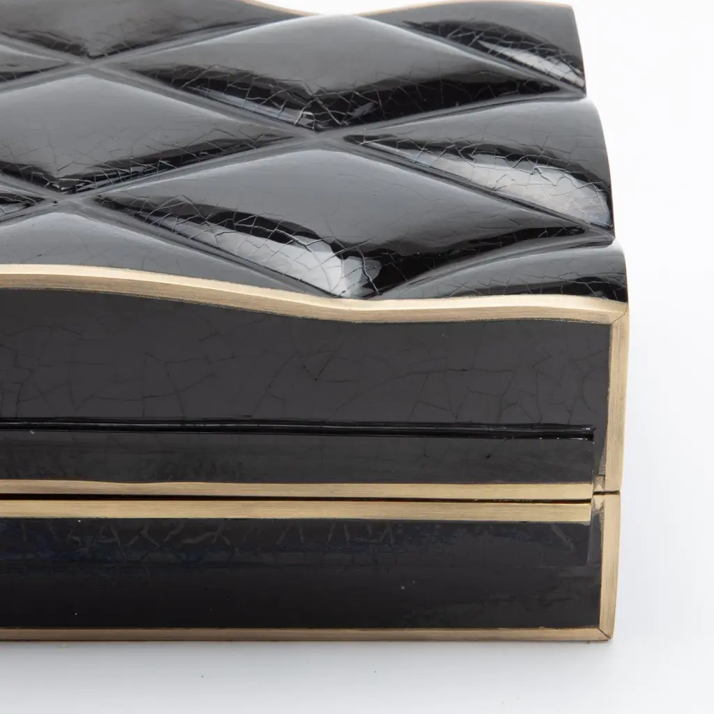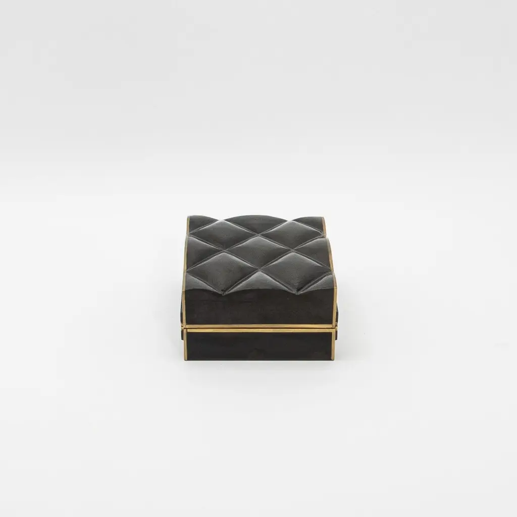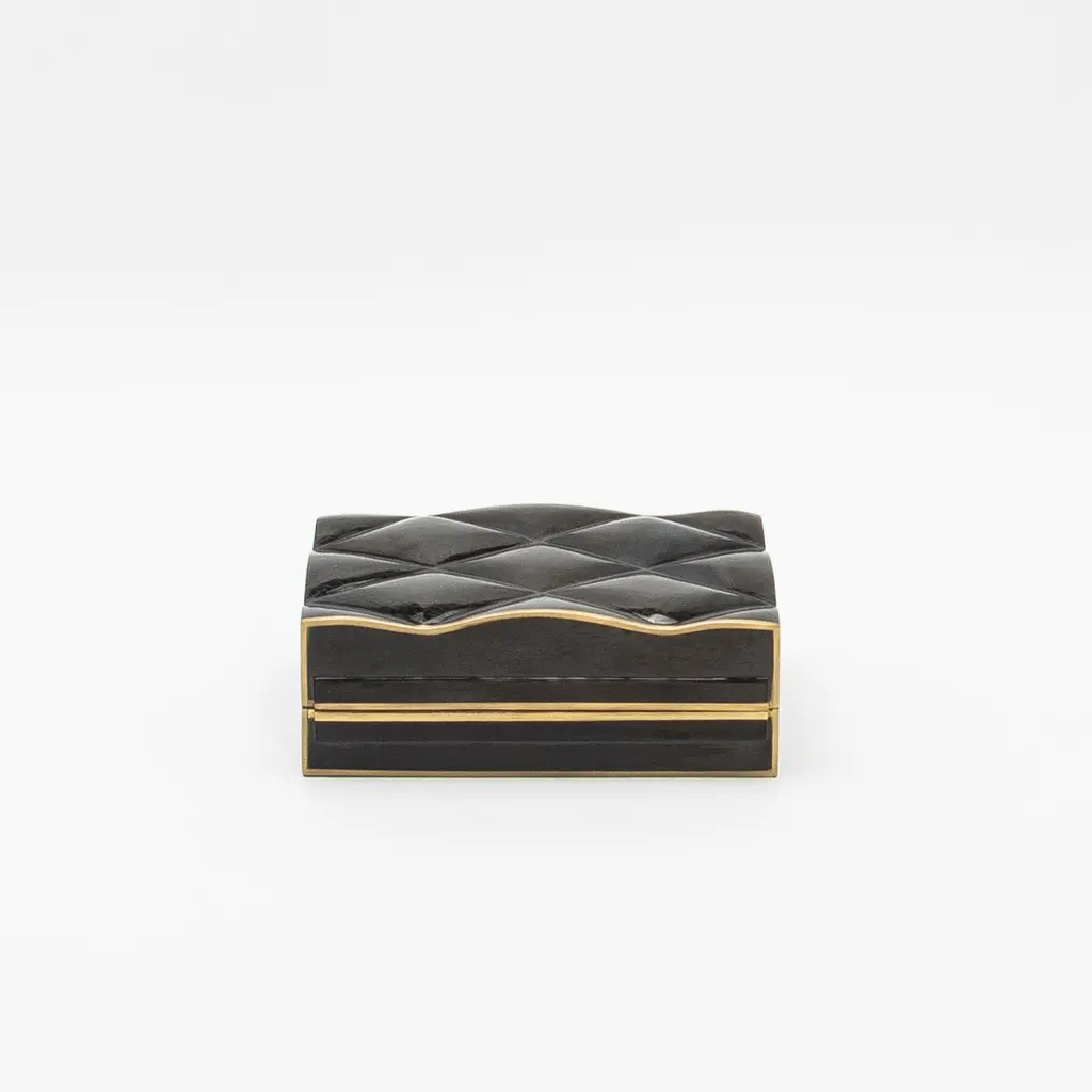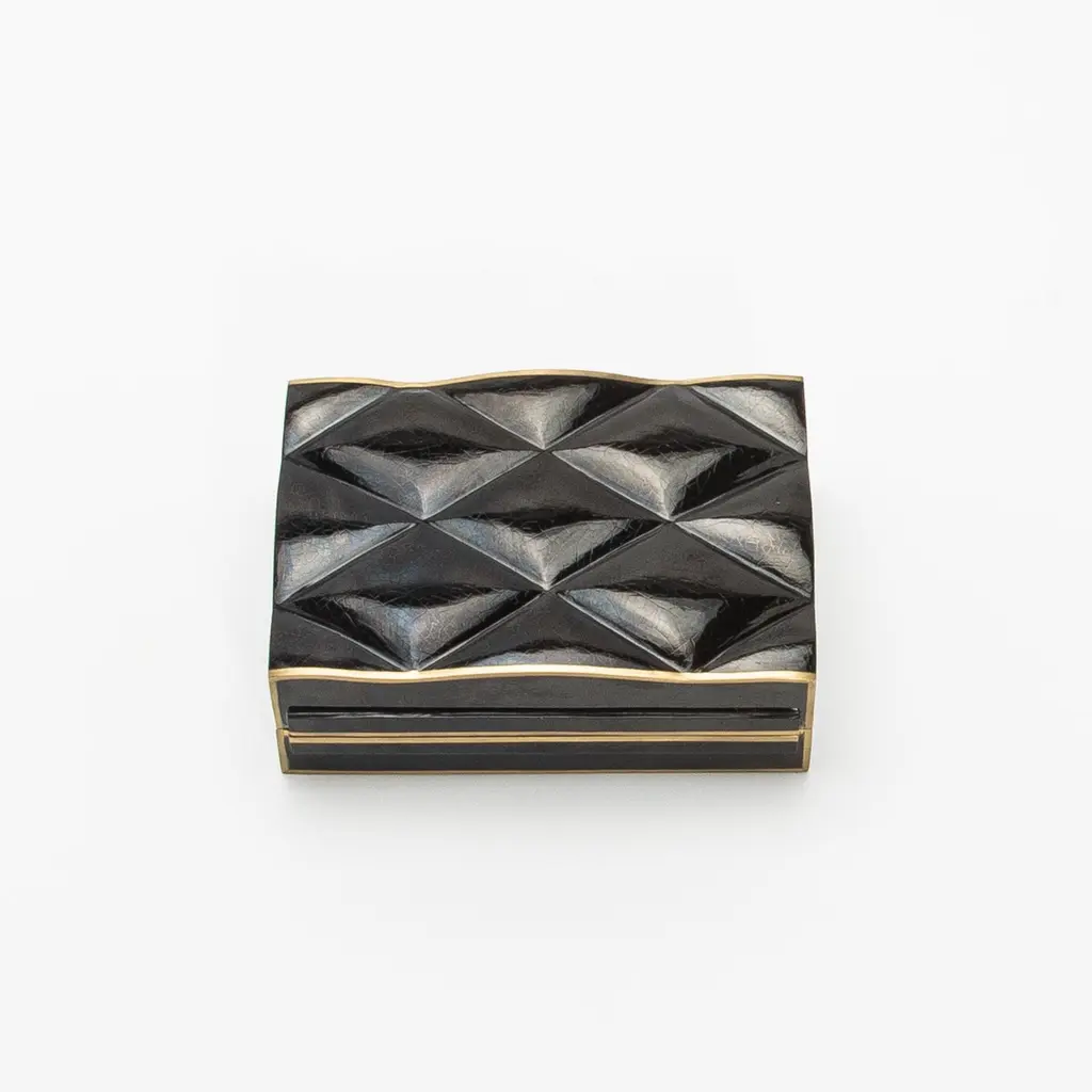 The Coco box collection by Kifu Paris exemplifies luxury through its intricate design and meticulous craftsmanship. This set of three quilted boxes in black pen shell, framed with a bronze patina brass edge, radiates elegance and sophistication. The smooth, reflective surface of the shell is delicately quilted, creating a sense of movement, while the brass detailing adds a gleaming, opulent touch. Inside, the warm wood contrasts beautifully with the black shell exterior, emphasizing the harmonious blend of textures and materials. This artisanal masterpiece elevates any space, offering both aesthetic beauty and functional storage in a truly luxurious form.SMALL: 4” x 3.25” x 2.38” MEDIUM: 5.5” x 4.25” x 2.38” LARGE: 5.5” x 7.75” x 2.38” These boxes are available in other finishes.This item is on display in our LA showroomKeep away from direct sunlightColor variants may occur on the stingray and other exotic finishesClean with soft dry clothAbout KIFU PARIS:Kifu Augousti is an up-and-coming creator of modern furnishings, celebrated for her ability to blend the timeless elegance of the Art Deco tradition with a bold, contemporary flair. The daughter of renowned designers Ria and Yiouri Augousti, known as R&Y Augousti, Kifu has inherited a rich legacy while carving out her own distinctive style. Offbeat materials, sinuous curves, and wild patterns have become the hallmarks of her designs, cultivated from her early years in Paris to her current creative haven in Manila.Each piece in Kifu’s collection, whether furniture or accessories, is meticulously handcrafted by the finest artisans in the Philippines. These artisans, known for their unparalleled expertise, use only the best natural materials and apply intricate, hand-painted techniques, ensuring every item is a masterpiece. Available in exclusive showrooms in Paris, New York, and Los Angeles at the Pacific Design Center's MOGUL, her creations—ranging from sculptural benches with commanding bronze frames to exquisitely detailed boxes, trays and vases—are not just furnishings, but timeless treasures that represent the pinnacle of luxury and innovative design.