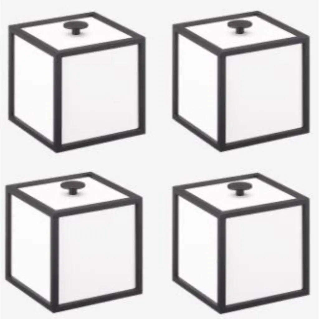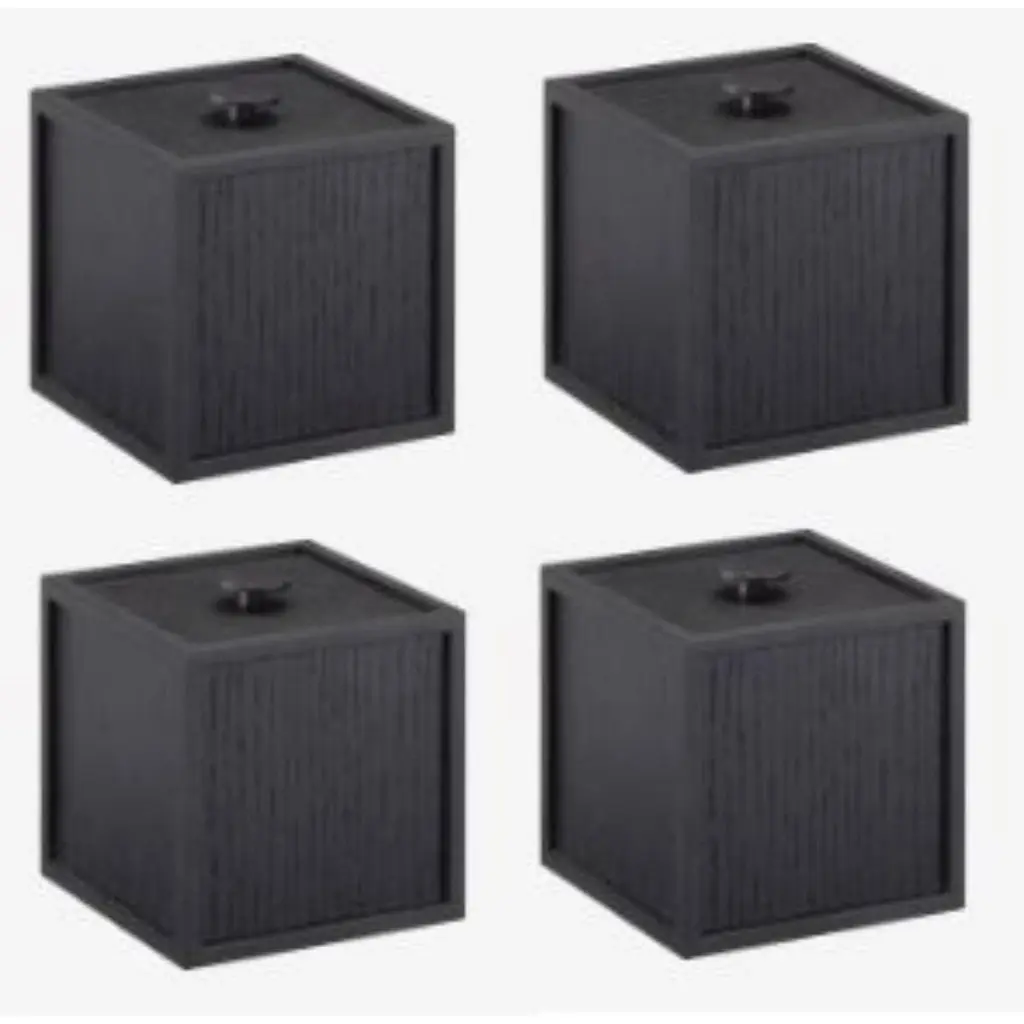 Set of 4 black ash frame 10 box by LassenDimensions: D 10 x W 10 x H 10 cm Materials: Finér, Melamin, Melamine, Metal, VeneerWeight: 0.85 KgFrame Box is a square box in a cubistic shape. The simple boxes are inspired by the Kubus candleholder by Mogens Lassen, that are based on strict mathematical formulas and designed with the greatest precision. The Frame boxes are available in three sizes: 10, 14 and 20, which can be combined to exactly match your storage needs. The cubistic boxes can be easily stacked on top of each other, as the handle contains a spring function, which is easily pressed down when a box is stacked on top of another box. The Frame boxes provide a flexible storage solution – perfect for storing office accessories, jewellery, makeup and any knickknacks that need organising and storing.The small and simple Frame boxes are manufactured and assembled by hand in Denmark. It is a collection that truly unites functionality, quality and aesthetics.