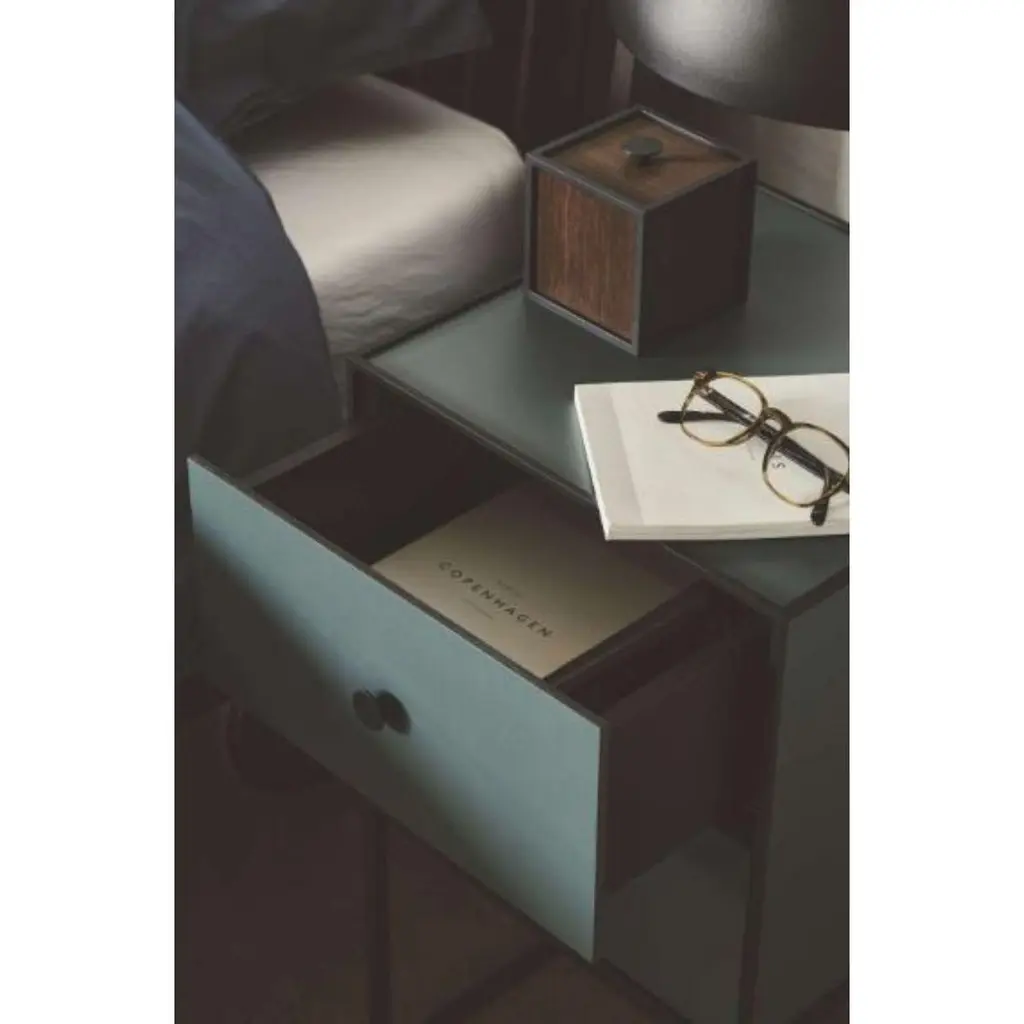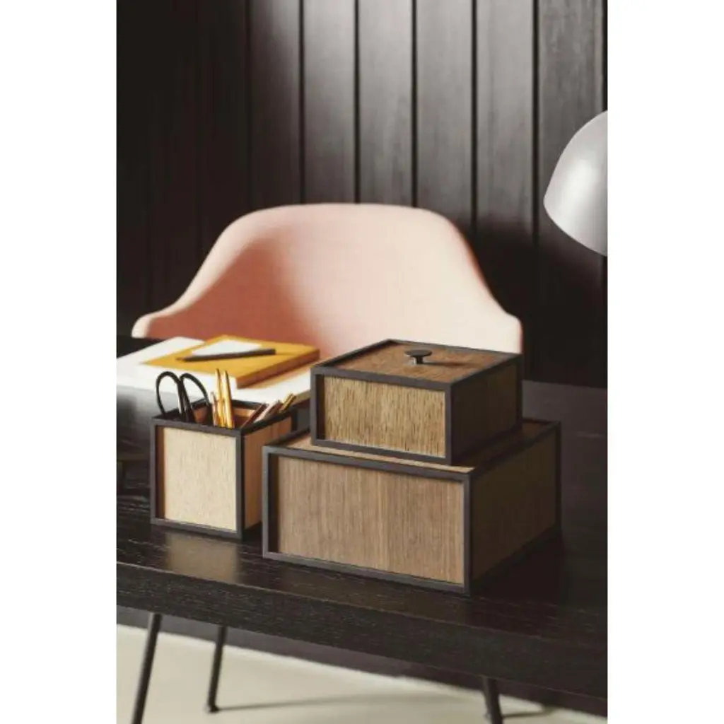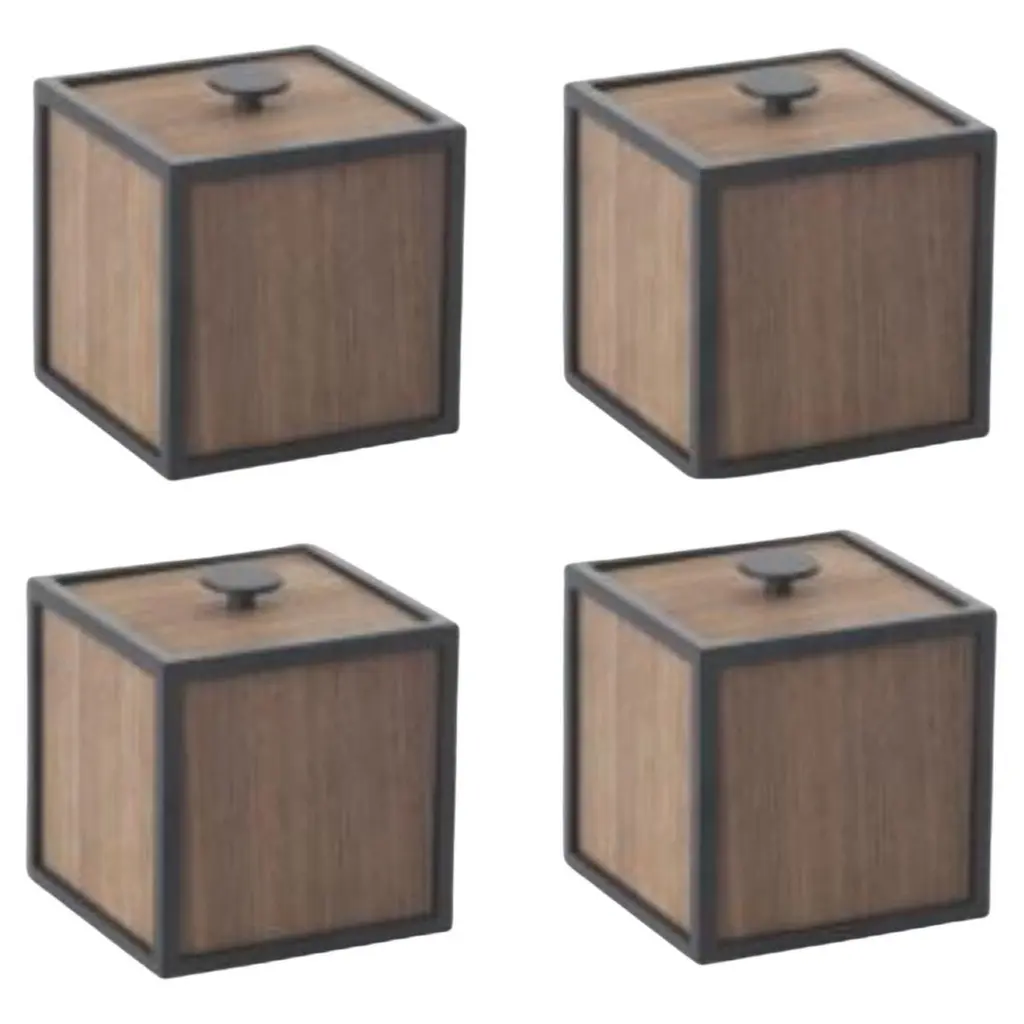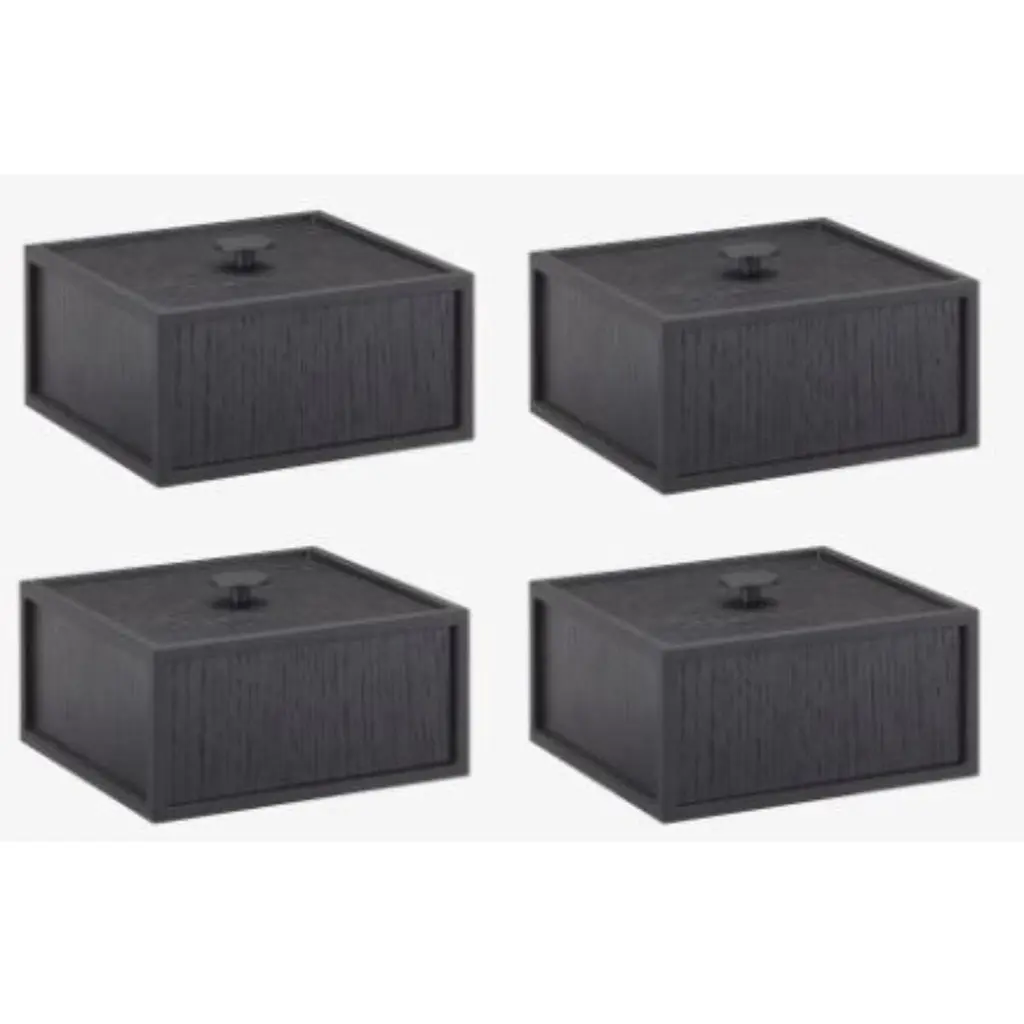 Set of 4 black ash frame 14 box by LassenDimensions: D 10 x W 10 x H 7 cm Materials: Finér, Melamin, Melamine, Metal, VeneerWeight: 1.10 KgFrame Box is a square box in a cubistic shape. The simple boxes are inspired by the Kubus candleholder by Mogens Lassen, that are based on strict mathematical formulas and designed with the greatest precision. The Frame boxes are available in three sizes: 10, 14 and 20, which can be combined to exactly match your storage needs. The cubistic boxes can be easily stacked on top of each other, as the handle contains a spring function, which is easily pressed down when a box is stacked on top of another box. The Frame boxes provide a flexible storage solution – perfect for storing office accessories, jewellery, makeup and any knickknacks that need organising and storing.The small and simple Frame boxes are manufactured and assembled by hand in Denmark. It is a collection that truly unites functionality, quality and aesthetics.