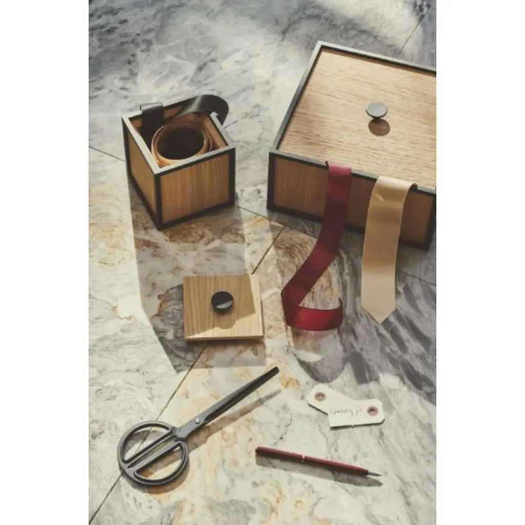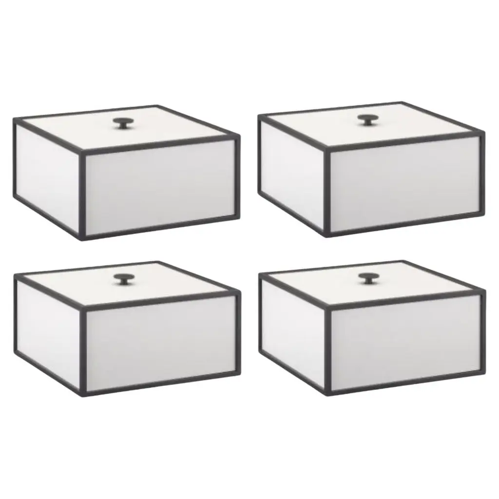 Set of 4 dark grey frame 20 box by LassenDimensions: D 20 x W 20 x H 10 cm Materials: melamin, melamine, metal, veneerWeight: 2.00 KgFrame Box is a square box in a cubistic shape. The simple boxes are inspired by the Kubus candleholder by Mogens Lassen, that are based on strict mathematical formulas and designed with the greatest precision. The Frame boxes are available in three sizes: 10, 14 and 20, which can be combined to exactly match your storage needs. The cubistic boxes can be easily stacked on top of each other, as the handle contains a spring function, which is easily pressed down when a box is stacked on top of another box. The Frame boxes provide a flexible storage solution – perfect for storing office accessories, jewellery, makeup and any knickknacks that need organising and storing.The small and simple Frame boxes are manufactured and assembled by hand in Denmark. It is a collection that truly unites functionality, quality and aesthetics.