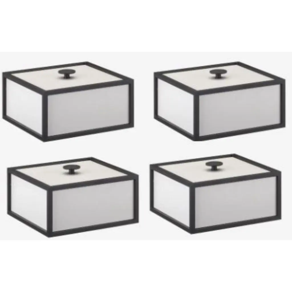Set of 4 light grey frame 14 box by LassenDimensions: d 10 x w 10 x h 7 cm Materials: Finér, Melamin, Melamine, Metal, VeneerWeight: 1.10 KgFrame box is a square box in a cubistic shape. The simple boxes are inspired by the Kubus candleholder by Mogens Lassen, that are based on strict mathematical formulas and designed with the greatest precision. The Frame boxes are available in three sizes: 10, 14 and 20, which can be combined to exactly match your storage needs. The cubistic boxes can be easily stacked on top of each other, as the handle contains a spring function, which is easily pressed down when a box is stacked on top of another box. The Frame boxes provide a flexible storage solution – perfect for storing office accessories, jewellery, makeup and any knickknacks that need organising and storing.The small and simple Frame boxes are manufactured and assembled by hand in Denmark. It is a collection that truly unites functionality, quality and aesthetics.