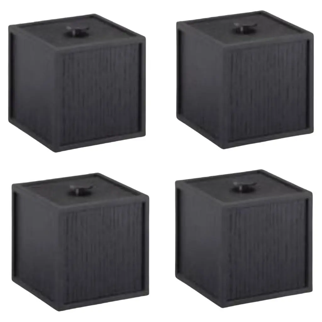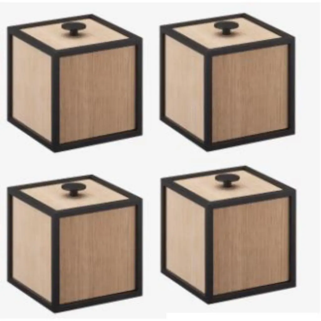 Set of 4 oak frame 10 box by LassenDimensions: D 10 x W 10 x H 10 cm Materials: Finér, Melamin, Melamine, Metal, VeneerWeight: 0.85 KgFrame box is a square box in a cubistic shape. The simple boxes are inspired by the Kubus candleholder by Mogens Lassen, that are based on strict mathematical formulas and designed with the greatest precision. The Frame boxes are available in three sizes: 10, 14 and 20, which can be combined to exactly match your storage needs. The cubistic boxes can be easily stacked on top of each other, as the handle contains a spring function, which is easily pressed down when a box is stacked on top of another box. The Frame boxes provide a flexible storage solution – perfect for storing office accessories, jewellery, makeup and any knickknacks that need organising and storing.The small and simple Frame boxes are manufactured and assembled by hand in Denmark. It is a collection that truly unites functionality, quality and aesthetics.