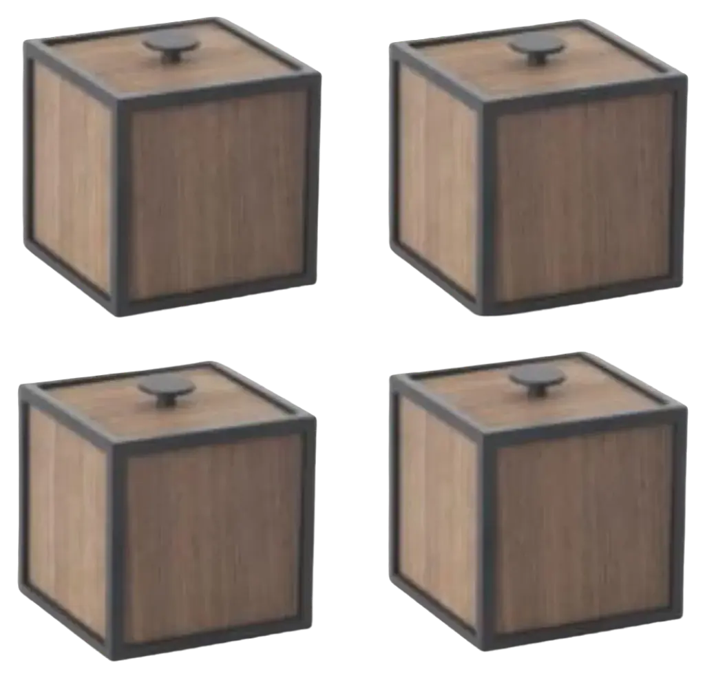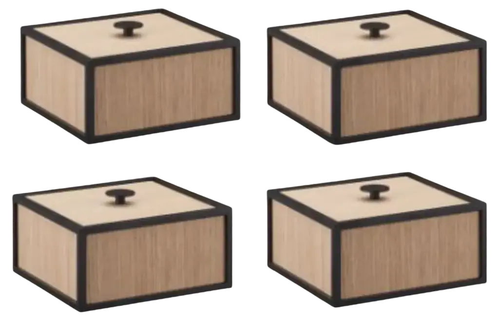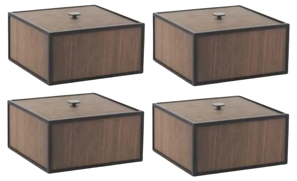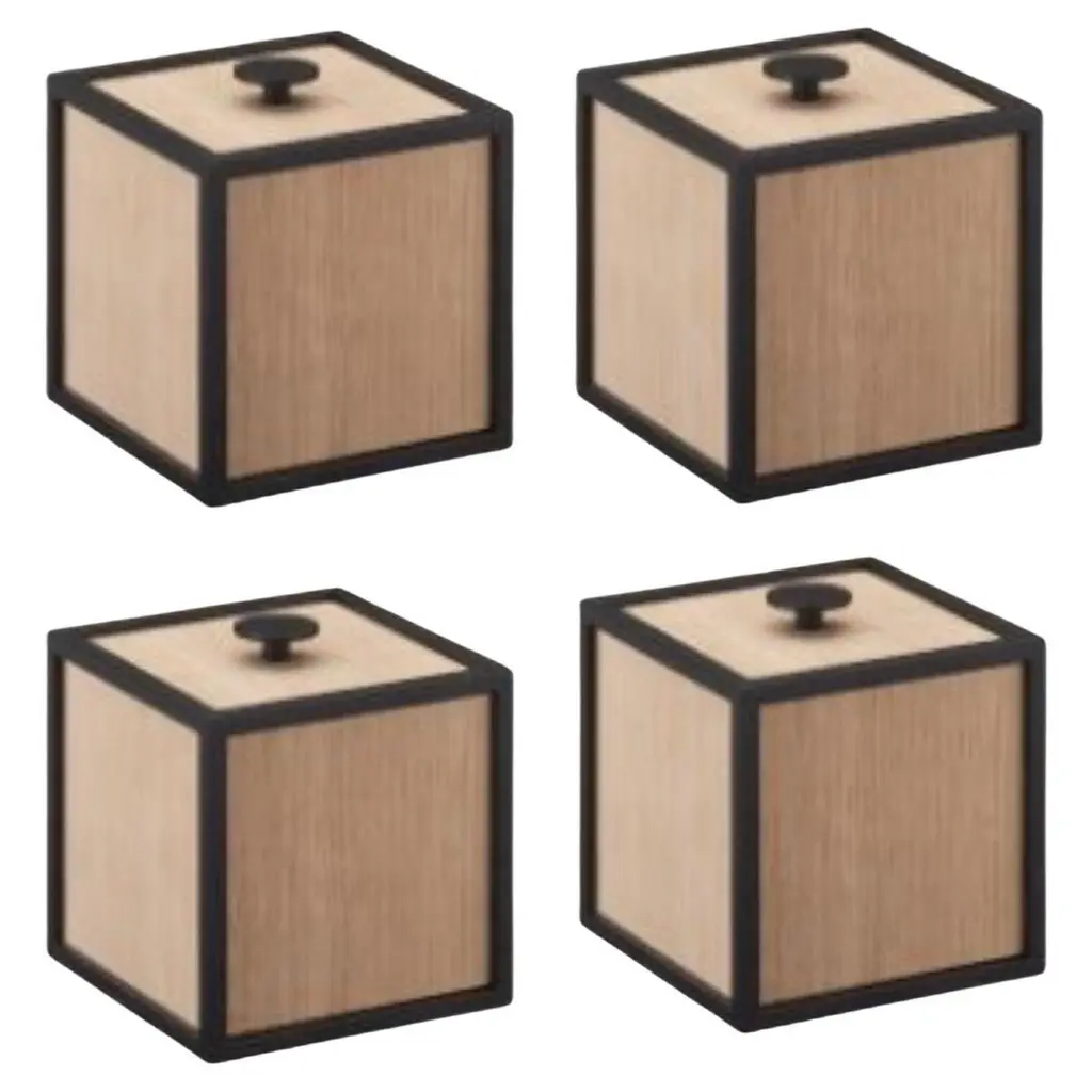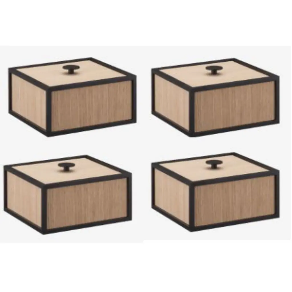 Set of 4 oak frame 14 box by LassenDimensions: d 10 x w 10 x h 7 cm Materials: Finér, Melamin, Melamine, Metal, VeneerWeight: 1.10 KgFrame Box is a square box in a cubistic shape. The simple boxes are inspired by the Kubus candleholder by Mogens Lassen, that are based on strict mathematical formulas and designed with the greatest precision. The Frame boxes are available in three sizes: 10, 14 and 20, which can be combined to exactly match your storage needs. The cubistic boxes can be easily stacked on top of each other, as the handle contains a spring function, which is easily pressed down when a box is stacked on top of another box. The Frame boxes provide a flexible storage solution – perfect for storing office accessories, jewellery, makeup and any knickknacks that need organising and storing.The small and simple Frame boxes are manufactured and assembled by hand in Denmark. It is a collection that truly unites functionality, quality and aesthetics.