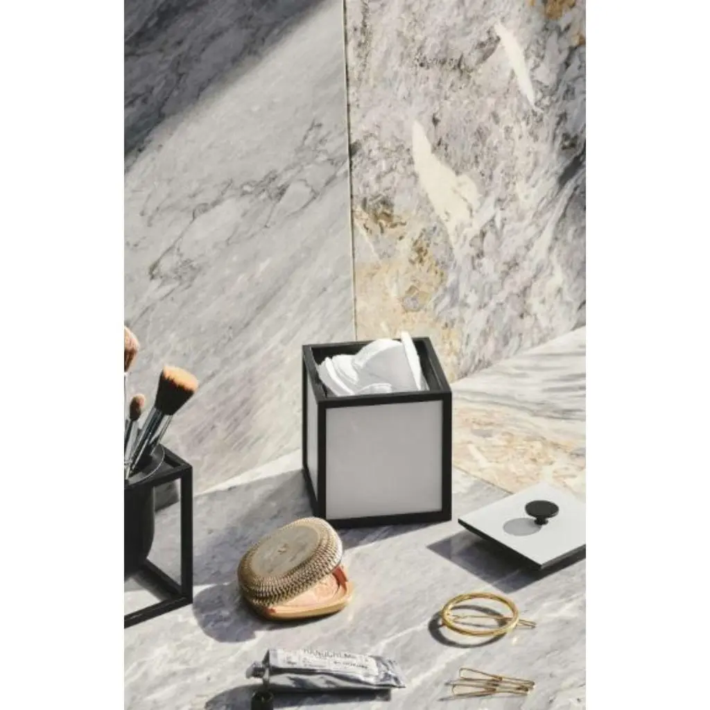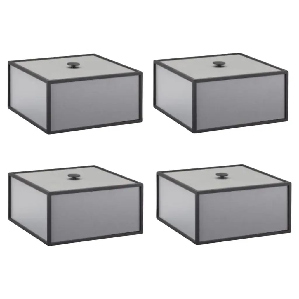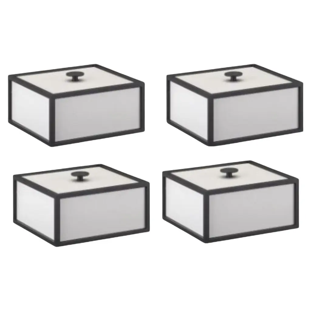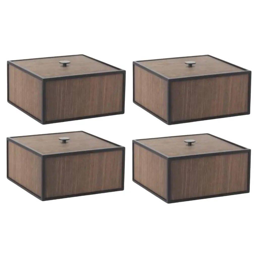 Set of 4 oak frame 14 box by LassenDimensions: d 10 x w 10 x h 7 cm Materials: Finér, Melamin, Melamine, Metal, VeneerWeight: 1.10 KgFrame Box is a square box in a cubistic shape. The simple boxes are inspired by the Kubus candleholder by Mogens Lassen, that are based on strict mathematical formulas and designed with the greatest precision. The Frame boxes are available in three sizes: 10, 14 and 20, which can be combined to exactly match your storage needs. The cubistic boxes can be easily stacked on top of each other, as the handle contains a spring function, which is easily pressed down when a box is stacked on top of another box. The Frame boxes provide a flexible storage solution – perfect for storing office accessories, jewellery, makeup and any knickknacks that need organising and storing.The small and simple Frame boxes are manufactured and assembled by hand in Denmark. It is a collection that truly unites functionality, quality and aesthetics.