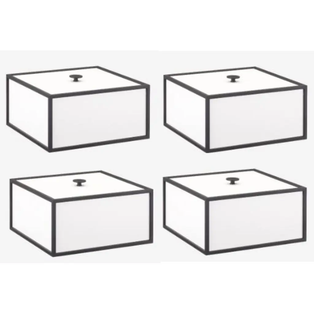 Set of 4 white frame 20 box by LassenDimensions: d 20 x w 20 x h 10 cm Materials: Melamin, Melamine, Metal, VeneerWeight: 2.00 KgFrame box is a square box in a cubistic shape. The simple boxes are inspired by the Kubus candleholder by Mogens Lassen, that are based on strict mathematical formulas and designed with the greatest precision. The Frame boxes are available in three sizes: 10, 14 and 20, which can be combined to exactly match your storage needs. The cubistic boxes can be easily stacked on top of each other, as the handle contains a spring function, which is easily pressed down when a box is stacked on top of another box. The Frame boxes provide a flexible storage solution – perfect for storing office accessories, jewellery, makeup and any knickknacks that need organising and storing.The small and simple Frame boxes are manufactured and assembled by hand in Denmark. It is a collection that truly unites functionality, quality and aesthetics.