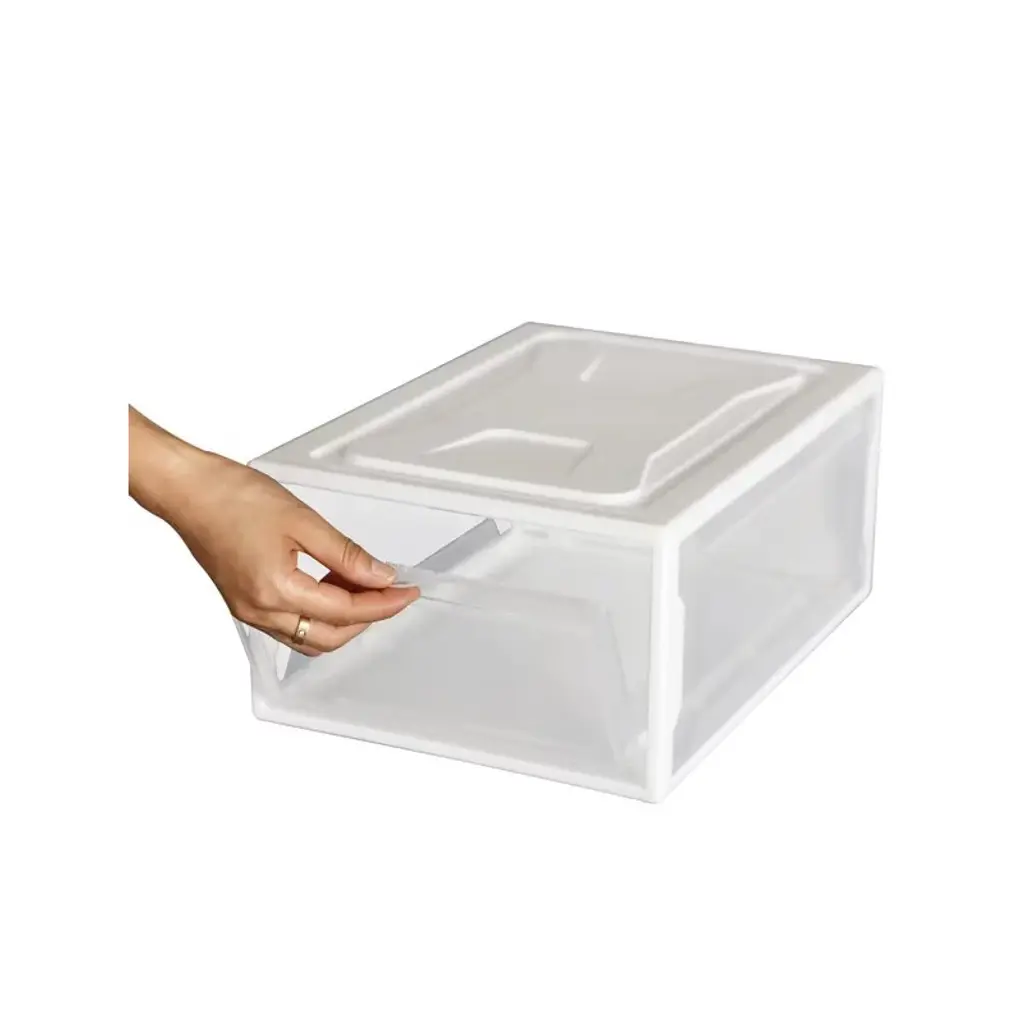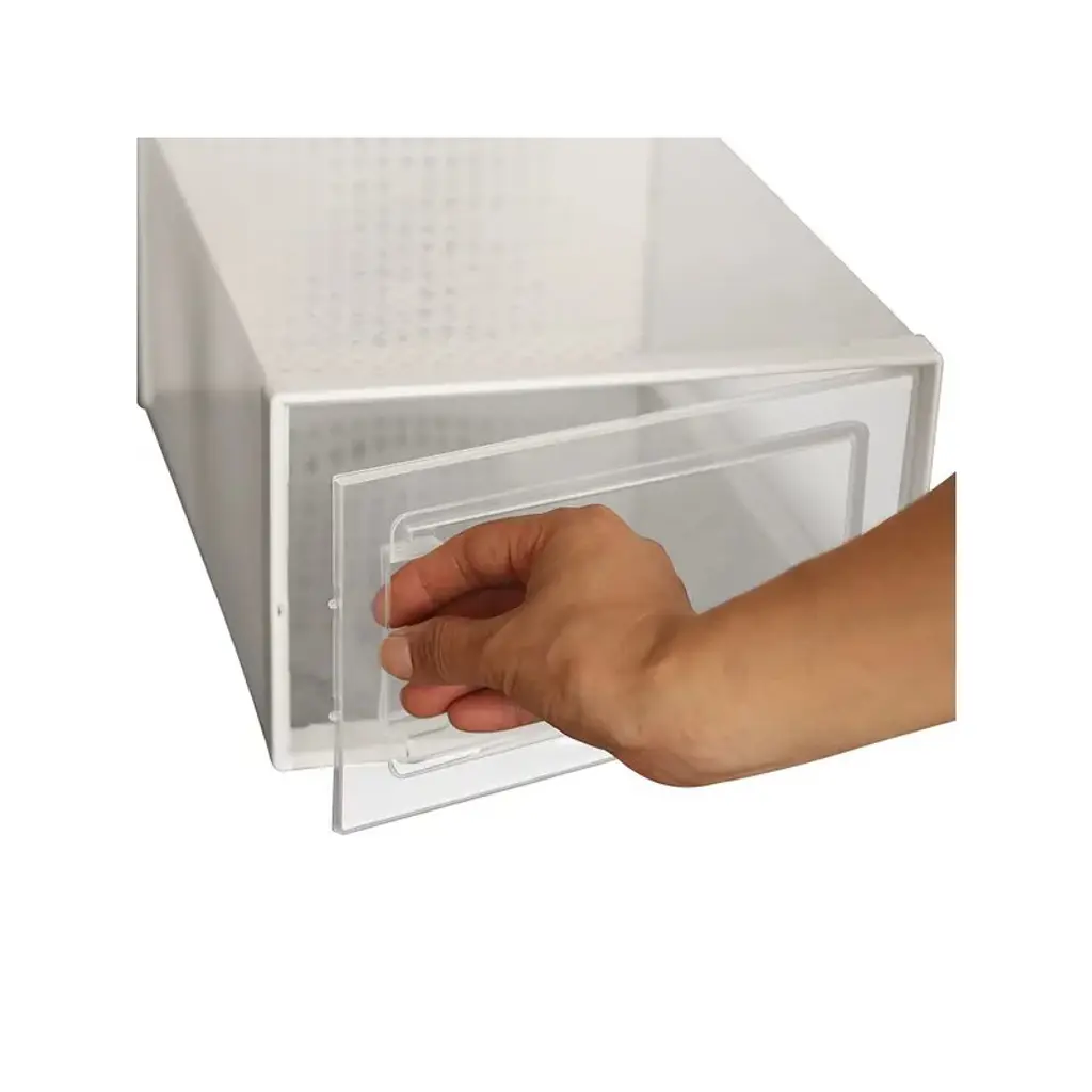 SpecificationDimensions:14.00 in * 10.00 in * 7.00 inWeight:10.0000 lbAvailable Ship to:United StatesDetailsSpecifications:Item weight: 8 lbColor: ClearShoe Size: Women's 9/Men's 13Material: PP shoe storage boxes+ABS door frameOverall Dimension: 14(L) x 9.5(W) x 7 (H) inPackage weight: 10 lbPackage size: 15 x 11 x 8.5 inPackage Includes:6 x Shoe Box