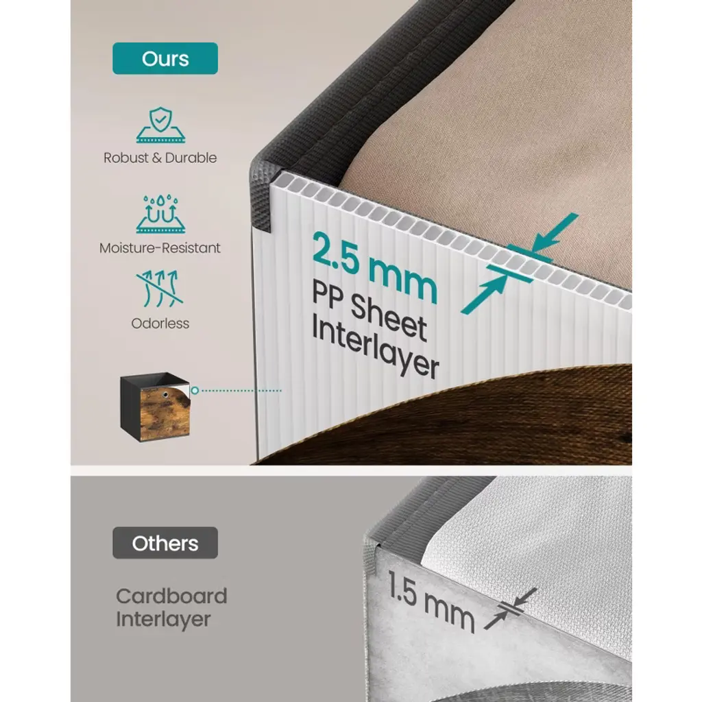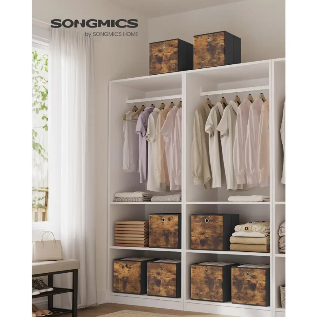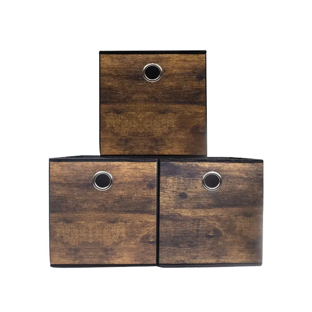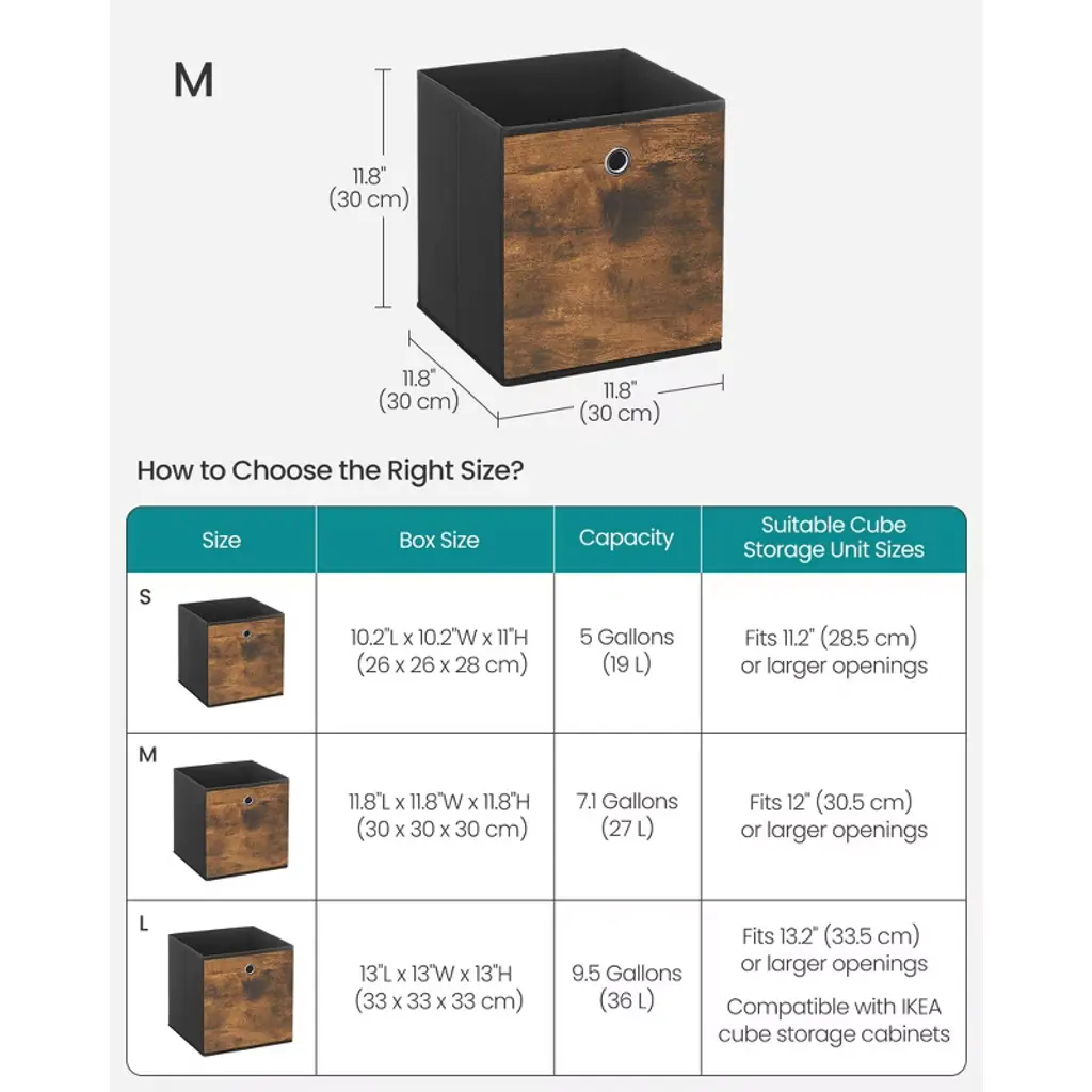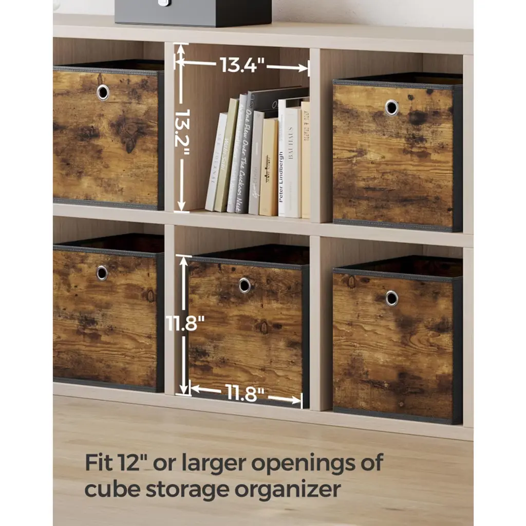 Designed to fit most 12-inch cube organizers, these 11.8-inch fabric storage bins feature sturdy PP panels and non-woven fabric for odorless, moisture-resistant organization. Each collapsible bin includes a grommet handle for easy access and folds flat when not in use. Ideal for clothes, toys, or books in bedrooms, living rooms, or closets, the set offers both rustic style and functional storage. Size of Each Box: 11.8"L x 11.8"W x 11.8"H (30 x 30 x 30 cm) Total Weight of 8 Boxes: 7.5 lb (3.4 kg) Max. Static Load Capacity of Each Box: 11 lb (5 kg)