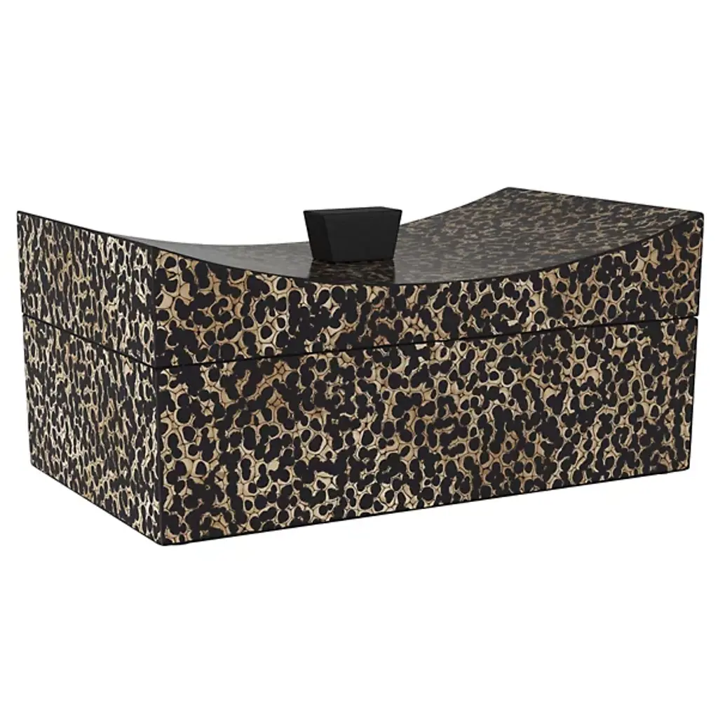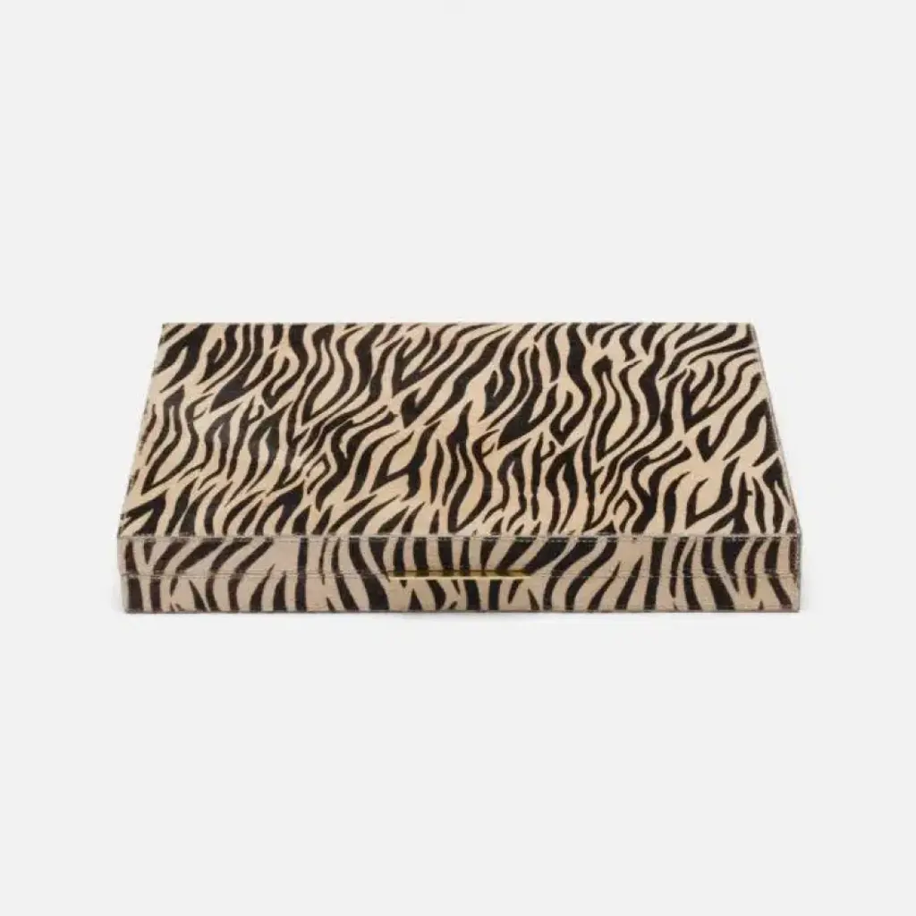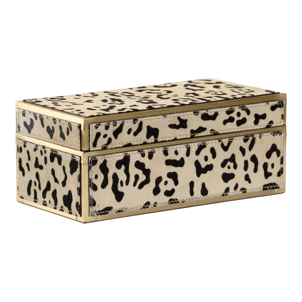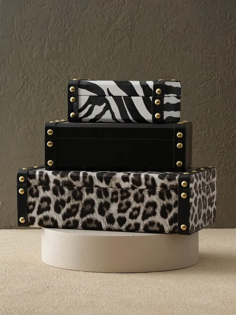 Bold, playful, and luxuriously functional, the Set of Three Leather Storage Boxes with Brass Stud Detail brings fashion-forward flair to your interior styling. Each box in this statement trio is finished in a distinctive animal pattern—zebra and leopard—paired with solid black panels and accented with gold-toned studs for a refined edge. These boxes are perfect for storing accessories, stationery, keepsakes, or simply styled as stacked decorative accents. Whether used together or individually, they blend wild style with timeless craftsmanship.