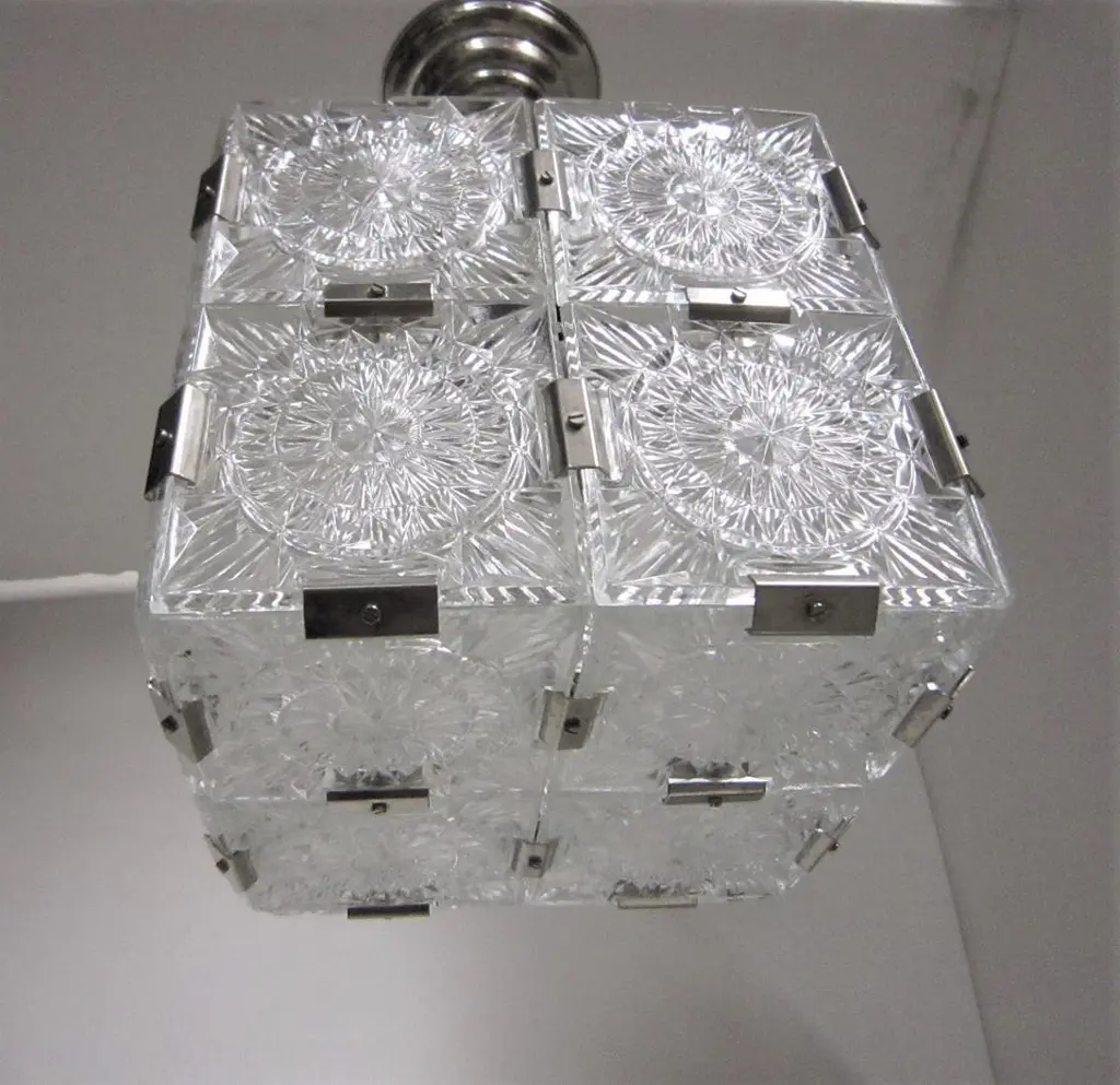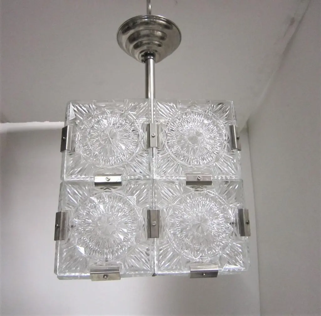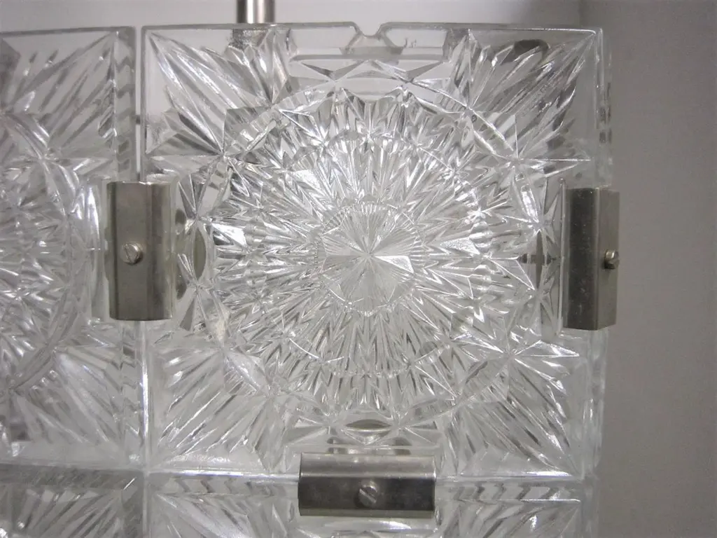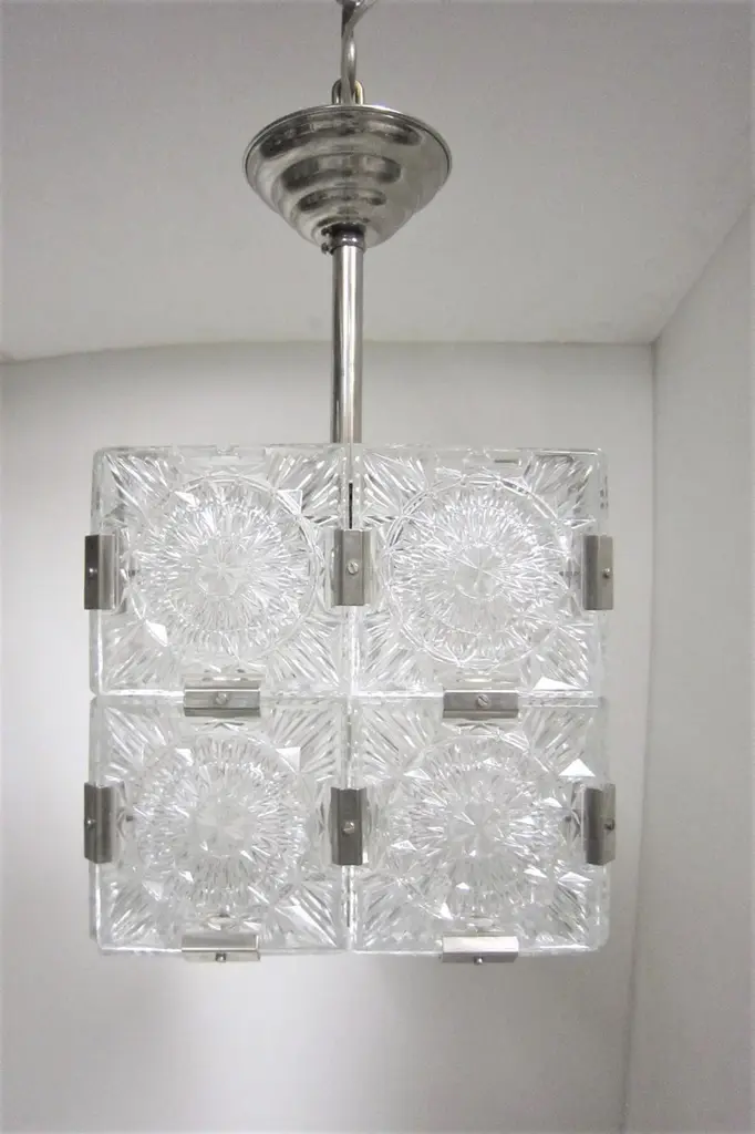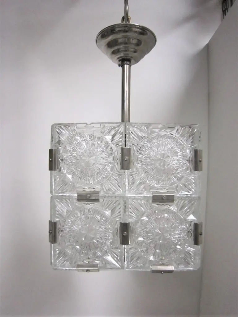 Multiple pendant squares available. Priced here as a set of three.Modernist square chandeliers comprising 20 squares of cut-glass in two tiers formed together with original nickeled bronze brackets. The juxtaposition of the circular patterns in the glass amidst the overall square architectural shape creates a striking harmony. The pendant is dropped from the ceiling on a round single nickeled stem ending in stepped round canopy.The glass is clear in color. The variance seen in the photos are from the camera flash.The chandelier can be custom altered in height i.e.: lengthened or shortened for a surcharge.Holds four candelabra sockets. Can house either incandescent or LED bulbs.Due to periods of historic turmoil, a lot of the glass designers worked for multiple lighting manufacturers. Entire sections of countries were annexed by adjoining countries. Borders changed. Czechoslovakia was under German occupation and rule. After the war, from 1948-1990, it became part of the Eastern Bloc. As a socialist and satellite state of the Soviet Union, it had an economy of command where rules, production … were determined and set by the government.In 1958, Czechoslovakia exhibited in the Brussels World Fair and gained world -wide attention for using modern materials of steel, glass and plastic. The country even won the main and several other prizes for its lights. This new style of lighting became known as the Brussels style, a symbol of the golden decade of progress, reform and political liberation. But in 1968, the Warsaw Pact consisting of the Soviet Union, Bulgaria, Poland, Hungary invaded with the intention to forcibly halt the reforms. East Germany canceled and pulled out of the pact hours before the operation.Very good condition, newly wired for U.S. specs.Slight abrasions, barely visible pitting / wear on nickeled hardware clips commensurate with age.Lantern style, Moderne, Modernist, midcentury, Italian design, hallway fixtures, bathroom, entry foyer.