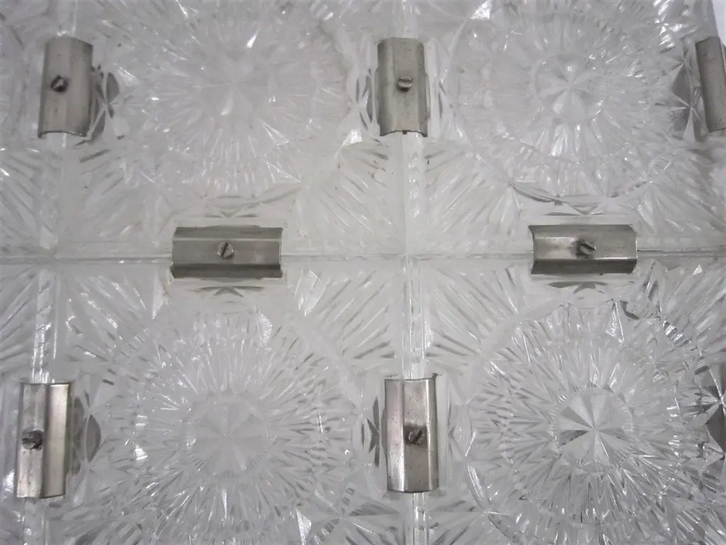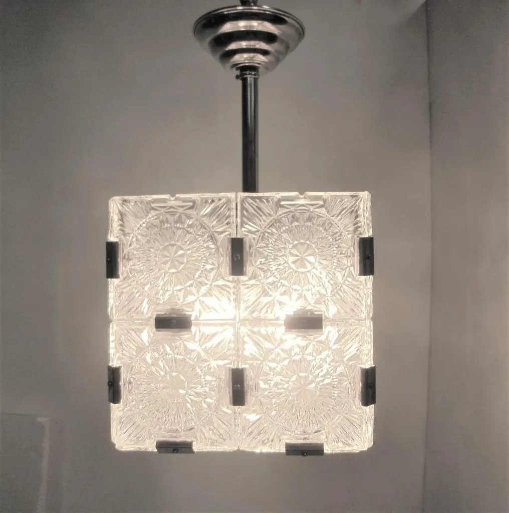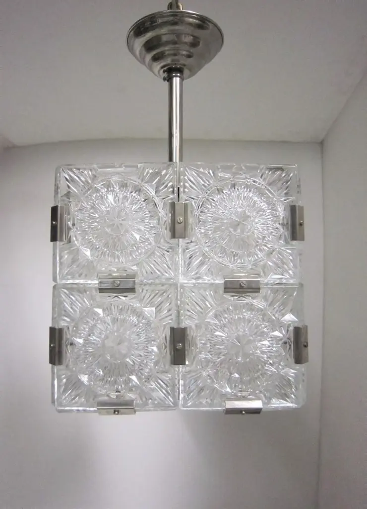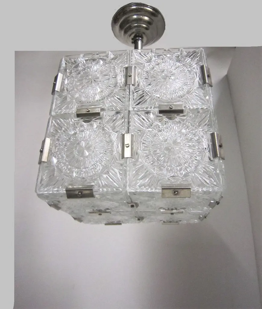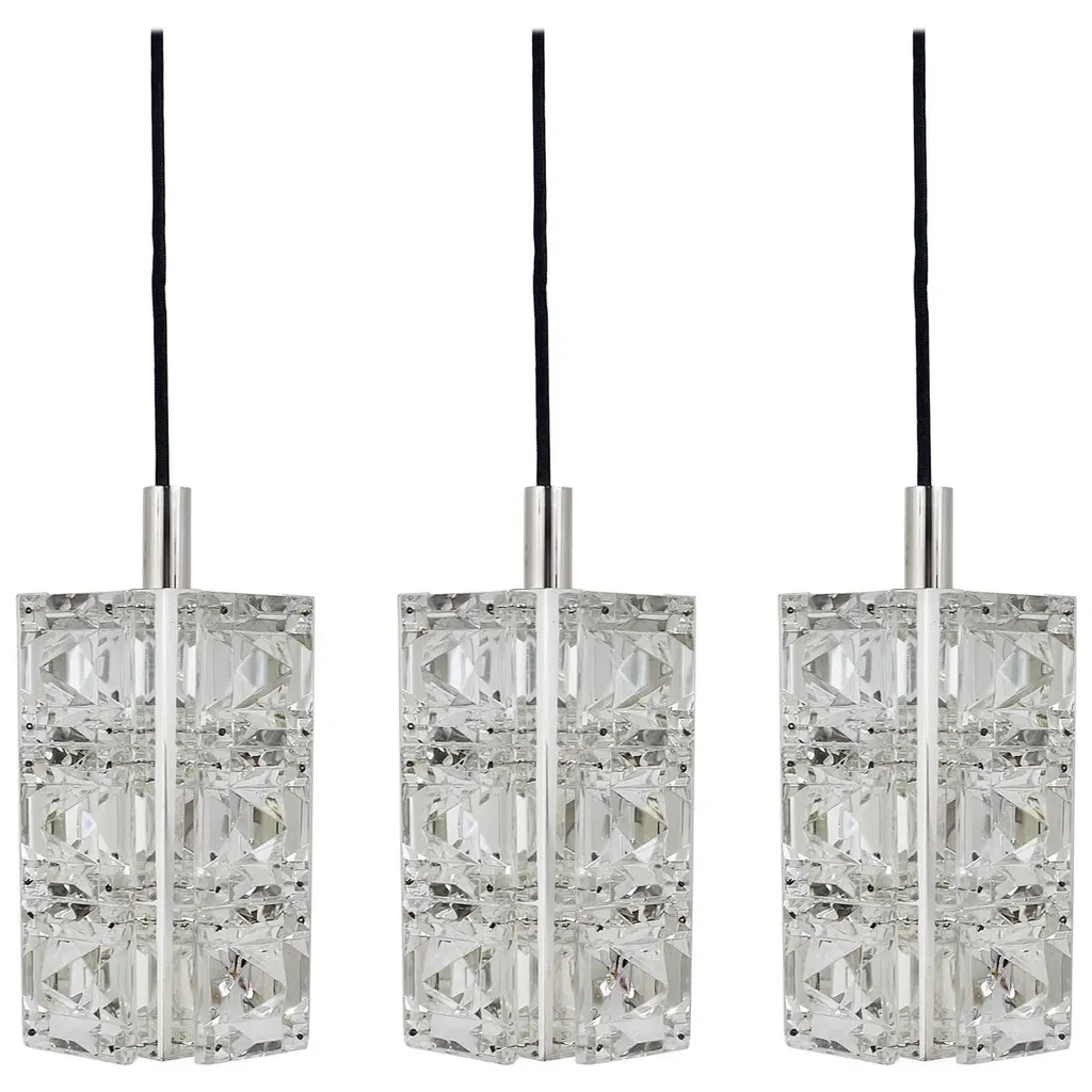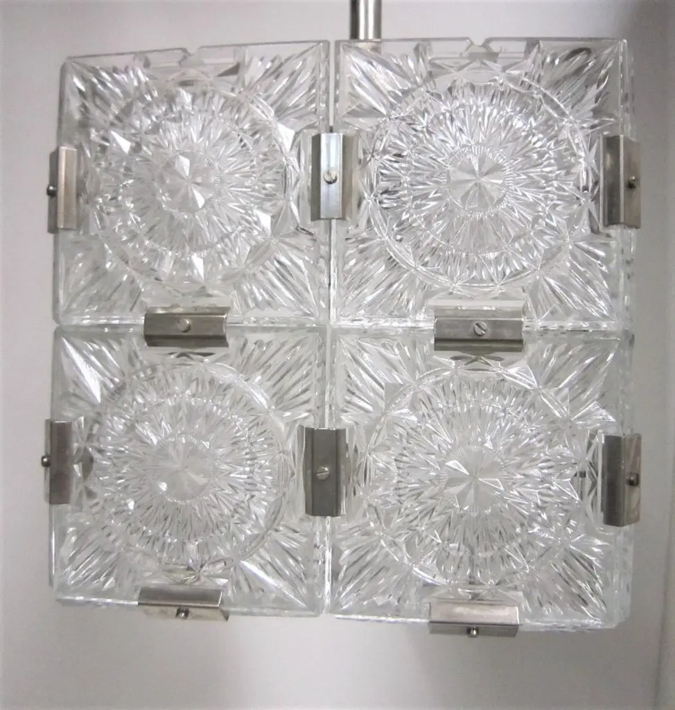 Multiple pendant squares available. Priced here as a set of three.Modernist square chandeliers comprising 20 squares of cut-glass in two tiers formed together with original nickeled bronze brackets. The juxtaposition of the circular patterns in the glass amidst the overall square architectural shape creates a striking harmony. The pendant is dropped from the ceiling on a round single nickeled stem ending in stepped round canopy.The glass is clear in color. The variance seen in the photos are from the camera flash.The chandelier can be custom altered in height i.e.: lengthened or shortened for a surcharge.Holds four candelabra sockets. Can house either incandescent or LED bulbs.Due to periods of historic turmoil, a lot of the glass designers worked for multiple lighting manufacturers. Entire sections of countries were annexed by adjoining countries. Borders changed. Czechoslovakia was under German occupation and rule. After the war, from 1948-1990, it became part of the Eastern Bloc. As a socialist and satellite state of the Soviet Union, it had an economy of command where rules, production … were determined and set by the government.In 1958, Czechoslovakia exhibited in the Brussels World Fair and gained world -wide attention for using modern materials of steel, glass and plastic. The country even won the main and several other prizes for its lights. This new style of lighting became known as the Brussels style, a symbol of the golden decade of progress, reform and political liberation. But in 1968, the Warsaw Pact consisting of the Soviet Union, Bulgaria, Poland, Hungary invaded with the intention to forcibly halt the reforms. East Germany canceled and pulled out of the pact hours before the operation.Very good condition, newly wired for U.S. specs.Slight abrasions, barely visible pitting / wear on nickeled hardware clips commensurate with age.Lantern style, Moderne, Modernist, midcentury, Italian design, hallway fixtures, bathroom, entry foyer.