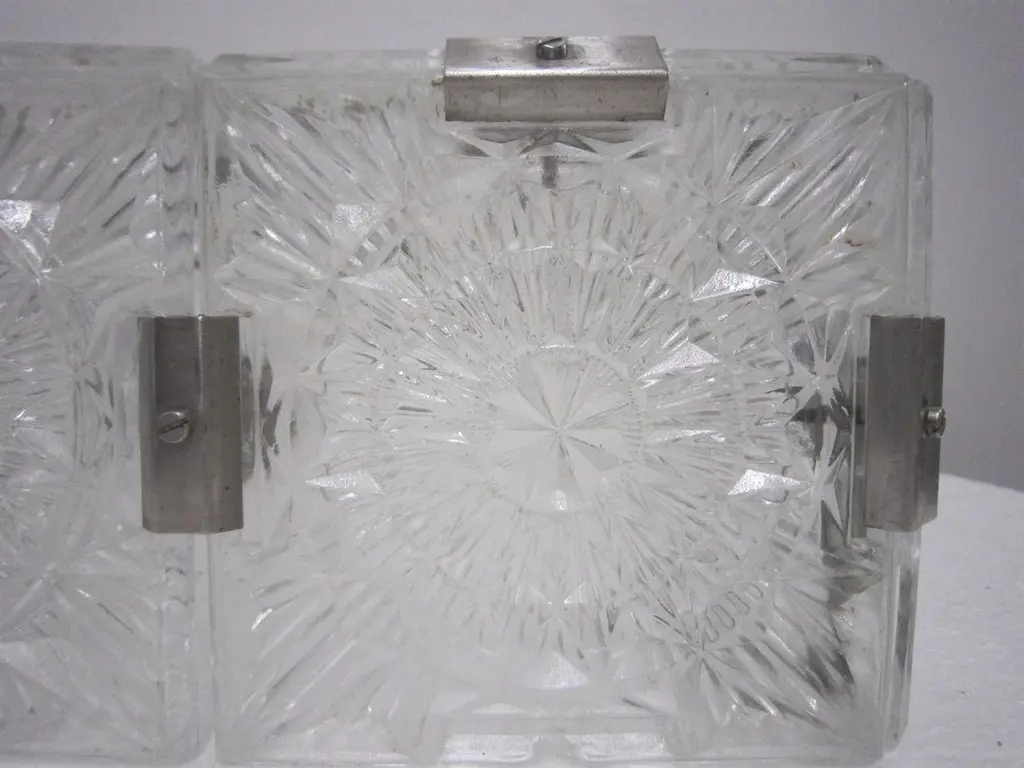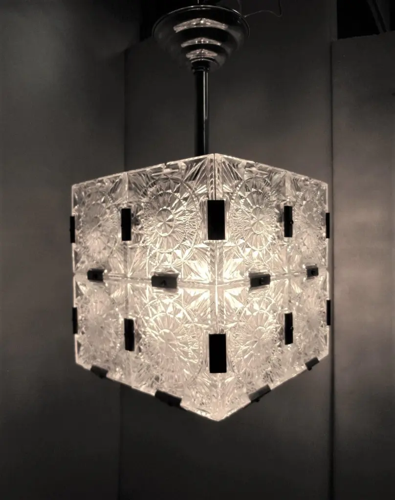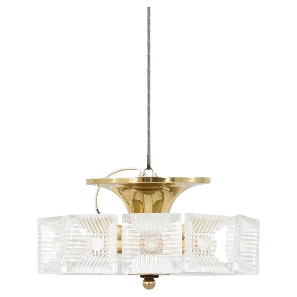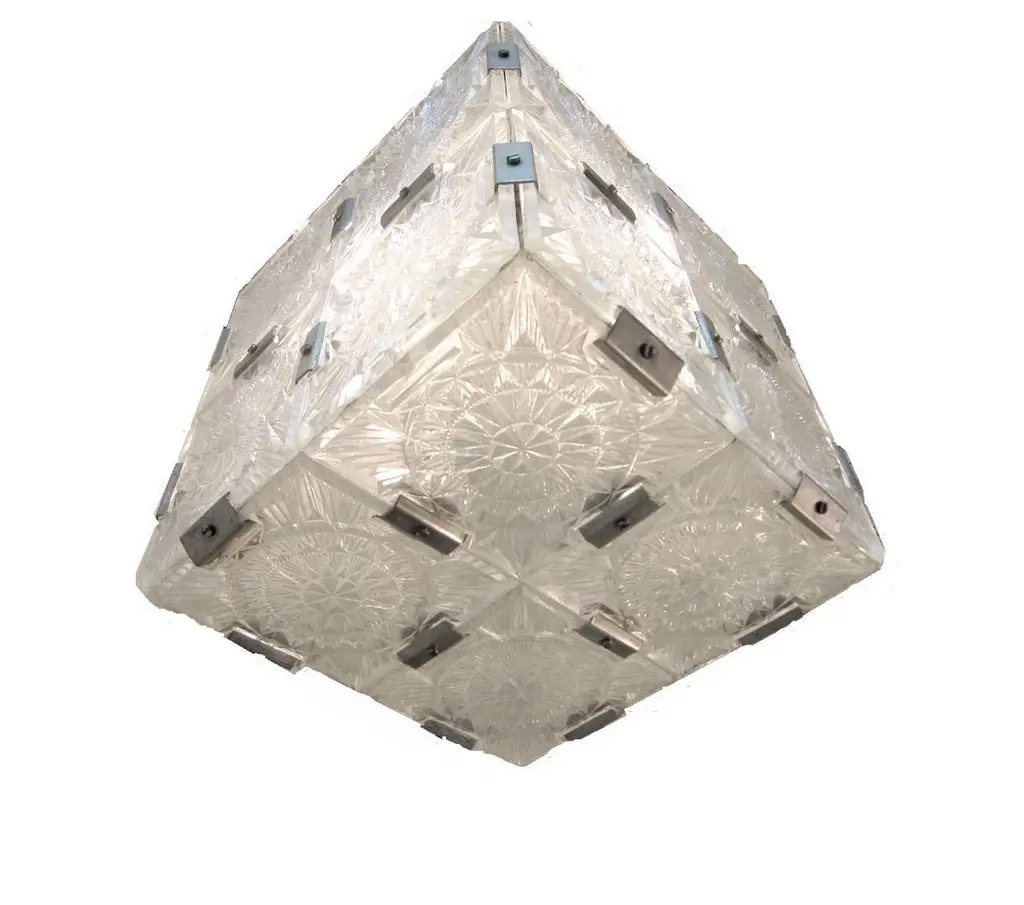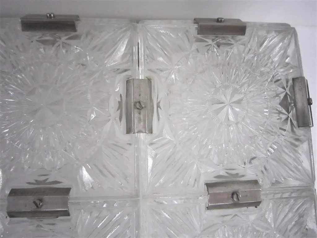 Multiple pendant squares available. Priced here as a set of three.Modernist square chandeliers comprising 20 squares of cut-glass in two tiers formed together with original nickeled bronze brackets. The juxtaposition of the circular patterns in the glass amidst the overall square architectural shape creates a striking harmony. The pendant is dropped from the ceiling on a round single nickeled stem ending in stepped round canopy.The glass is clear in color. The variance seen in the photos are from the camera flash.The chandelier can be custom altered in height i.e.: lengthened or shortened for a surcharge.Holds four candelabra sockets. Can house either incandescent or LED bulbs.Due to periods of historic turmoil, a lot of the glass designers worked for multiple lighting manufacturers. Entire sections of countries were annexed by adjoining countries. Borders changed. Czechoslovakia was under German occupation and rule. After the war, from 1948-1990, it became part of the Eastern Bloc. As a socialist and satellite state of the Soviet Union, it had an economy of command where rules, production … were determined and set by the government.In 1958, Czechoslovakia exhibited in the Brussels World Fair and gained world -wide attention for using modern materials of steel, glass and plastic. The country even won the main and several other prizes for its lights. This new style of lighting became known as the Brussels style, a symbol of the golden decade of progress, reform and political liberation. But in 1968, the Warsaw Pact consisting of the Soviet Union, Bulgaria, Poland, Hungary invaded with the intention to forcibly halt the reforms. East Germany canceled and pulled out of the pact hours before the operation.Very good condition, newly wired for U.S. specs.Slight abrasions, barely visible pitting / wear on nickeled hardware clips commensurate with age.Lantern style, Moderne, Modernist, midcentury, Italian design, hallway fixtures, bathroom, entry foyer.