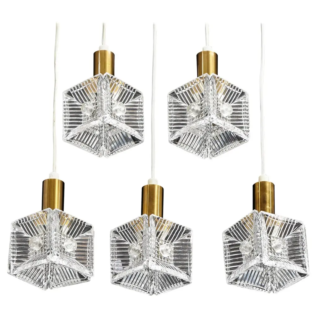 Set Of Three Original Box Cube Pendant Lights, Cut Glass With Nickeled Clips