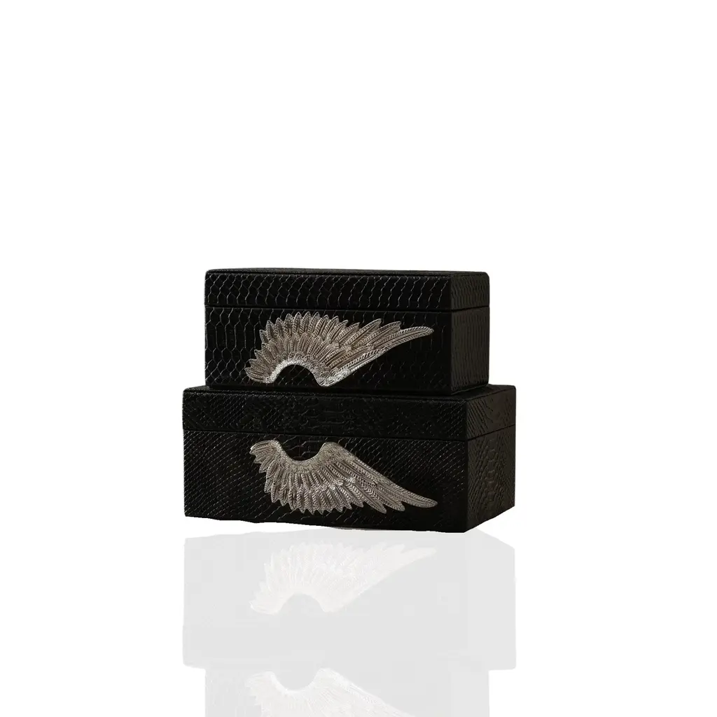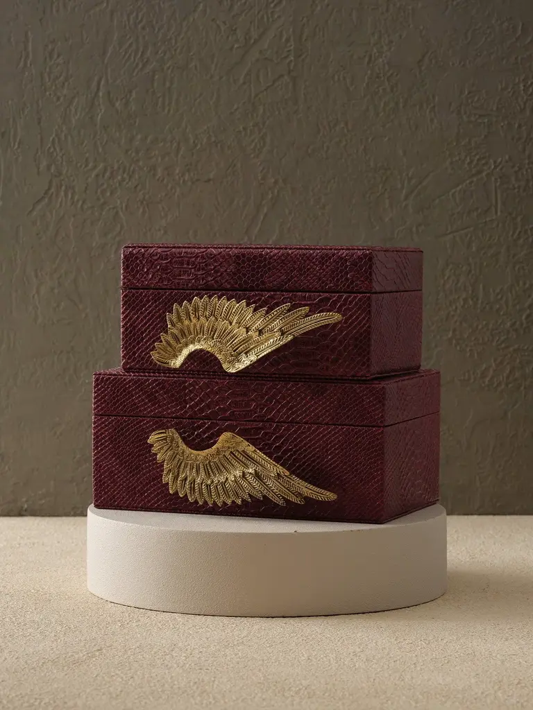 Elevate your home organization with this striking set of Leather Storage Boxes, adorned with sculptural brass wing handles for a dramatic, opulent finish. Wrapped in textured burgundy faux leather with a snakeskin pattern, these boxes merge classic glamour with contemporary design. Ideal for storing jewelry, keys, or cherished keepsakes, they bring both style and symbolism to your interior—representing freedom, elegance, and elevated living.