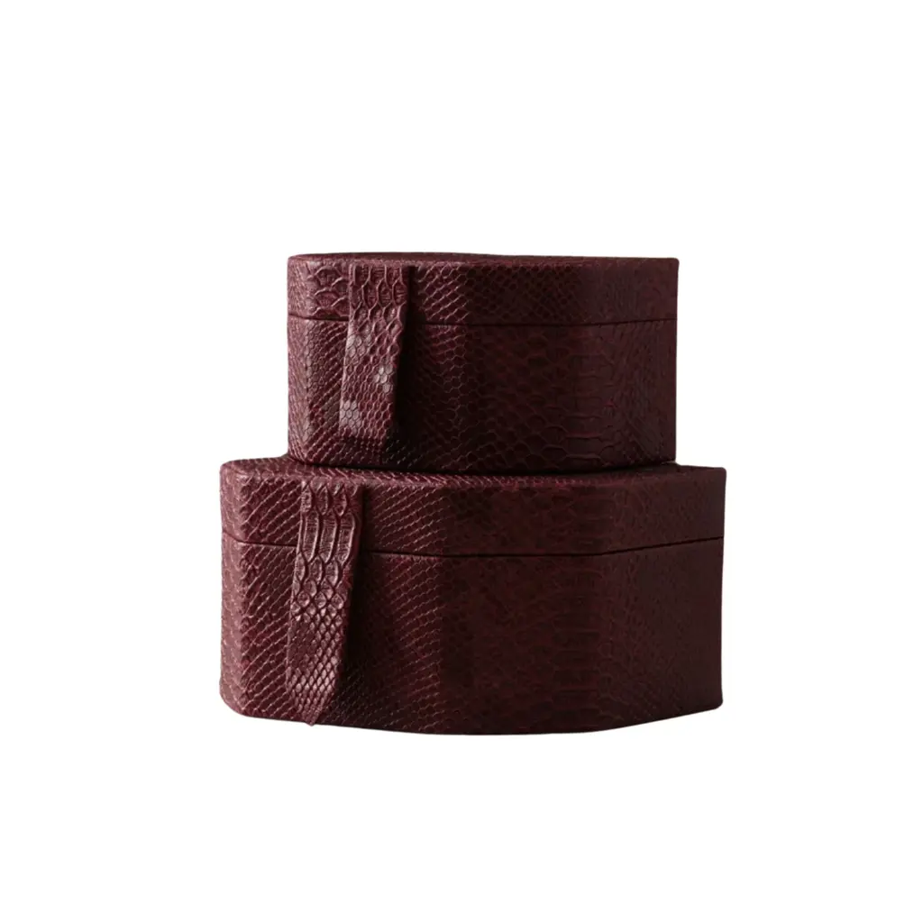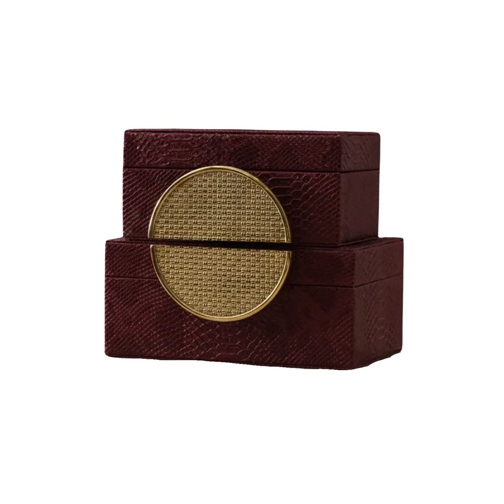 Set Of Two Burgundy Leather Storage Box Set With Brass Wing Handles