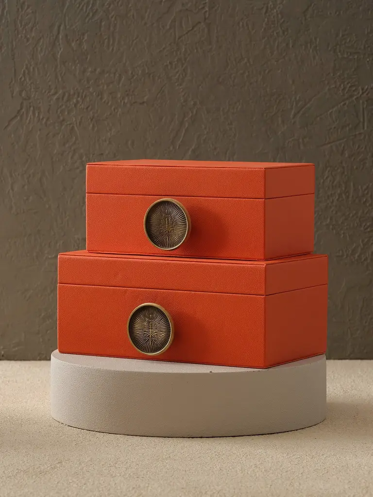 Set Of Two Orange Leather Storage Box Set, Brass Button Detailed