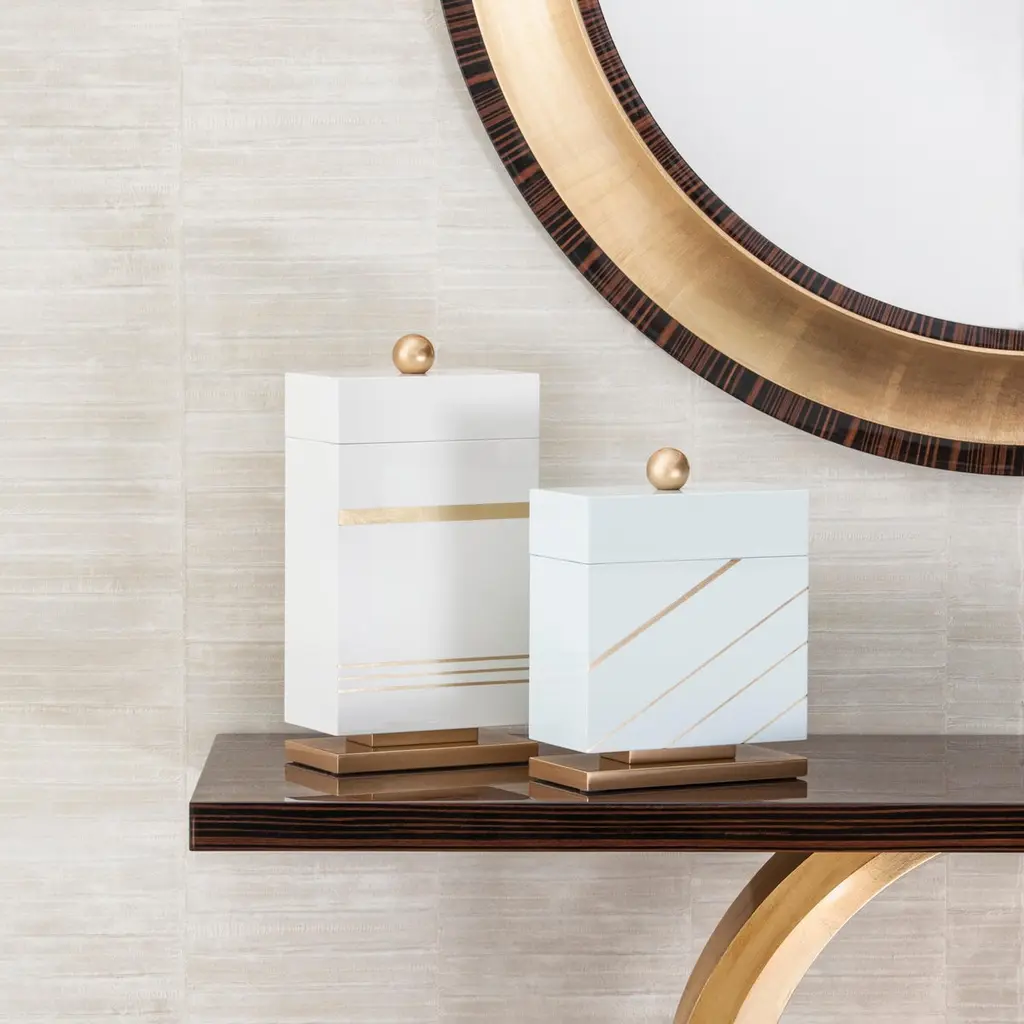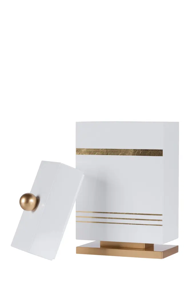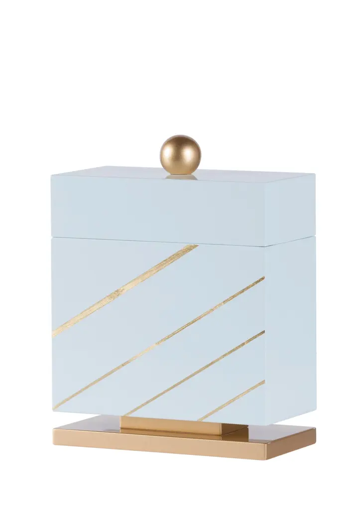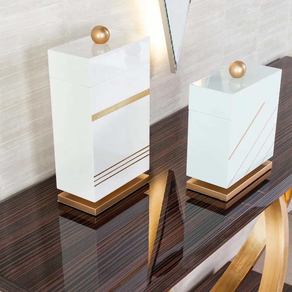 Lanzarote Boxes, Lusitanus Home Collection, Handcrafted in Portugal - Europe by Lusitanus Home.Lanzarote box set includes two wooden boxes, perfect to be displayed together and enrich your room decor.The white and light-blue boxes with gold leaf details applied by hand combine perfectly with the handles and base lacquered and bronze gold-powder.2 Lanzarote Wooden BoxesW.21 x De.12 x H.42cm / W.8,27 x De.4,72 x H.16,54inW.23 x De.12 x H.31cm / W.9,06 x De.4,72 x H.12,2inSet of 2 Wooden Boxes with Lid Lanzarote Material CodesFI043 White lacquer; high-gloss finishFI040 Blueish white lacquer; high-gloss finishFI026 Bronze powder-gold lacquer; high-gloss finishFI001 Gold leaf; high-gloss finishHandcrafted in Portugal - Europe by GreenappleUnique by design, Crafted by peopleFounded in 2005 by Sérgio Rebola and Rute Martins, Greenapple designs and produces in-house luxury furniture for exclusive customers worldwide.Our own in-house production facility allows us to be obsessed with detail, and gives us the freedom to dedicate ourselves to the most demanding tailor-made and customised work. As Rute designs all the unique pieces, Sérgio assures the high-quality standards through the whole process - from design to production; from production to your home. Fine craftsmanship, whether perfected by experienced hands or state-of-the-art machinery is quintessential in delivering top quality experiences.