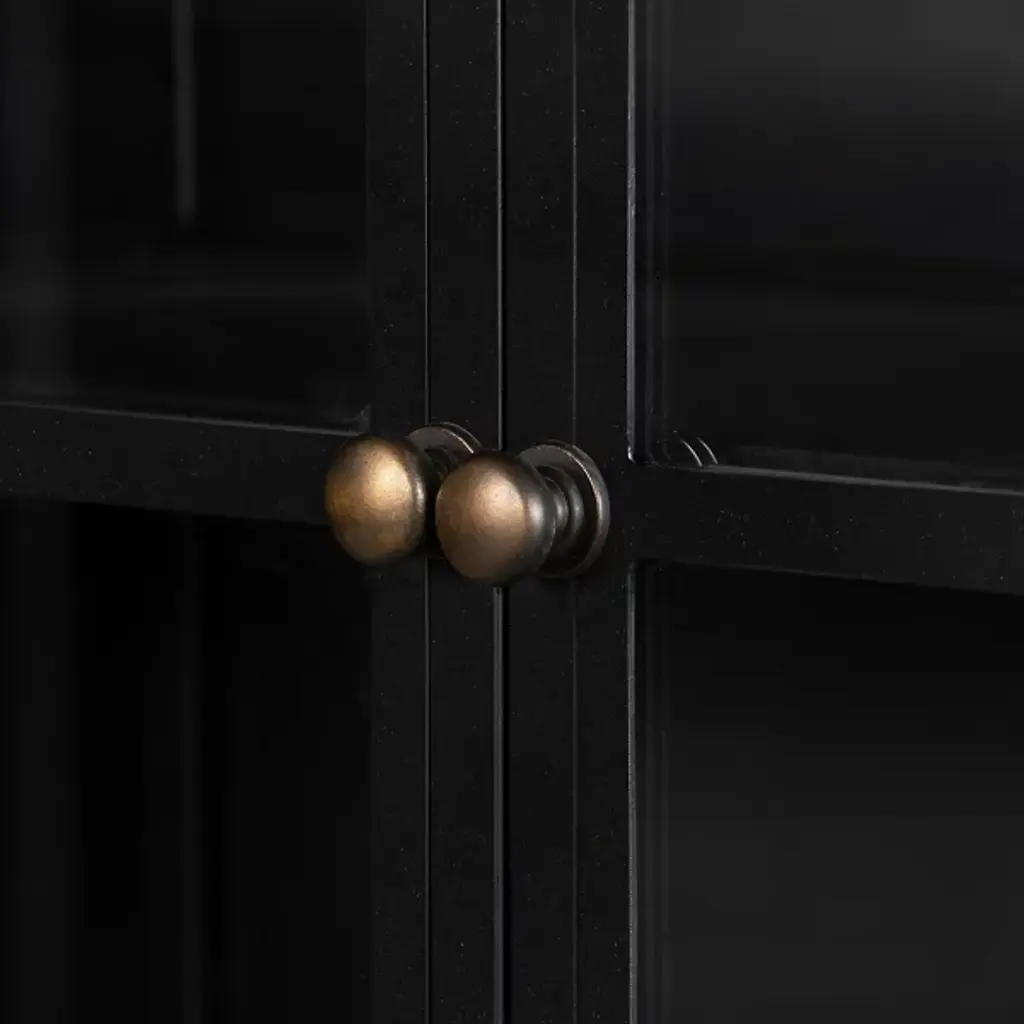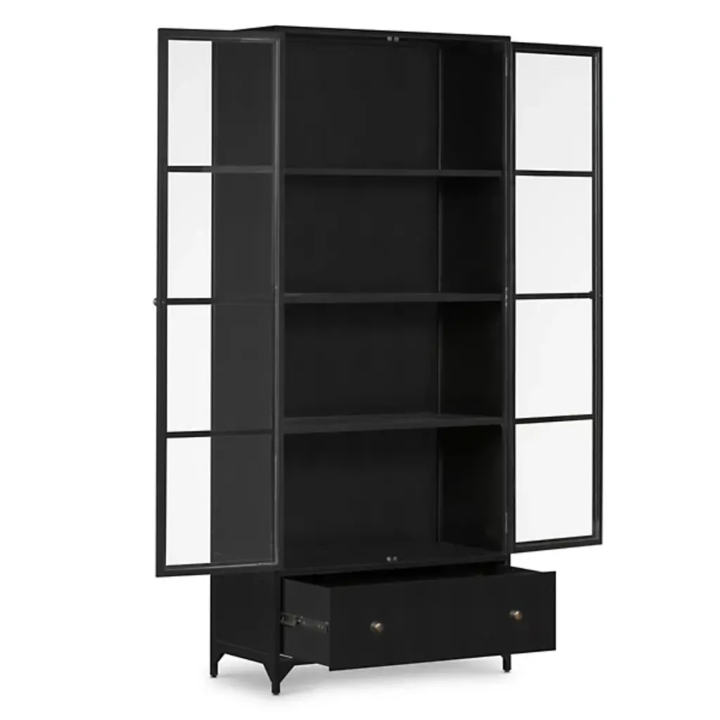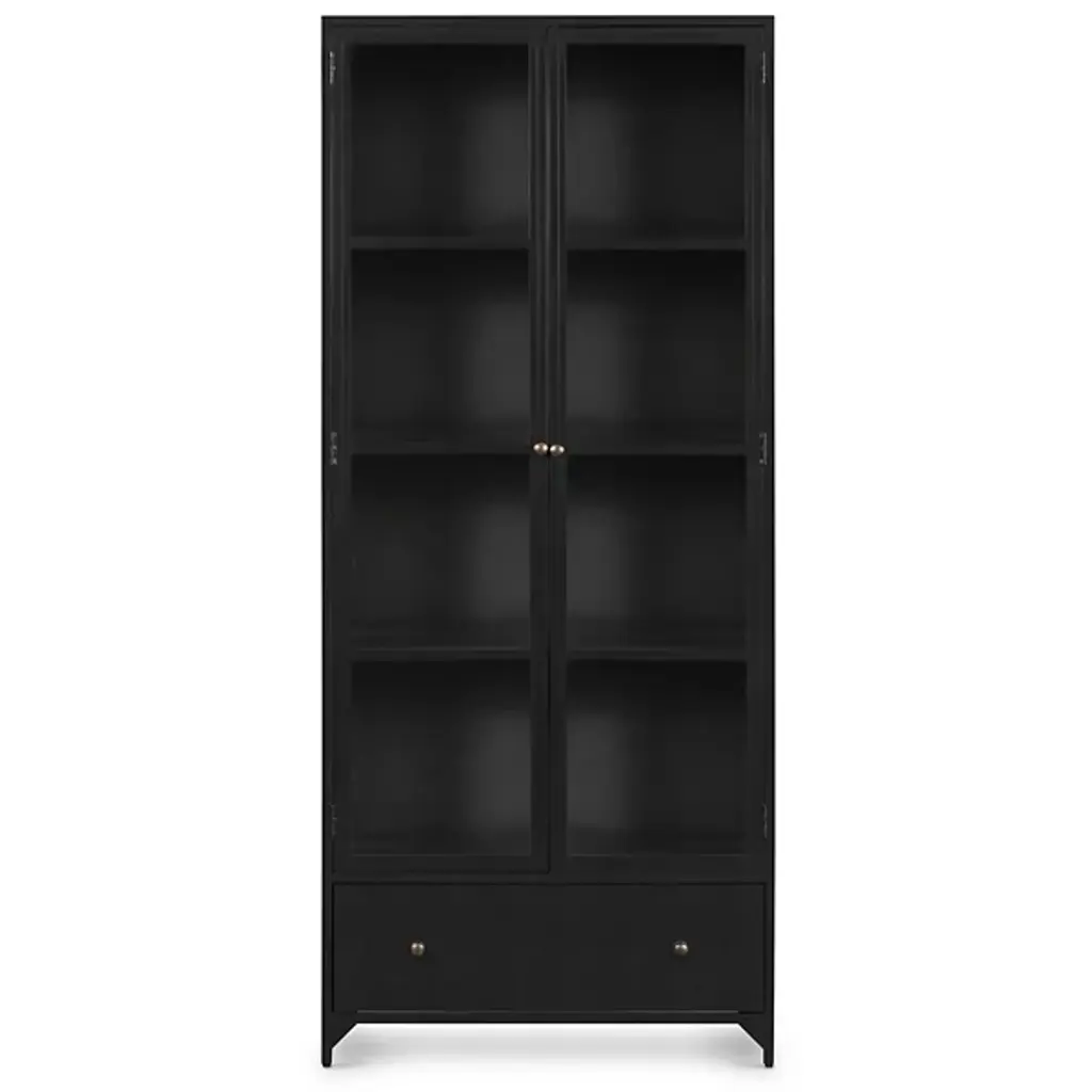 The Shadow Box Cabinet from Four Hands brings modern simplicity to decorative display. Inspired by the traditional shadowbox, this tall and rectangular design commands its surroundings, made from robust solid iron sheeting finished in matte black, creating a bold yet refined presence. Glass-front doors offer a perfect space to showcase accessories, books, or collected treasures on every level, while a spacious lower drawer keeps essentials tucked away. Contrasting brass knobs add a subtle touch of warmth, making this versatile cabinet a stylish storage solution for any setting.