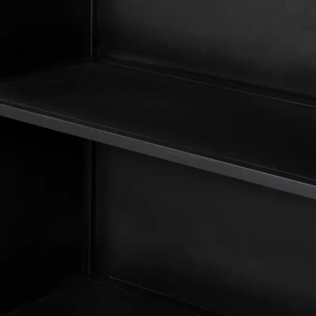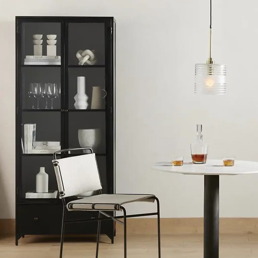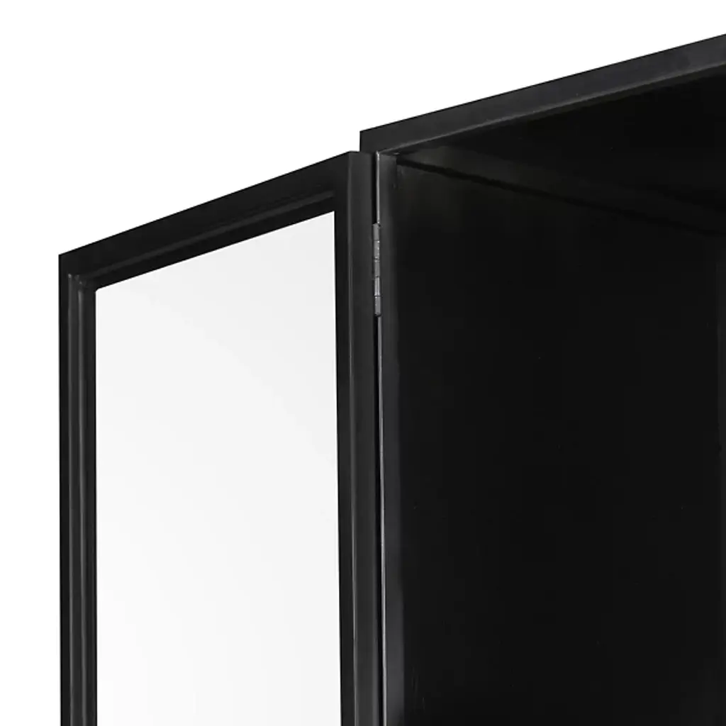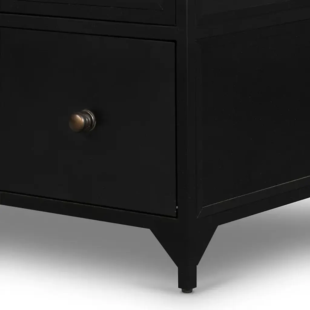 The Shadow Box Cabinet from Four Hands brings modern simplicity to decorative display. Inspired by the traditional shadowbox, this tall and rectangular design commands its surroundings, made from robust solid iron sheeting finished in matte black, creating a bold yet refined presence. Glass-front doors offer a perfect space to showcase accessories, books, or collected treasures on every level, while a spacious lower drawer keeps essentials tucked away. Contrasting brass knobs add a subtle touch of warmth, making this versatile cabinet a stylish storage solution for any setting.