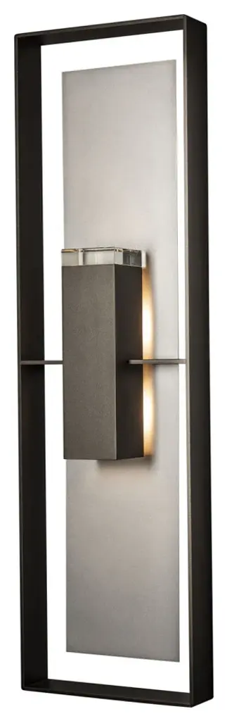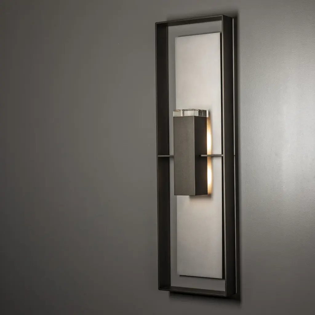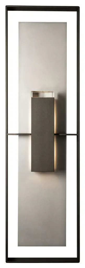 Welcome! This large scale outdoor wall-mounted fixture has an aluminum frame and backplate and is offered with a two-tone finish from among our robust, AAMA 2604-rated Coastal Outdoor Finish options. Standing at nearly 4ft (45"�) high, this Dark Sky Friendly Shadow Box sconce has a modern geometry and aluminum construction that is both lightweight and durable. Perfect for a variety of architectural exteriors.Features:Lifetime Limited Warranty when installed in residential settingFeatures a robust Coastal Outdoor finish specifically formulated to resist some of the harshest environmental conditions. Coastal oil rubbed bronze, coastal bronze, coastal dark smoke, and coastal burnished steel finishes are AAMA-2604 rated making these among the most durable, resistant finishes available for corrosion resistance, colorfastness, and durability. these coatings deliver exceptional hardness, scratch & mar resistance for enhanced performance in seacoast environments.ADA compliant direct wire wall sconce with finish and accent. Choose a finish for the fixture core and an accent for the backplate. Includes optical diffuser.AAMA 2604-ratedAll Hubbardton Forge Coastal Outdoor finishes are AAMA-2604 certified, meaning they are among the most durable, resistant finishes available.Handcrafted in Vermont, USADark Sky FriendlyRequires 2 A15 E26 Medium Replaceable Bulb (120 max wattage) (Not Included)