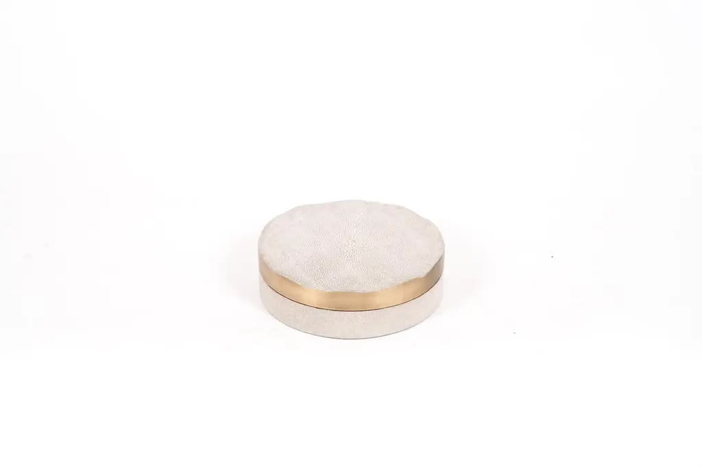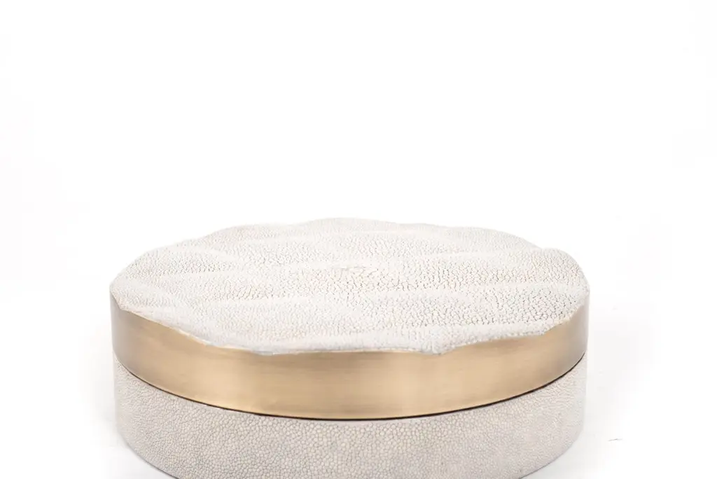 The Paris based label has distinguished themselves since their launch, with their iconic use of shagreen mixed with brass and other exotic materials. All furniture is handcrafted by skilled artisans, ultimately making each piece unique, designed in Paris and produced in the Philippines.The Coco box is a sophisticated and luxurious accent piece with it’s exquisite quilted details. The exterior is inlaid in black pen shell with a bronze-patina brass frame and the interior is inlaid in gemelina wood. This listing is for the medium size, available in a large size and different finishes, see images at end of slide. The dimensions of this piece are 18 x 18 x 6.5 cm All Kifu Paris pieces are handmade by artisans, ultimately making each piece unique. Custom color or sizing available on request. Wipe clean with soft dry cloth.Although inspired by her parents, her collection of Home Accessories and Furniture is a distinct identity of its own. Kifu uses handmade techniques of elaborate inlay patterns of shagreen, shells, semi-precious stones, materials she experienced as a child growing up in her parent’s studio, but interpreted in a younger quirkier way reflecting her youth. From her "jewelry inspired knobs" on decorative boxes, gold bar boxes and an extravagant inlay pattern mix of shagreen and shell inspired by galactic constellations, as seen on her enormous round mirror, is refreshing to see. Kifu embodies whimsical elements throughout her collection and is not afraid to be daring and unexpected in her approach to design. All shagreen-covered items should be kept out of direct sunlight, color variants may occur on the stingray and other exotic finishes, but this showcases the Parisian label's commitment to creating authentic luxurious products using natural components.