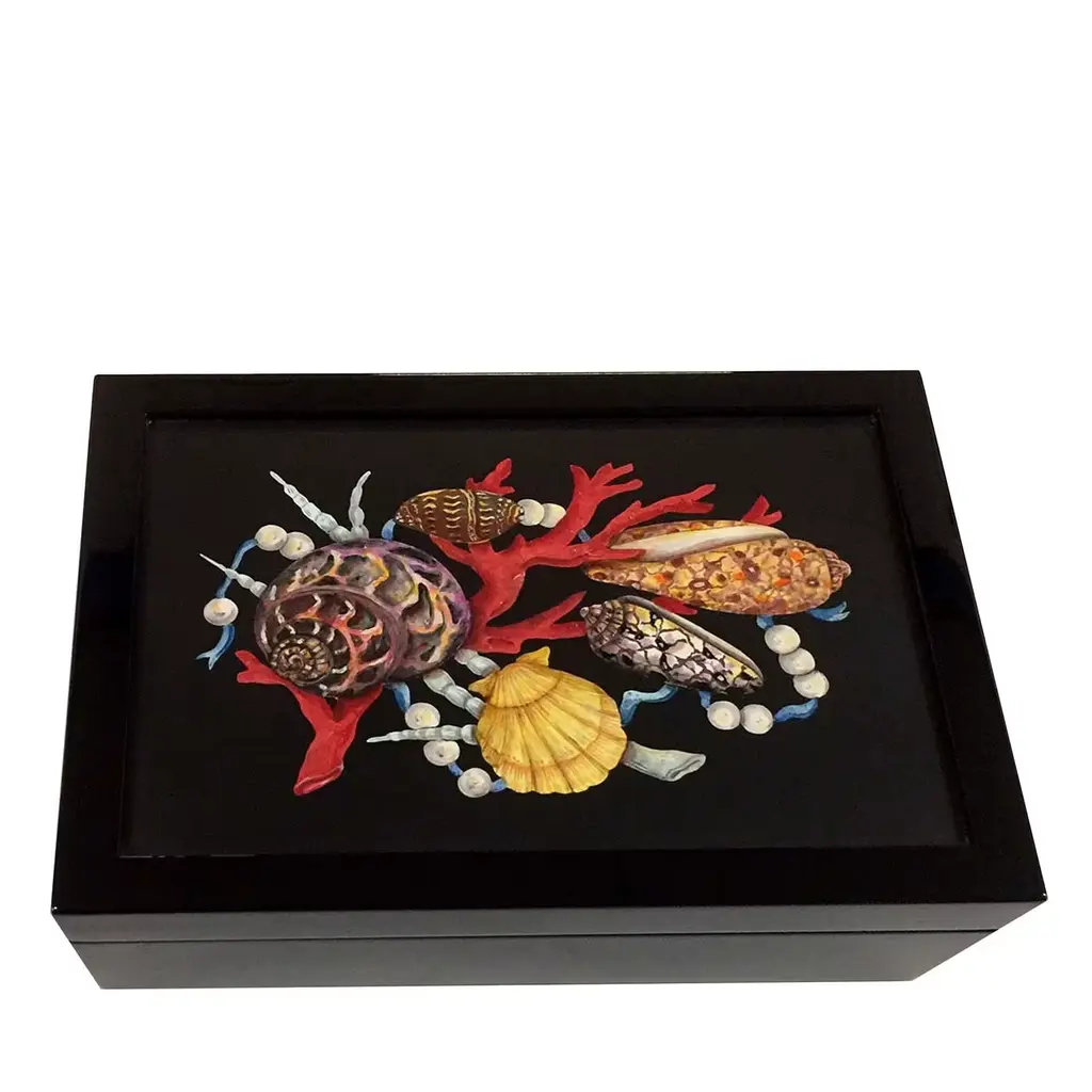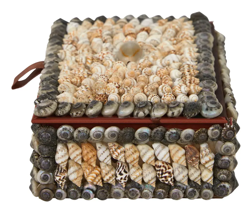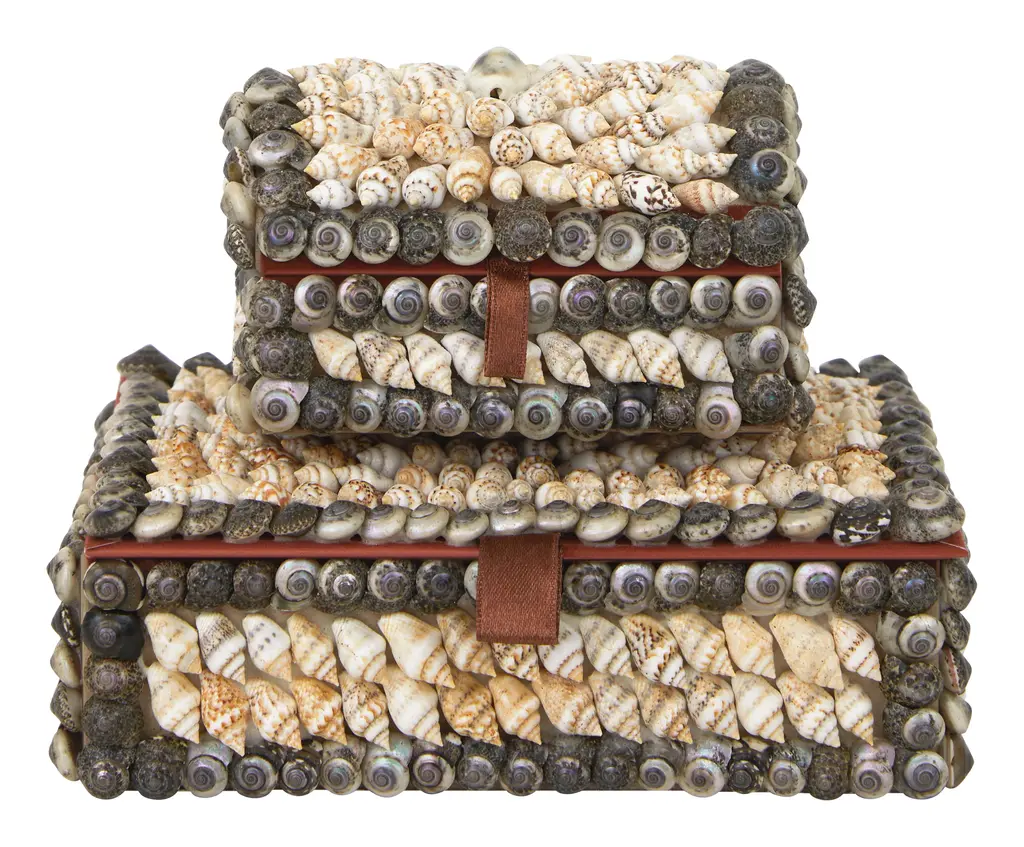 Safely stow away your treasures and trinkets in our unbelievably charming Shell Boxes. Simple in shape, these coastal-inspired vessels are completely covered with tiny, cream-colored tulip shells, bordered by a row of dark grey moon shells for a bit of eye-catching contrast. Bursting with texture on their exteriors, they feature luxe sienna velvet lining on their interiors, creating a soft landing spot for whatever precious items you’re stashing inside. Perfect for adding a beachy touch to any tabletop vignette, we love our Shell Boxes for concealing clutter on a living room coffee table or for storing jewelry and other everyday essentials on a bedroom dressing table. •natural shells •sienna velvet lined interior •each is unique dimensions •small: approximately 4"W x 3"D x 2.5"H •medium: approximately 6"W x 4"D x 2"H