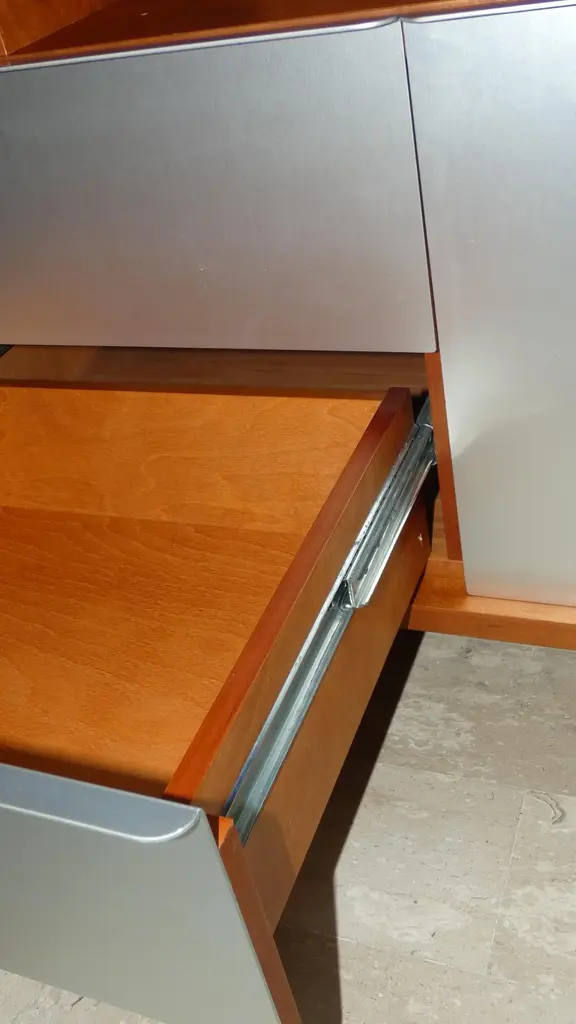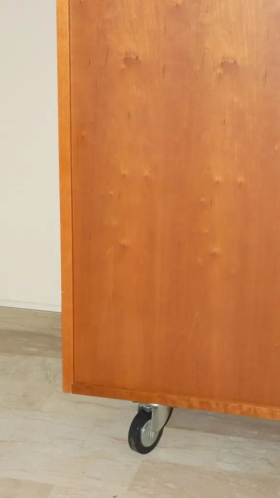 In the philosophy of De Padova, which also meets the approach of Magistretti, furnishings must adapt to different contexts, so the Shigeto Box version, in the form of a bookcase, is the solution for furnishing a space intended to be multifunctional, whether it is a living room, kitchen or study/office and hobby area\. the bookcase has a cherry structure, and is completely open in the upper part. Using a series of dividing panels, which can be placed in different positions, Shigeto box is able to modify its grid structure, and therefore to contain anything\. whether books, ornaments or electronic elements. It is enriched in the lower part by four external drawers in silver anodized aluminum, two of which are extremely capacious. The back is in completely finished wood, the bookcase can therefore also act as a partition to divide the spaces. Moving is really simple thanks to the swivel wheels with antistatic rubber ring. The front wheels are equipped with a locking system. The conditions are excellent, there are only a few very light signs (no chipping) in some support areas (see photo with red circle). 2 pieces are available. This piece has an attribution mark, I am sure that it is completely authentic and take full responsibility for any authenticity issues arising from misattribution