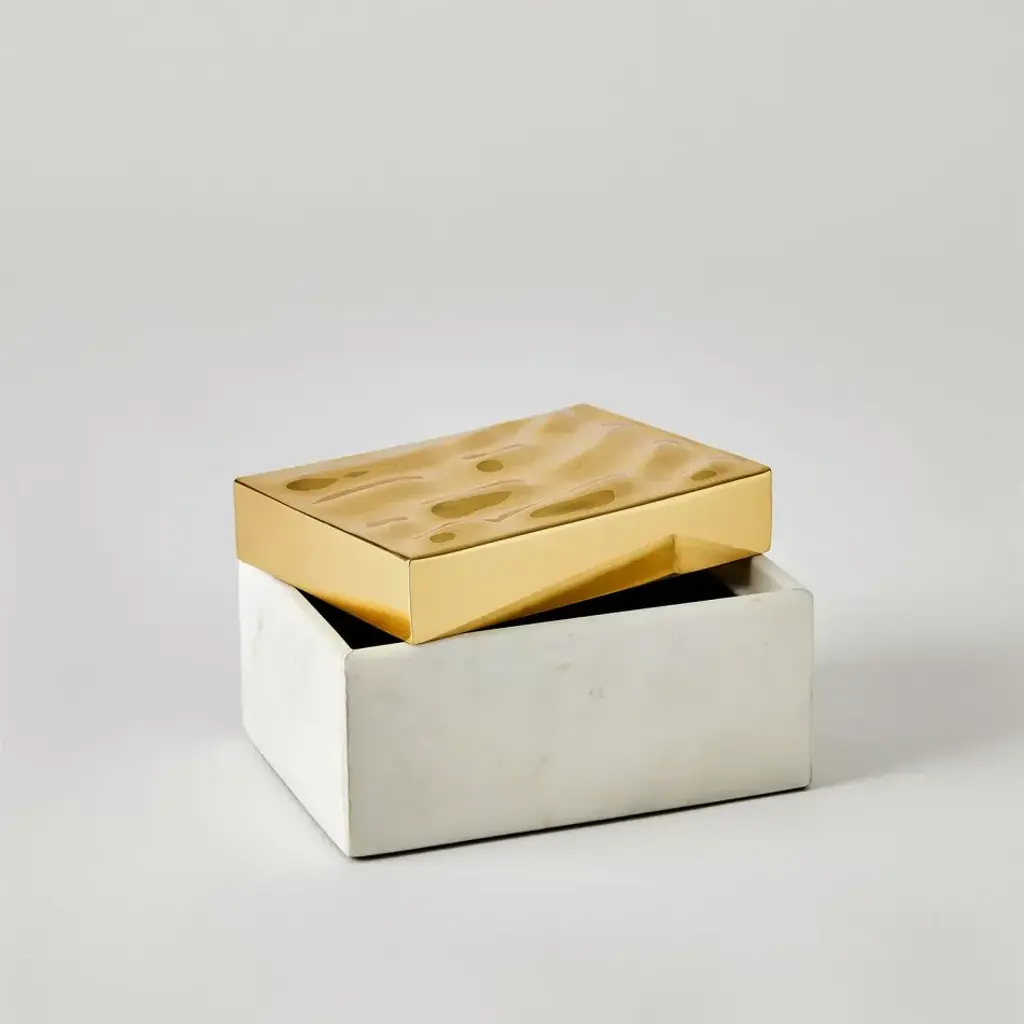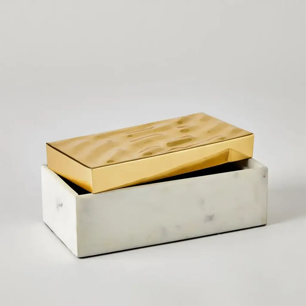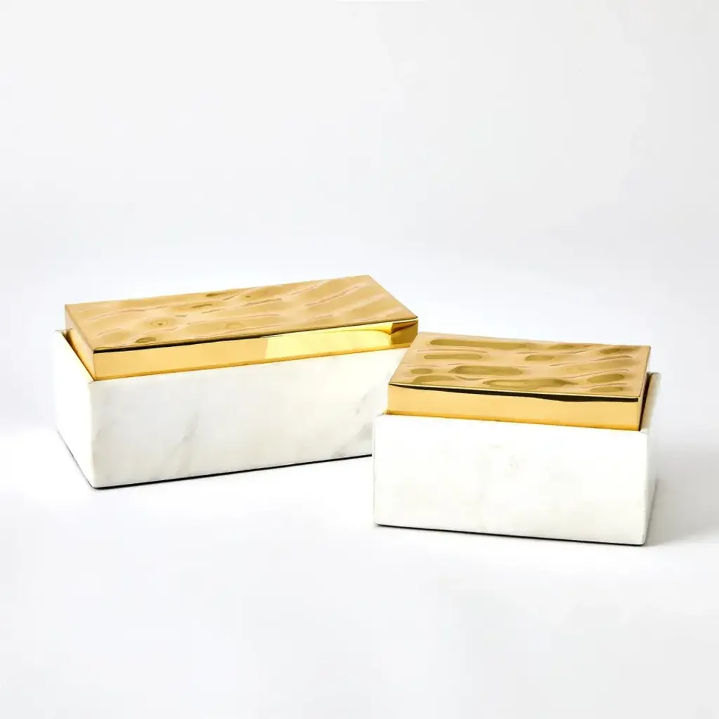 Elevate your decor with the captivating Shimmer Boxesan exquisite embodiment of the serene beauty found in calm waters. These boxes are meticulously handcrafted from brass featuring a radiant shiny brass finish and luxurious white marble base. From a fashion forward perspective, Global Views offers accessories, furniture, statement lighting, and an assortment of rugs and mirrors to add beauty and joy to your home.