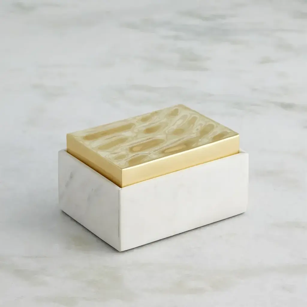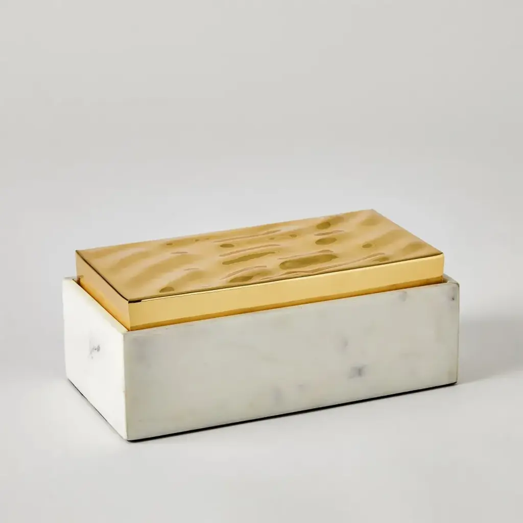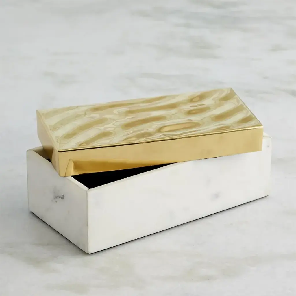 Elevate your decor with the captivating Shimmer Boxesan exquisite embodiment of the serene beauty found in calm waters. These boxes are meticulously handcrafted from brass featuring a radiant shiny brass finish and luxurious white marble base. From a fashion forward perspective, Global Views offers accessories, furniture, statement lighting, and an assortment of rugs and mirrors to add beauty and joy to your home.