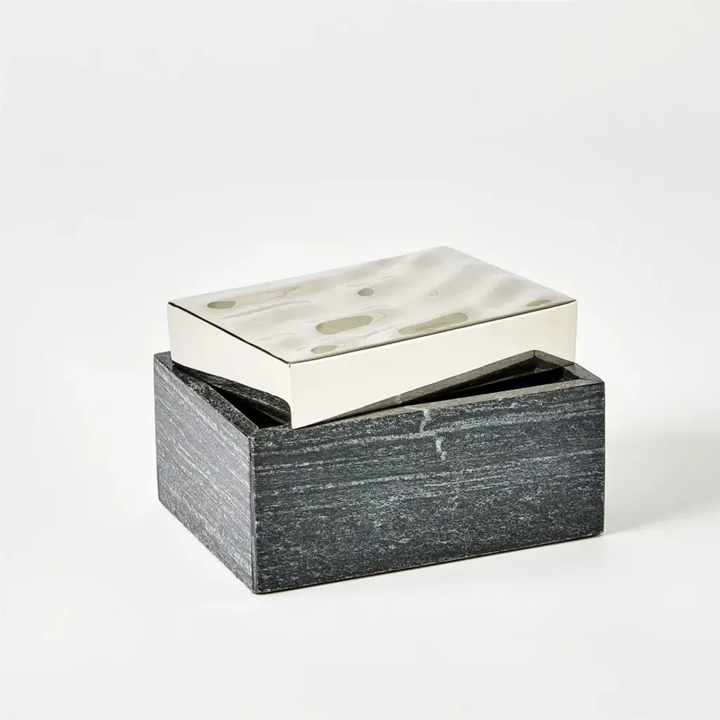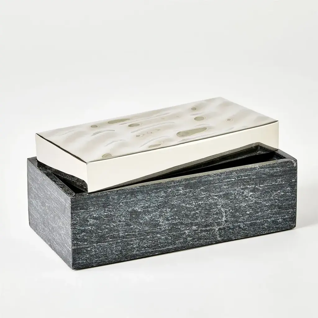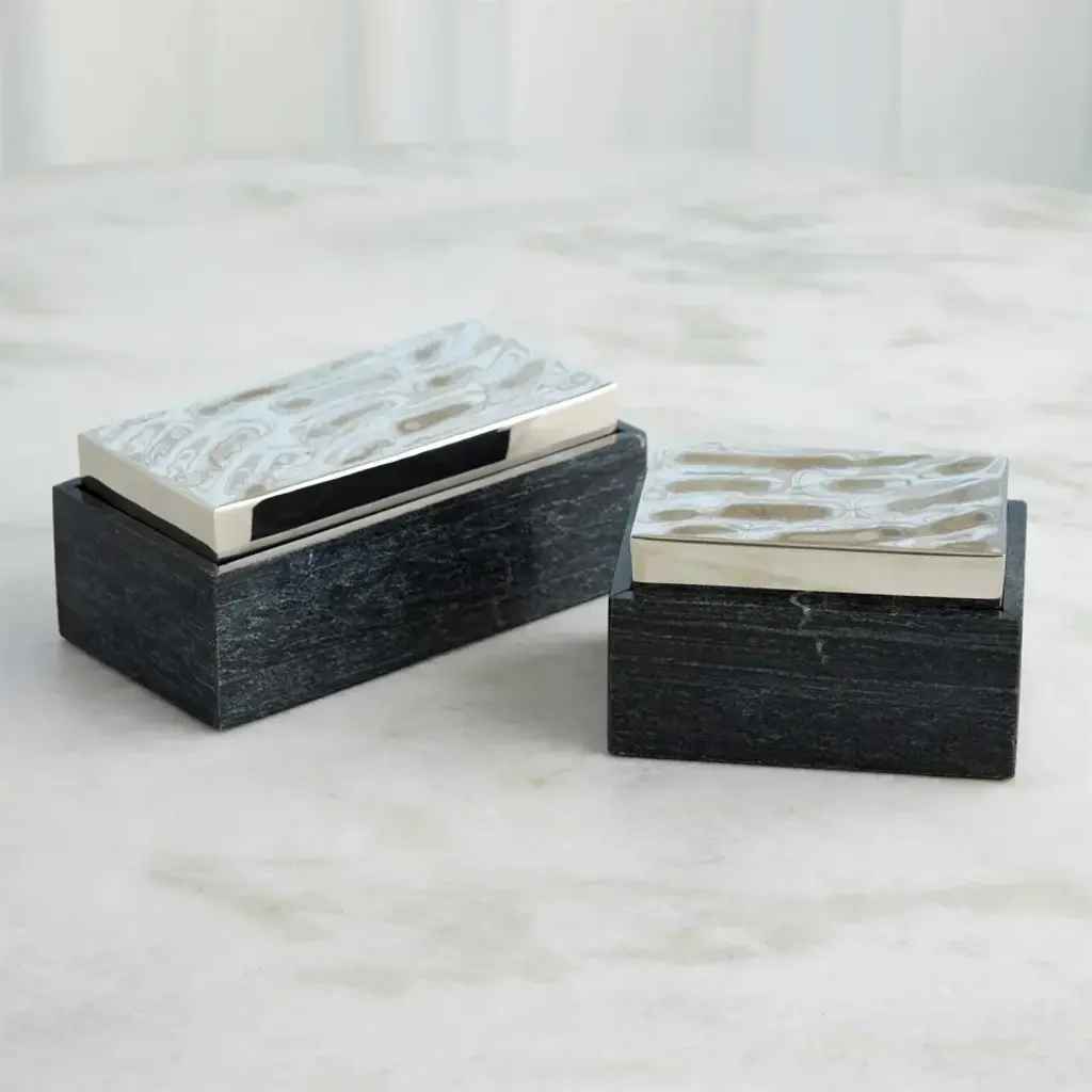 Elevate your decor with the captivating Shimmer Boxesan exquisite embodiment of the serene beauty found in calm waters. These boxes are meticulously handcrafted from nickel-plated brass featuring a radiant shiny nickel finish and luxurious black marble bases. As marble is a natural product, please be aware that there will always be variations in veining and color. This is to be expected and makes every marble product uniquely your own. From a fashion forward perspective, Global Views offers accessories, furniture, statement lighting, and an assortment of rugs and mirrors to add beauty and joy to your home.