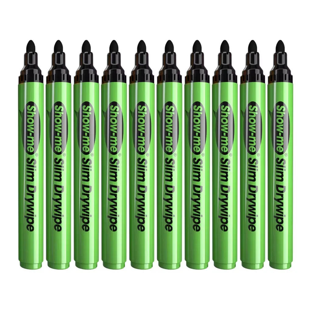 Show-me® Medium Tip Slim Barrel Dry Erase Markers, Black, Box of 10 | Show-me dry erase markers are purpose-built for the classroom and trusted by thousands of schools worldwide. Designed with young learners in mind, each marker features a Komfigrip slim barrel that fits comfortably in small hands, making them ideal for frequent use in busy educational environments. The extra-hard nib resists splaying, while a clever nib-stop prevents the tip from being pushed into the barrel, ensuring long-lasting performance. Safety is a top priority—these markers use low-odor, xylene-free ink and are equipped with airflow caps to reduce risk if accidentally swallowed. With a 72-hour cap-off time, they resist drying out even if left uncapped. This pack contains 10 medium tip black dry erase markers, combining durability, safety, and functionality in every stroke.
