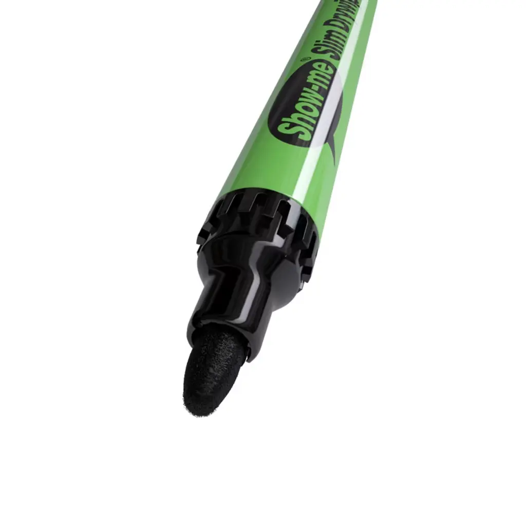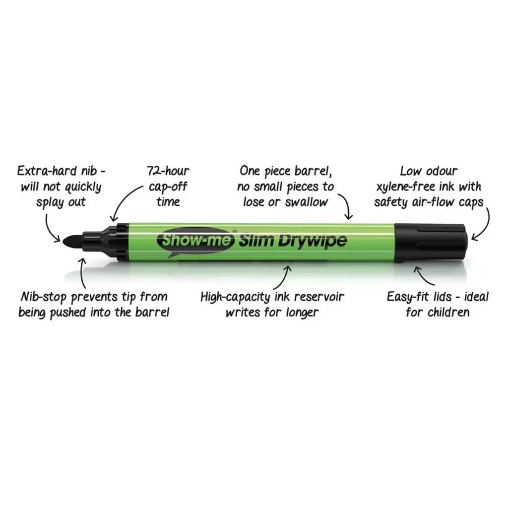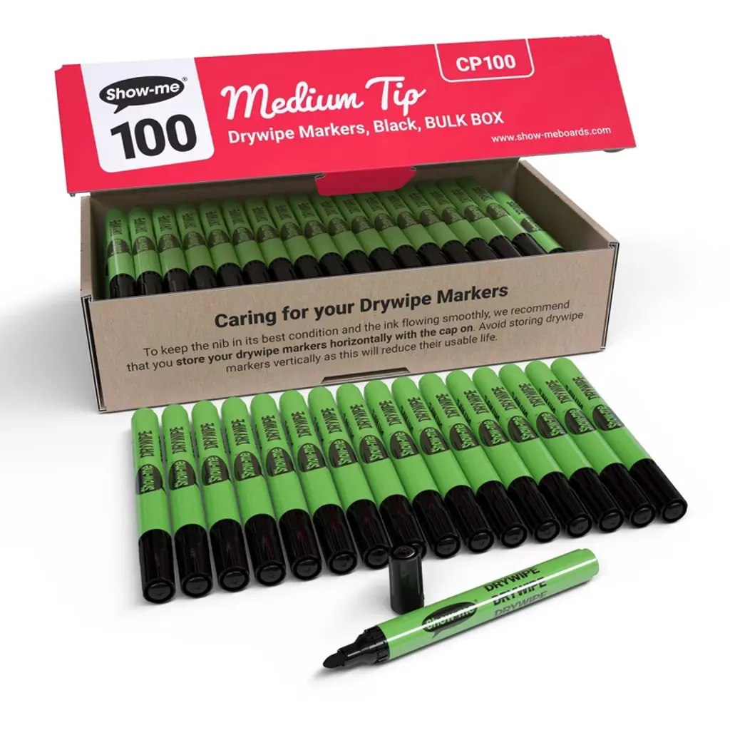 Show-me® Medium Tip Slim Barrel Dry Erase Markers, Black, Classbox of 100 | Show-me dry erase markers are purpose-built for the classroom and trusted by thousands of schools worldwide. Designed with young learners in mind, each marker features a Komfigrip slim barrel that fits comfortably in small hands, making them ideal for frequent use in busy educational environments. The extra-hard nib resists splaying, while a clever nib-stop prevents the tip from being pushed into the barrel, ensuring long-lasting performance. Safety is a top priority—these markers use low-odor, xylene-free ink and are equipped with airflow caps to reduce risk if accidentally swallowed. With a 72-hour cap-off time, they resist drying out even if left uncapped. This pack contains 100 medium tip black dry erase markers, combining durability, safety, and functionality in every stroke.