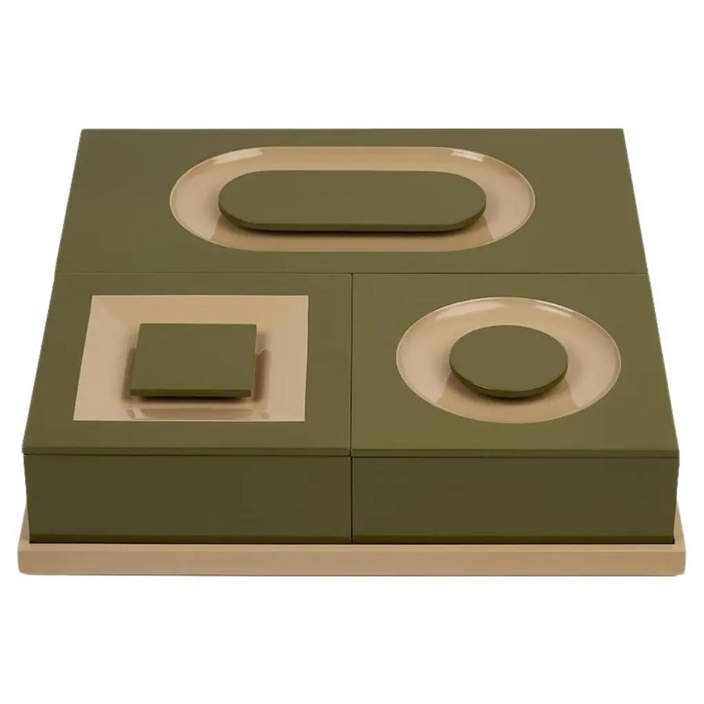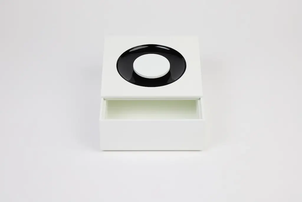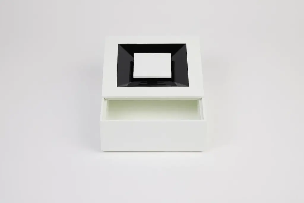 Minimalist, precious, distinctive. The SIGN BOX collection features a tray, two square boxes, and one rectangular box, available as a set or individually. Each box stands out with a seamlessly integrated handle, flush with the lid, revealing a delicate concave grip that invites touch. The interplay of matte and glossy lacquer, meticulously applied by hand in an exceptional workshop, highlights the purity of the lines and the richness of thecolors. Available in five color combinations, SIGN BOX embodies understated elegance and the beauty of detail.Glossy lacquered wood exterior, matte lacquer interior. Boxes available in 5 color combinations: Kerylos & Tangerine, White Sand & Mastic, Khaki & Mastic, Kerylos & Mastic or Milky White & All Black. Trays available in 4 colors: Kerylos, Tangerine, Mastic or All Black.Boxes and trays sold separately or as a set.Dimensions:Square box: 18 x 18 x H7 cmOval box: 18 x 36 x H7 cmTray: 37,5 x 37,5 x H2 cm
