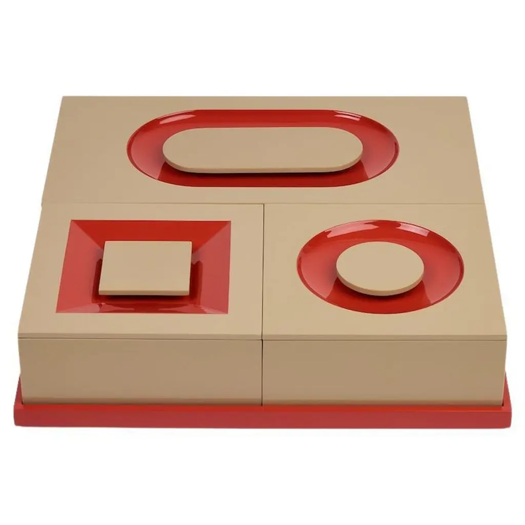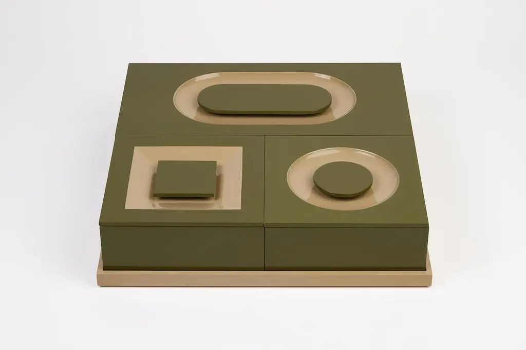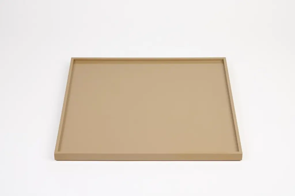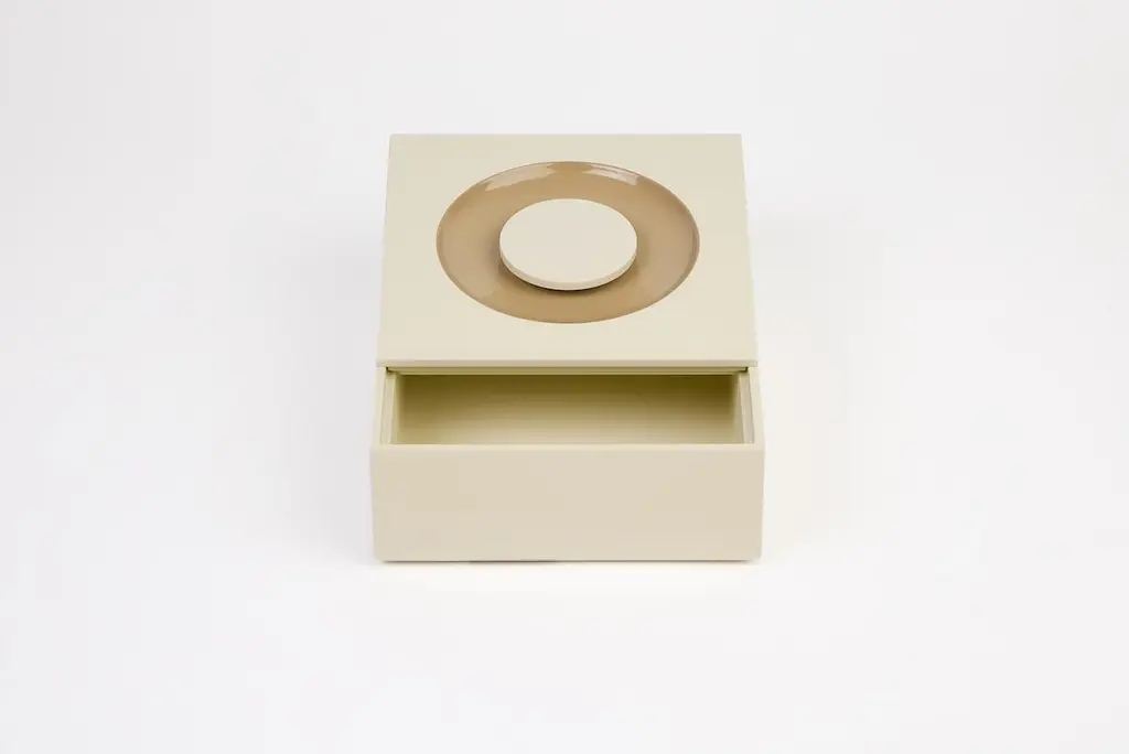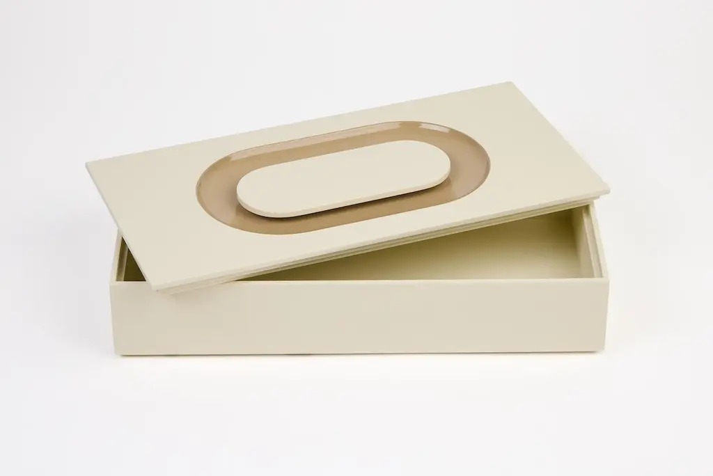 Minimalist, precious, distinctive. The SIGN BOX collection features a tray, two square boxes, and one rectangular box, available as a set or individually. Each box stands out with a seamlessly integrated handle, flush with the lid, revealing a delicate concave grip that invites touch. The interplay of matte and glossy lacquer, meticulously applied by hand in an exceptional workshop, highlights the purity of the lines and the richness of thecolors. Available in five color combinations, SIGN BOX embodies understated elegance and the beauty of detail.Glossy lacquered wood exterior, matte lacquer interior. Boxes available in 5 color combinations: Kerylos & Tangerine, White Sand & Mastic, Khaki & Mastic, Kerylos & Mastic or Milky White & All Black. Trays available in 4 colors: Kerylos, Tangerine, Mastic or All Black.Boxes and trays sold separately or as a set.Dimensions:Square box: 18 x 18 x H7 cmOval box: 18 x 36 x H7 cmTray: 37,5 x 37,5 x H2 cm