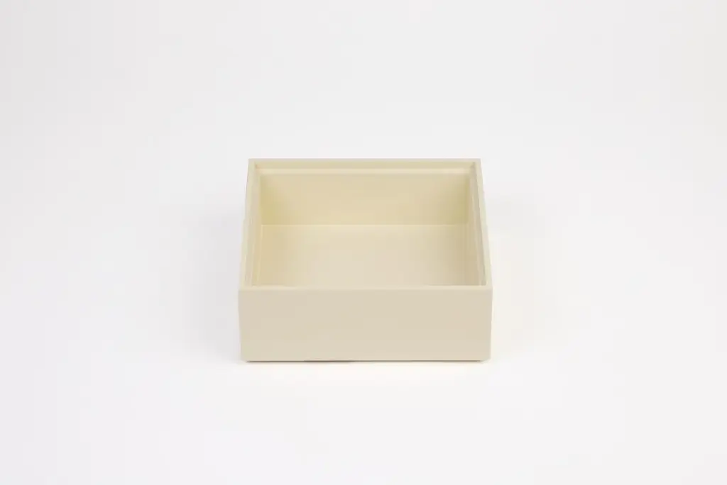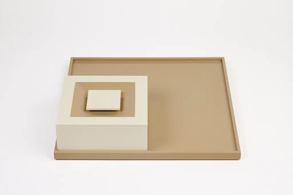 Minimalist, precious, distinctive. The SIGN BOX collection features a tray, two square boxes, and one rectangular box, available as a set or individually. Each box stands out with a seamlessly integrated handle, flush with the lid, revealing a delicate concave grip that invites touch. The interplay of matte and glossy lacquer, meticulously applied by hand in an exceptional workshop, highlights the purity of the lines and the richness of thecolors. Available in five color combinations, SIGN BOX embodies understated elegance and the beauty of detail.Glossy lacquered wood exterior, matte lacquer interior. Boxes available in 5 color combinations: Kerylos & Tangerine, White Sand & Mastic, Khaki & Mastic, Kerylos & Mastic or Milky White & All Black. Trays available in 4 colors: Kerylos, Tangerine, Mastic or All Black.Boxes and trays sold separately or as a set.Dimensions:Square box: 18 x 18 x H7 cmOval box: 18 x 36 x H7 cmTray: 37,5 x 37,5 x H2 cm