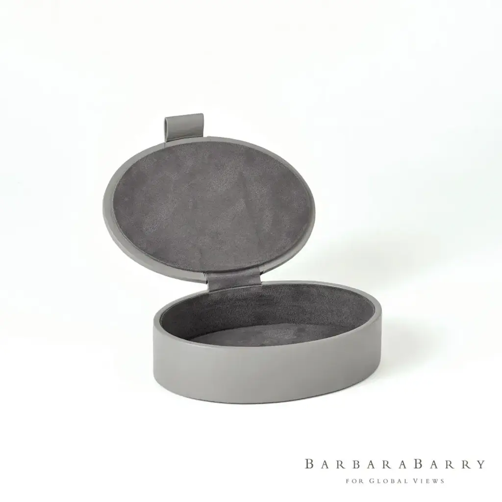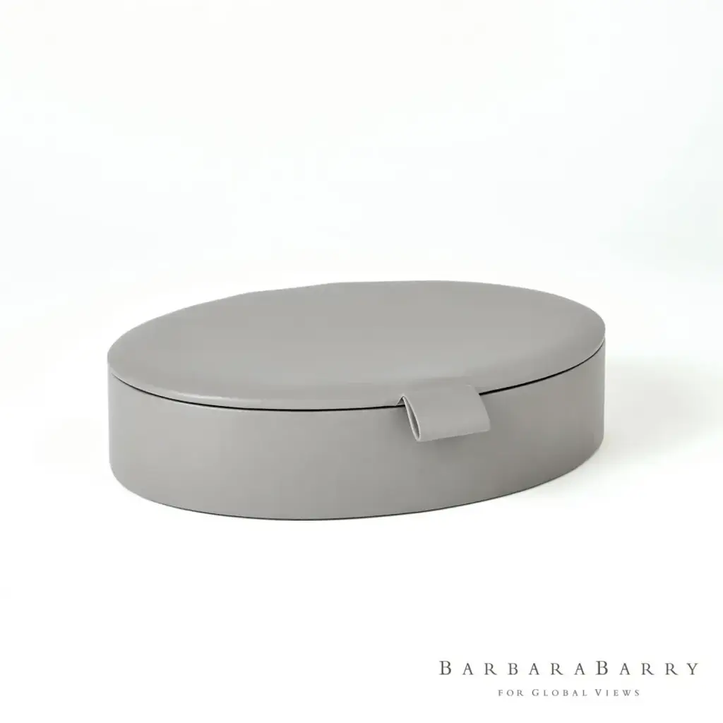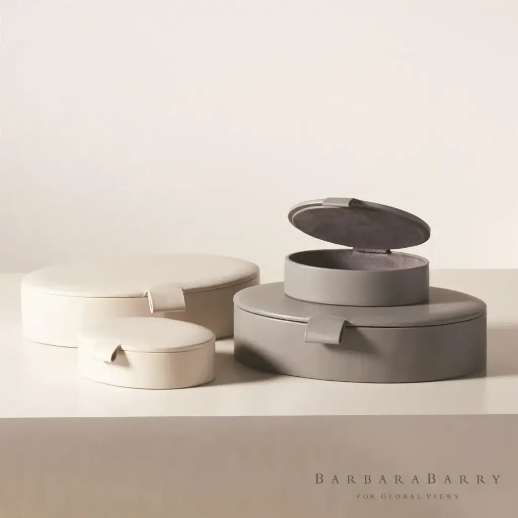 Bring a Barbara Barry classic to your home with the Signature Oval Leather Boxes. These boxes are offered in a soft ivory or rich grey with leather pulls and lined in suede. From a fashion forward perspective, Global Views offers accessories, furniture, statement lighting, and an assortment of rugs and mirrors to add beauty and joy to your home.