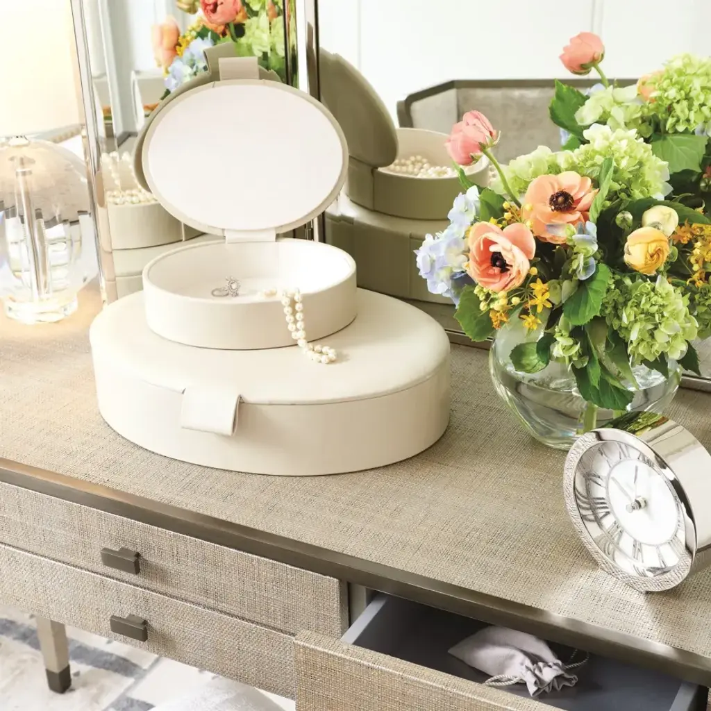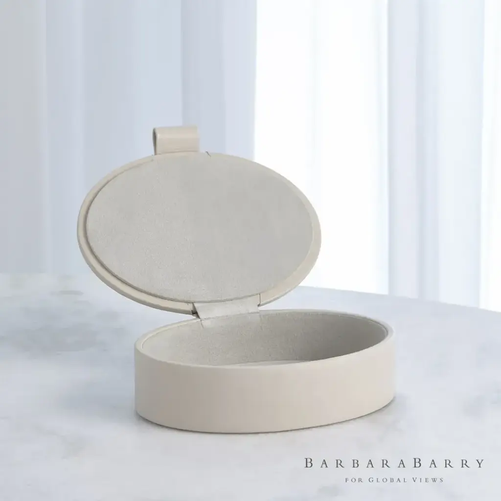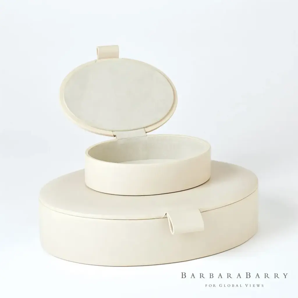 Bring a Barbara Barry classic to your home with the Signature Oval Leather Boxes. These boxes are offered in a soft ivory or rich grey with leather pulls and lined in suede. From a fashion forward perspective, Global Views offers accessories, furniture, statement lighting, and an assortment of rugs and mirrors to add beauty and joy to your home.